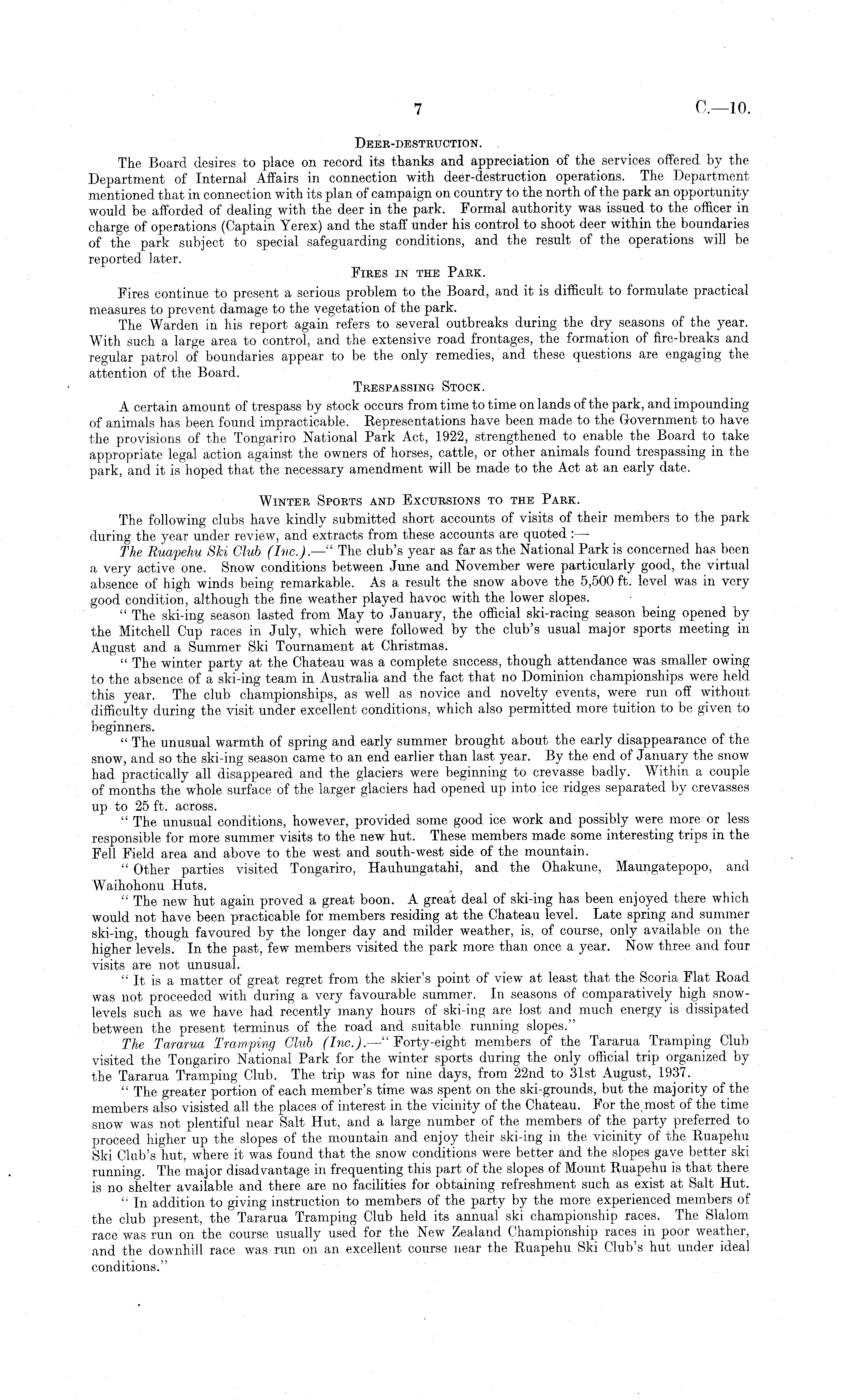 Deer-destruction. The Board desires to place on record its thanks and appreciation of the services offered by the Department of Internal Affairs in connection with deer-destruction operations. The Department mentioned that in connection with its plan of campaign on country to the north of the park an opportunity would be afforded of dealing with the deer in the park. Formal authority was issued to the officer in charge of operations (Captain Yerex) and the staff under his control to shoot deer within the boundaries of the park subject to special safeguarding conditions, and the result of the operations will be reported later. Fires in the Park. Fires continue to present a serious problem to the Board, and it is difficult to formulate practical measures to prevent damage to the vegetation of the park. The Warden in his report again refers to several outbreaks during the dry seasons of the year. With such a large area to control, and the extensive road frontages, the formation of fire-breaks and regular patrol of boundaries appear to be the only remedies, and these questions are engaging the attention of the Board. Trespassing Stock. A certain amount of trespass by stock occurs from time to time on lands of the park, and impounding of animals has been found impracticable. Representations have been made to the Government to have the provisions of the Tongariro National Park Act, 1922, strengthened to enable the Board to take appropriate legal action against the owners of horses, cattle, or other animals found trespassing in the park, and it is hoped that the necessary amendment will be made to the Act at an early date. Winter Sports and Excursions to the Park. The following clubs have kindly submitted short accounts of visits of their members to the park during the year under review, and extracts from these accounts are quoted : — The Ruapehu Ski Club (Inc.) The club's year as far as the National Park is concerned has been a very active one. Snow conditions between June and November were particularly good, the virtual absence of high winds being remarkable. As a result the snow above the 5,500 ft. level was in very good condition, although the fine weather played havoc with the lower slopes. " The ski-ing season lasted from May to January, the official ski-racing season being opened by the Mitchell Cup races in July, which were followed by the club's usual major sports meeting in August and a Summer Ski Tournament at Christmas. " The winter party at the Chateau was a complete success, though attendance was smaller owing to the absence of a ski-ing team in Australia and the fact that no Dominion championships were held this year. The club championships, as well as novice and novelty events, were run off without difficulty during the visit under excellent conditions, which also permitted more tuition to be given to beginners. " The unusual warmth of spring and early summer brought about the early disappearance of the snow, and so the ski-ing season came to an end earlier than last year. By the end of January the snow had practically all disappeared and the glaciers were beginning to crevasse badly. Within a couple of months the whole surface of the larger glaciers had opened up into ice ridges separated by crevasses up to 25 ft. across. " The unusual conditions, however, provided some good ice work and possibly were more or less responsible for more summer visits to the new hut. These members made some interesting trips in the Fell Field area and above to the west and south-west side of the mountain. " Other parties visited Tongariro, Hauhungatahi, and the Ohakune, Maungatepopo, and Waihohonu Huts. " The new hut again proved a great boon. A great deal of ski-ing has been enjoyed there which would not have been practicable for members residing at the Chateau level. Late spring and summer ski-ing, though favoured by the longer day and milder weather, is, of course, only available on the higher levels. In the past, few members visited the park more than once a year. Now three and four visits are not unusual. " It is a matter of great regret from the skier's point of view at least that the Scoria Flat Road was not proceeded with during a very favourable summer. In seasons of comparatively high snowlevels such as we have had recently many hours of ski-ing are lost and much energy is dissipated between the present terminus of the road and suitable running slopes." The Tararua Tramping Club (Inc.). —" Forty-eight members of the Tararua Tramping Club visited the Tongariro National Park for the winter sports during the only official trip organized by the Tararua Tramping Club. The trip was for nine days, from 22nd to 31st August, 1937. " The greater portion of each member's time was spent on the ski-grounds, but the majority of the members also visisted all the places of interest in the vicinity of the Chateau. For the most of the time snow was not plentiful near Salt Hut, and a large number of the members of the party preferred to proceed higher up the slopes of the mountain and enjoy their ski-ing in the vicinity of the Ruapehu Ski Club's hut, where it was found that the snow conditions were better and the slopes gave better ski running. The major disadvantage in frequenting this part of the slopes of Mount Ruapehu is that there is no shelter available and there are no facilities for obtaining refreshment such as exist at Salt Hut. '' In addition to giving instruction to members of the party by the more experienced members of the club present, the Tararua Tramping Club held its annual ski championship races. The Slalom race was run on the course usually used for the New Zealand Championship races in poor weather, and the downhill race was run on an excellent course near the Ruapehu Ski Club's hut under ideal conditions."