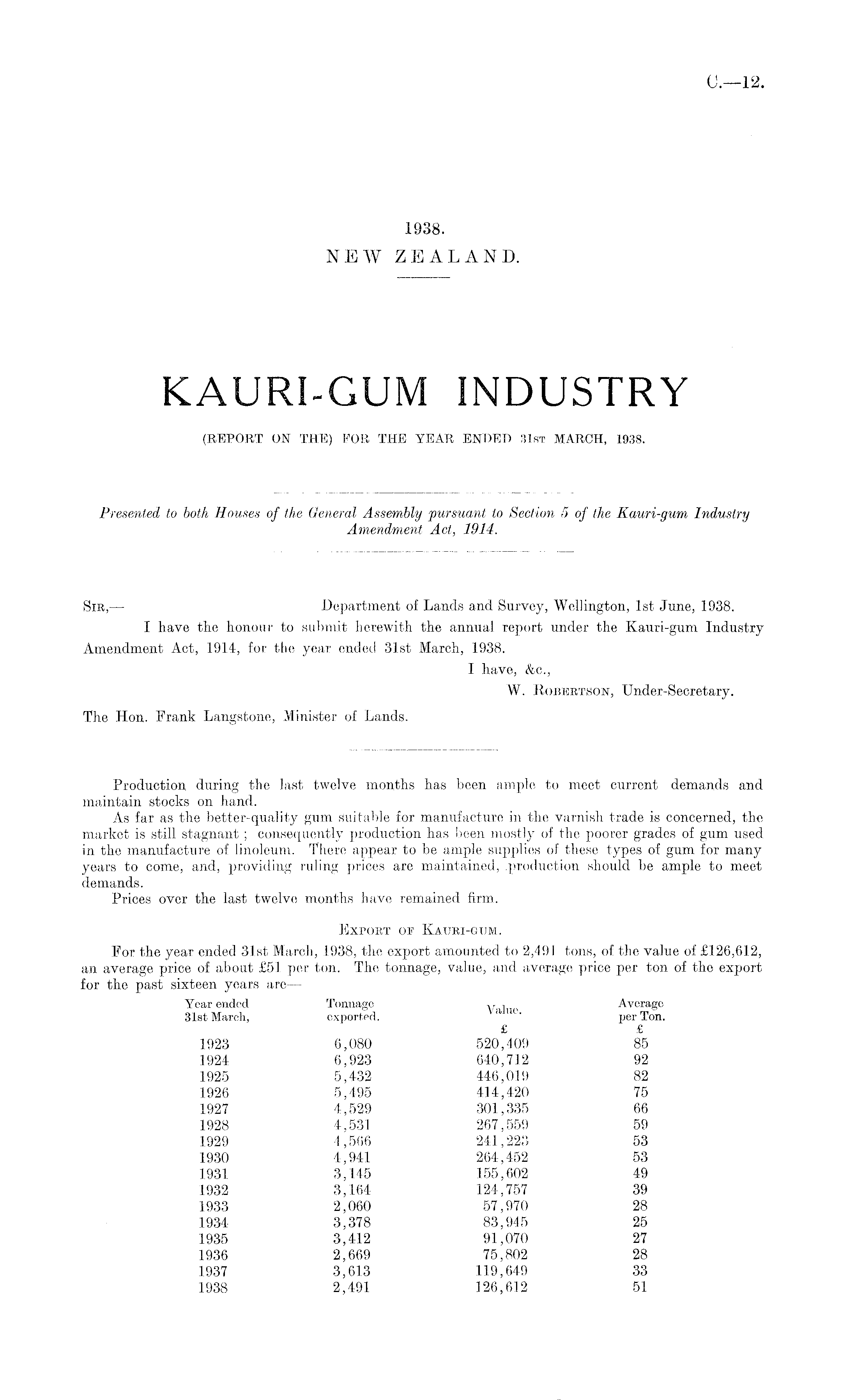 Sir, — Department of Lands and Survey, Wellington, Ist June, 1938. I have the honour to submit herewith the annual report under the Kauri-gum Industry Amendment Act, 1914, for the year ended 31st March, 1938. I have, &c., W. Robertson, Under-Secretary. The Hon. Prank Langstone, Minister of Lands.