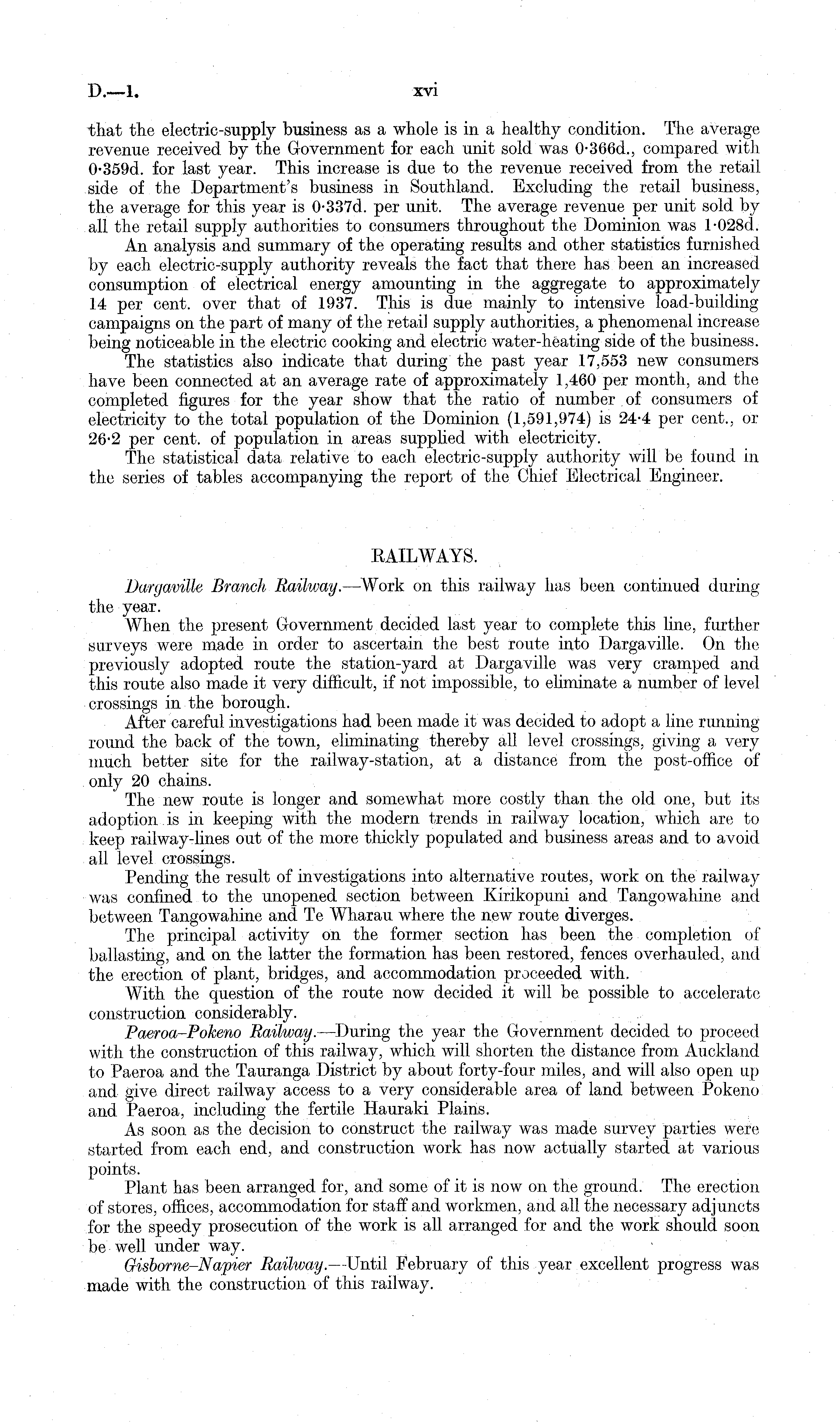 that the electric-supply business as a whole is in a healthy condition. The average revenue received by the Government for each unit sold was 0-366 d., compared with 0-359 d. lor last year. This increase is due to the revenue received from the retail side of the Department's business in Southland. Excluding the retail business, the average for this year is 0-337 d. per unit. The average revenue per unit sold by all the retail supply authorities to consumers throughout the Dominion was l-028d. An analysis and summary of the operating results and other statistics furnished by each electric-supply authority reveals the fact that there has been an increased consumption of electrical energy amounting in the aggregate to approximately 14 per cent, over that of 1937. This is due mainly to intensive load-building campaigns on the part of many of the retail supply authorities, a phenomenal increase being noticeable in the electric cooking and electric water-heating side of the business. The statistics also indicate that during the past year 17,553 new consumers have been connected at an average rate of approximately 1,460 per month, and the completed figures for the year show that the ratio of number of consumers of electricity to the total population of the Dominion (1,591,974) is 24-4 per cent., or 26-2 per cent, of population in areas supplied with electricity. The statistical data relative to each electric-supply authority will be found in the series of tables accompanying the report of the Chief Electrical Engineer. RAILWAYS. Dargaville Branch Railway. —Work on this railway has been continued during the year. When the present Government decided last year to complete this line, further surveys were made in order to ascertain the best route into Dargaville. On the previously adopted route the station-yard at Dargaville was very cramped and this route also made it very difficult, if not impossible, to eliminate a number of level crossings in the borough. After careful investigations had been made it was decided to adopt a line running round the back of the town, eliminating thereby all level crossings, giving a very much better site for the railway-station, at a distance from the post-office of only 20 chains. The new route is longer and somewhat more costly than the old one, but its adoption is in keeping with the modern trends in railway location, which are to keep railway-lines out of the more thickly populated and business areas and to avoid all level crossings. Pending the result of investigations into alternative routes, work on the railway was confined to the unopened section between Kirikopuni and Tangowahine and between Tangowahine and Te Wharau where the new route diverges. The principal activity on the former section has been the completion of ballasting, and on the latter the formation has been restored, fences overhauled, and the erection of plant, bridges, and accommodation proceeded with. With the question of the route now decided it will be possible to accelerate construction considerably. Paeroa-Pokeno Railway. —During the year the Government decided to proceed with the construction of this railway, which will shorten the distance from Auckland to Paeroa and the Tauranga District by about forty-four miles, and will also open up and give direct railway access to a very considerable area of land between Pokeno and Paeroa, including the fertile Hauraki Plains. As soon as the decision to construct the railway was made survey parties were started from each end, and construction work has now actually started at various points. Plant has been arranged for, and some of it is now on the ground. The erection of stores, offices, accommodation for staff and workmen, and all the necessary adjuncts for the speedy prosecution of the work is all arranged for and the work should soon be well under way. Gisborne-Napier Railway. —Until February of this year excellent progress was made with the construction of this railway.