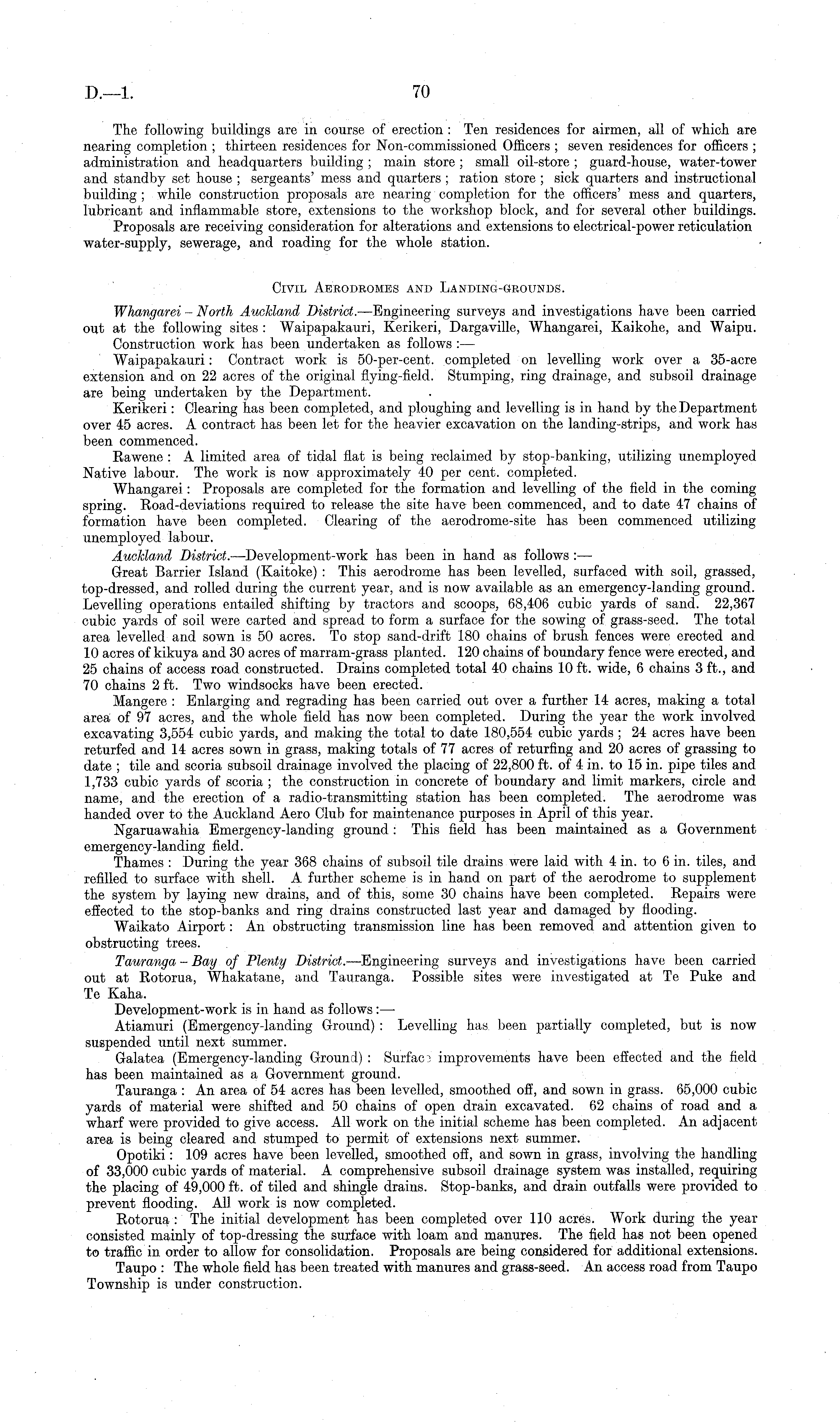 The following buildings are in course of erection : Ten residences for airmen, all of which are nearing completion ; thirteen residences for Non-commissioned Officers ; seven residences for officers ; administration and headquarters building ; main store ; small oil-store ; guard-house, water-tower and standby set house ; sergeants' mess and quarters ; ration store ; sick quarters and instructional building ; while construction proposals are nearing completion for the officers' mess and quarters, lubricant and inflammable store, extensions to the workshop block, and for several other buildings. Proposals are receiving consideration for alterations and extensions to electrical-power reticulation water-supply, sewerage, and roading for the whole station. Civil Aerodromes and Landing-grounds. Whangarei - North Auckland District.—Engineering surveys and investigations have been carried out at the following sites : Waipapakauri, Kerikeri, Dargaville, Whangarei, Kaikohe, and Waipu. Construction work has been undertaken as follows :— Waipapakauri: Contract work is 50-per-cent. completed on levelling work over a 35-acre extension and on 22 acres of the original flying-field. Stumping, ring drainage, and subsoil drainage are being undertaken by the Department. Kerikeri: Clearing has been completed, and ploughing and levelling is in hand by the Department over 45 acres. A contract has been let for the heavier excavation on the landing-strips, and work has been commenced. Rawene : A limited area of tidal flat is being reclaimed by stop-banking, utilizing unemployed Native labour. The work is now approximately 40 per cent, completed. Whangarei: Proposals are completed for the formation and levelling of the field in the coming spring. Road-deviations required to release the site have been commenced, and to date 47 chains of formation have been completed. Clearing of the aerodrome-site has been commenced utilizing unemployed labour. Auckland District.—Development-work has been in hand as follows : — Great Barrier Island (Kaitoke) : This aerodrome has been levelled, surfaced with soil, grassed, top-dressed, and rolled during the current year, and is now available as an emergency-landing ground. Levelling operations entailed shifting by tractors and scoops, 68,406 cubic yards of sand. 22,367 cubic yards of soil were carted and spread to form a surface for the sowing of grass-seed. The total area levelled and sown is 50 acres. To stop sand-drift 180 chains of brush fences were erected and 10 acres of kikuya and 30 acres of marram-grass planted. 120 chains of boundary fence were erected, and 25 chains of access road constructed. Drains completed total 40 chains 10 ft. wide, 6 chains 3 ft., and 70 chains 2 ft. Two windsocks have been erected. Mangere : Enlarging and regrading has been carried out over a further 14 acres, making a total area of 97 acres, and the whole field has now been completed. During the year the work involved excavating 3,554 cubic yards, and making the total to date 180,554 cubic yards ; 24 acres have been returfed and 14 acres sown in grass, making totals of 77 acres of returfing and 20 acres of grassing to date ; tile and scoria subsoil drainage involved the placing of 22,800 ft. of 4 in. to 15 in. pipe tiles and 1,733 cubic yards of scoria ; the construction in concrete of boundary and limit markers, circle and name, and the erection of a radio-transmitting station has been completed. The aerodrome was handed over to the Auckland Aero Club for maintenance purposes in April of this year. Ngaruawahia Emergency-landing ground : This field has been maintained as a Government emergency-landing field. Thames : During the year 368 chains of subsoil tile drains were laid with 4 in. to 6 in. tiles, and refilled to surface with shell. A further scheme is in hand on part of the aerodrome to supplement the system by laying new drains, and of this, some 30 chains have been completed. Repairs were effected to the stop-banks and ring drains constructed last year and damaged by flooding. Waikato Airport: An obstructing transmission line has been removed and attention given to obstructing trees. Tauranga - Bay of Plenty District.—Engineering surveys and investigations have been carried out at Rotorua, Whakatane, and Tauranga. Possible sites were investigated at Te Puke and Te Kaha. Development-work is in hand as follows : —- Atiamuri (Emergency-landing Ground) : Levelling has been partially completed, but is now suspended until next summer. Galatea (Emergency-landing Ground) : Surface improvements have been effected and the field has been maintained as a Government ground. Tauranga : An area of 54 acres has been levelled, smoothed off, and sown in grass. 65,000 cubic yards of material were shifted and 50 chains of open drain excavated. 62 chains of road and a wharf were provided to give access. All work on the initial scheme has been completed. An adjacent area is being cleared and stumped to permit of extensions next summer. Opotiki: 109 acres have been levelled, smoothed off, and sown in grass, involving the handling of 33,000 cubic yards of material. A comprehensive subsoil drainage system was installed, requiring the placing of 49,000 ft. of tiled and shingle drains. Stop-banks, and drain outfalls were provided to prevent flooding. All work is now completed. Rotorua : The initial development has been completed over 110 acres. Work during the year consisted mainly of top-dressing the surface with loam and manures. The field has not been opened to traffic in order to allow for consolidation. Proposals are being considered for additional extensions. Taupo : The whole field has been treated with manures and grass-seed. An access road from Taupo Township is under construction.