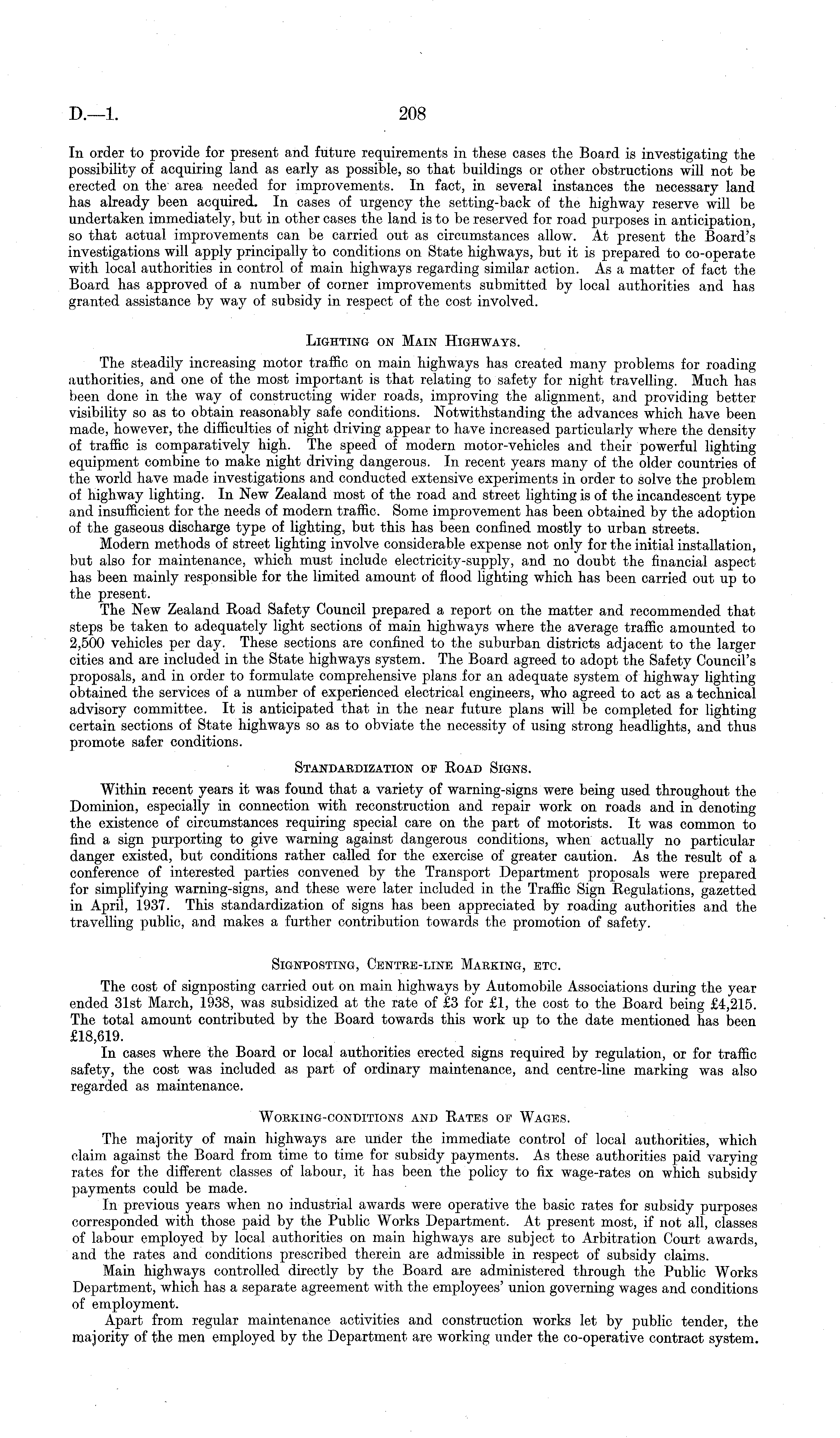 In order to provide for present and future requirements in these cases the Board is investigating the possibility of acquiring land as early as possible, so that buildings or other obstructions will not be erected on the area needed for improvements. In fact, in several instances the necessary land has already been acquired. In cases of urgency the setting-back of the highway reserve will be undertaken immediately, but in other cases the land is to be reserved for road purposes in anticipation, so that actual improvements can be carried out as circumstances allow. At present the Board's investigations will apply principally to conditions on State highways, but it is prepared to co-operate with local authorities in control of main highways regarding similar action. As a matter of fact the Board has approved of a number of corner improvements submitted by local authorities and has granted assistance by way of subsidy in respect of the cost involved. Lighting on Main Highways. The steadily increasing motor traffic on main highways has created many problems for roading authorities, and one of the most important is that relating to safety for night travelling. Much has been done in the way of constructing wider roads, improving the alignment, and providing better visibility so as to obtain reasonably safe conditions. Notwithstanding the advances which have been made, however, the difficulties of night driving appear to have increased particularly where the density of traffic is comparatively high. The speed of modern motor-vehicles and their powerful lighting equipment combine to make night driving dangerous. In recent years many of the older countries of the world have made investigations and conducted extensive experiments in order to solve the problem of highway lighting. In New Zealand most of the road and street lighting is of the incandescent type and insufficient for the needs of modern traffic. Some improvement has been obtained by the adoption of the gaseous discharge type of lighting, but this has been confined mostly to urban streets. Modern methods of street lighting involve considerable expense not only for the initial installation, but also for maintenance, which must include electricity-supply, and no doubt the financial aspect has been mainly responsible for the limited amount of flood lighting which has been carried out up to the present. The New Zealand Road Safety Council prepared a report on the matter and recommended that steps be taken to adequately light sections of main highways where the average traffic amounted to 2,500 vehicles per day. These sections are confined to the suburban districts adjacent to the larger cities and are included in the State highways system. The Board agreed to adopt the Safety Council's proposals, and in order to formulate comprehensive plans for an adequate system of highway lighting obtained the services of a number of experienced electrical engineers, who agreed to act as a technical advisory committee. It is anticipated that in the near future plans will be completed for lighting certain sections of State highways so as to obviate the necessity of using strong headlights, and thus promote safer conditions. Standardization of Road Signs. Within recent years it was found that a variety of warning-signs were being used throughout the Dominion, especially in connection with reconstruction and repair work on roads and in denoting the existence of circumstances requiring special care on the part of motorists. It was common to find a sign purporting to give warning against dangerous conditions, when actually no particular danger existed, but conditions rather called for the exercise of greater caution. As the result of a conference of interested parties convened by the Transport Department proposals were prepared for simplifying warning-signs, and these were later included in the Traffic Sign Regulations, gazetted in April, 1937. This standardization of signs has been appreciated by roading authorities and the travelling public, and makes a further contribution towards the promotion of safety. Signposting, Centre-line Marking, etc. The cost of signposting carried out on main highways by Automobile Associations during the year ended 31st March, 1938, was subsidized at the rate of £3 for £1, the cost to the Board being £4,215. The total amount contributed by the Board towards this work up to the date mentioned has been £18,619. In cases where the Board or local authorities erected signs required by regulation, or for traffic safety, the cost was included as part of ordinary maintenance, and centre-line marking was also regarded as maintenance. Working-conditions and Rates of Wages. The majority of main highways are under the immediate control of local authorities, which claim against the Board from time to time for subsidy payments. As these authorities paid varying rates for the different classes of labour, it has been the policy to fix wage-rates on which subsidy payments could be made. In previous years when no industrial awards were operative the basic rates for subsidy purposes corresponded with those paid by the Public Works Department. At present most, if not all, classes of labour employed by local authorities on main highways are subject to Arbitration Court awards, and the rates and conditions prescribed therein are admissible in respect of subsidy claims. Main highways controlled directly by the Board are administered through the Public Works Department, which has a separate agreement with the employees' union governing wages and conditions of employment. Apart from regular maintenance activities and construction works let by public tender, the majority of the men employed by the Department are working under the co-operative contract system.