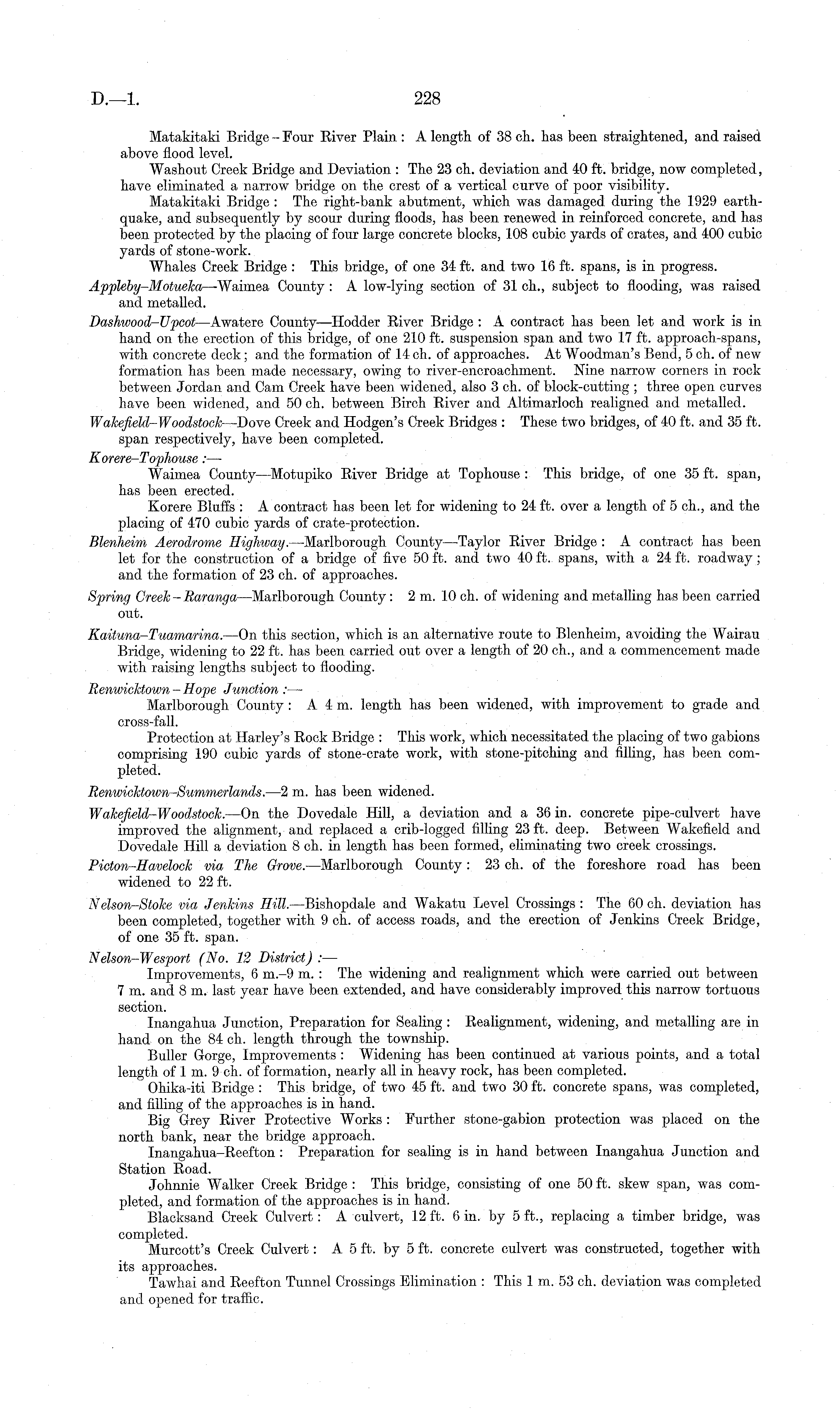 Matakitaki Bridge - Four River Plain : A length of 38 ch. lias been straightened, and raised above flood level. Washout Creek Bridge and Deviation : The 23 oh. deviation and 40 ft. bridge, now completed, have eliminated a narrow bridge on the crest of a vertical curve of poor visibility. Matakitaki Bridge : The right-bank abutment, which was damaged during the 1929 earthquake, and subsequently by scour during floods, has been renewed in reinforced concrete, and has been protected by the placing of four large concrete blocks, 108 cubic yards of crates, and 400 cubic yards of stone-work. Whales Creek Bridge : This bridge, of one 34 ft. and two 16 ft. spans, is in progress. Appleby-Motueka—Waimea, County : A low-lying section of 31 ch., subject to flooding, was raised and metalled. Dashwood-Upcot—Awatere County—Hodder River Bridge : A contract has been let and work is in hand on the erection of this bridge, of one 210 ft. suspension span and two 17 ft. approach-spans, with concrete deck; and the formation of 14 ch. of approaches. At Woodman's Bend, 5 ch. of new formation has been made necessary, owing to river-encroachment. Nine narrow corners in rock between Jordan and Cam Creek have been widened, also 3 ch. of block-cutting ; three open curves have been widened, and 50 ch. between Birch River and Altimarloch realigned and metalled. WaJcefield~Woodstock —Dove Creek and Hodgen's Creek Bridges : These two bridges, of 40 ft. and 35 ft. span respectively, have been completed. Korere-T'ophouse : — Waimea County —Motupiko River Bridge at Tophouse : This bridge, of one 35 ft. span, has been erected. Korere Bluffs : A contract has been let for widening to 24 ft. over a length of 5 ell., and the placing of 470 cubic yards of crate-protection. Blenheim Aerodrome Highway.—Marlborough County—Taylor River Bridge : A contract has been let for the construction of a bridge of five 50 ft. and two 40 ft. spans, with a 24 ft. roadway; and the formation of 23 ch. of approaches. Spring Creek -Raranga—Marlborough County : 2m. 10 ch. of widening and metalling has been carried out. Kaituna-Tuamarina. —On this section, which is an alternative route to Blenheim, avoiding the Wairau Bridge, widening to 22 ft. has been carried out over a length of 20 ch., and a commencement made with raising lengths subject to flooding. Renwicktown-Hope Junction: — Marlborough County : A 4m. length has been widened, with improvement to grade and cross-fall. Protection at Barley's Rock Bridge : This work, which necessitated the placing of two gabions comprising 190 cubic yards of stone-crate work, with stone-pitching and filling, has been completed. Renwicktown-Summerlands. —2 m. has been widened. Wakefield-Woodstock. —On the Dovedale Hill, a deviation and a 36 in. concrete pipe-culvert have improved the alignment, and replaced a crib-logged filling 23 ft. deep. Between Wakefield and Dovedale Hill a deviation 8 ch. in length has been formed, eliminating two creek crossings. Picton-Havelock via The Grove. —Marlborough County: 23 ch. of the foreshore road has been widened to 22 ft. Nelson-Stoke via Jenkins Hill. —Bishopdale and Wakatu Level Crossings : The 60 ch. deviation has been completed, together with 9 ch. of access roads, and the erection of Jenkins Creek Bridge, of one 35 ft. span. Nelson-Wesport (No. 12 District) : —• Improvements, 6 m.-9 m. : The widening and realignment which were carried out between 7 m. and 8 m. last year have been extended, and have considerably improved this narrow tortuous section. Inangahua Junction, Preparation for Sealing : Realignment, widening, and metalling are in hand on the 84 ch. length through the township. Buller Gorge, Improvements : Widening has been continued at various points, and a total length of 1 m. 9 ch. of formation, nearly all in heavy rock, has been completed. Ohika-iti Bridge : This bridge, of two 45 ft. and two 30 ft. concrete spans, was completed, and filling of the approaches is in hand. Big Grey River Protective Works : Further stone-gabion protection was placed on the north bank, near the bridge approach. Inangahua-Reefton : Preparation for sealing is in hand between Inangahua Junction and Station Road. Johnnie Walker Creek Bridge : This bridge, consisting of one 50 ft. skew span, was completed, and formation of the approaches is in hand. Blacksand Creek Culvert: A culvert, 12 ft. 6 in. by 5 ft., replacing a timber bridge, was completed. Murcott's Creek Culvert: A 5 ft. by 5 ft. concrete culvert was constructed, together with its approaches. Tawhai and Reefton Tunnel Crossings Elimination : This 1 m. 53 ch. deviation was completed and opened for traffic.
