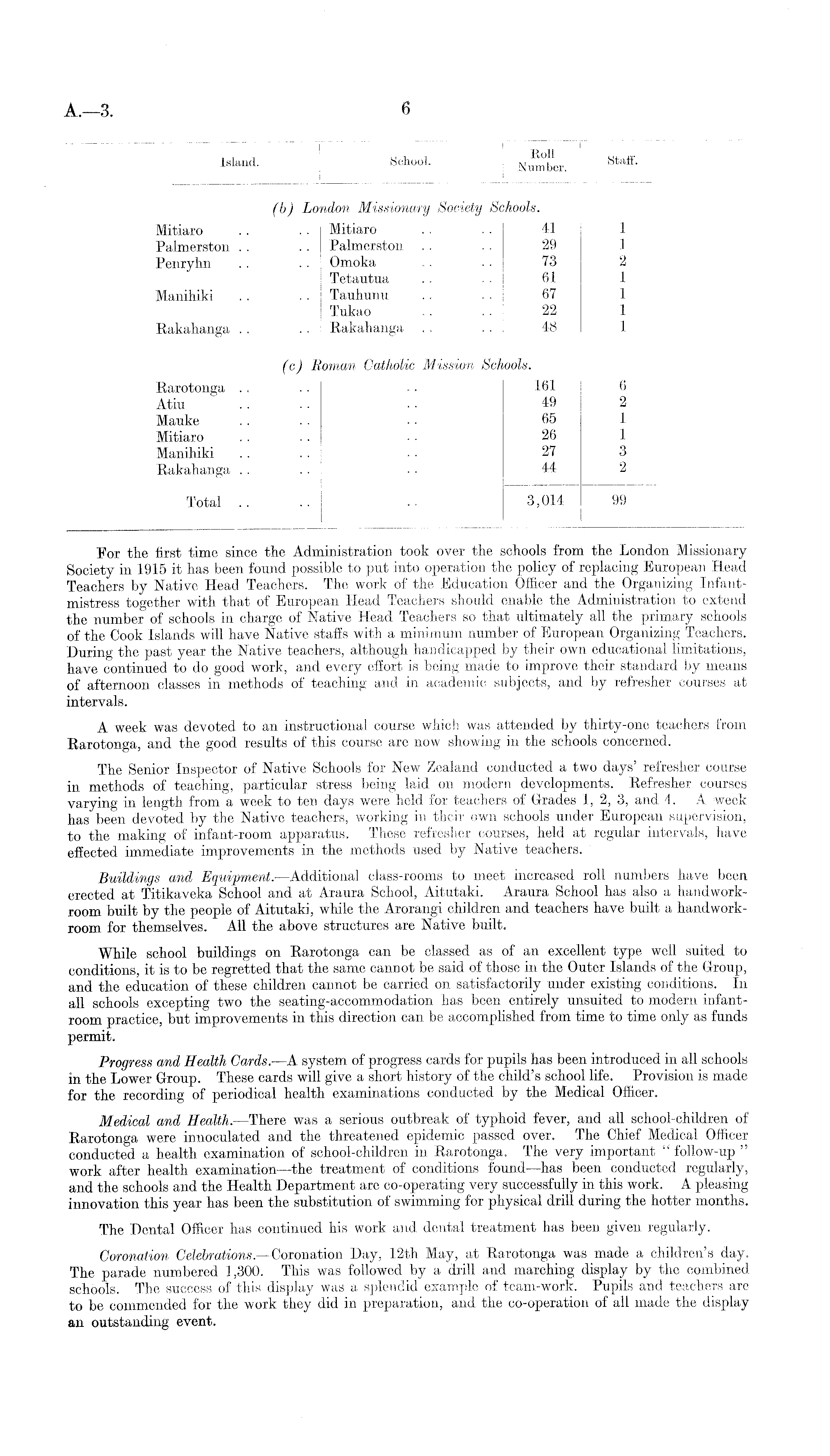 For the first time since the Administration took over the schools from the London Missionary Society in 1915 it has been found possible to put into operation the policy of replacing European Head Teachers by Native Head Teachers. The work of the Education Officer and the Organizing Infantmistress together with that of European Head Teachers should enable the Administration to extend the number of schools in charge of Native Head Teachers so that ultimately all the primary schools of the Cook Islands will have Native staffs with a minimum number of European Organizing Teachers. During the past year the Native teachers, although handicapped by their own educational limitations, have continued to do good work, and every effort is being made to improve their standard by means of afternoon classes in methods of teaching and in academic subjects, and by refresher courses at intervals. A week was devoted to an instructional course which was attended by thirty-one teachers from Rarotonga, and the good results of this course are now showing in the schools concerned. The Senior Inspector of Native Schools for New Zealand conducted a two days' refresher course in methods of teaching, particular stress being laid on modern developments. Refresher courses varying in length from a week to ten days were held for teachers of Grades 1, 2, 3, and 4. A week has been devoted by the Native teachers, working in their own schools under European supervision, to the making of infant-room apparatus. These refresher courses, held at regular intervals, have effected immediate improvements in the methods used by Native teachers. Buildings and Equipment. —Additional class-rooms to meet increased roll numbers have been erected at Titikaveka School and at Araura School, Aitutaki. Araura School has also a handworkroom built by the people of Aitutaki, while the Arorangi children and teachers have built a handworkroom for themselves. All the above structures are Native built. While school buildings on Rarotonga can be classed as of an excellent type well suited to conditions, it is to be regretted that the same cannot be said of those in the Outer Islands of the Group, and the education of these children cannot be carried on satisfactorily under existing conditions. In all schools excepting two the seating-accommodation has been entirely unsuited to modern infantroom practice, but improvements in this direction can be accomplished from time to time only as funds permit. Progress and Health Cards. —A system of progress cards for pupils has been introduced in all schools in the Lower Group. These cards will give a short history of the child's school life. Provision is made for the recording of periodical health examinations conducted by the Medical Officer. Medical and Health. —There was a serious outbreak of typhoid fever, and all school-children of Rarotonga were innoculated and the threatened epidemic passed over. The Chief Medical Officer conducted a health examination of school-children in Rarotonga. The very important " follow-up " work after health examination —the treatment of conditions found —has been conducted regularly, and the schools and the Health Department are co-operating very successfully in this work. A pleasing innovation this year has been the substitution of swimming for physical drill during the hotter months. The Dental Officer has continued his work and dental treatment has been given regularly. Coronation Celebrations. —Coronation Day, 12th May, at Rarotonga was made a children's day. The parade numbered 1,300. This was followed by a drill and marching display by the combined schools. The success of this display was a splendid example of team-work. Pupils and teachers are to be commended for the work they did in preparation, and the co-operation of all made the display an outstanding event.