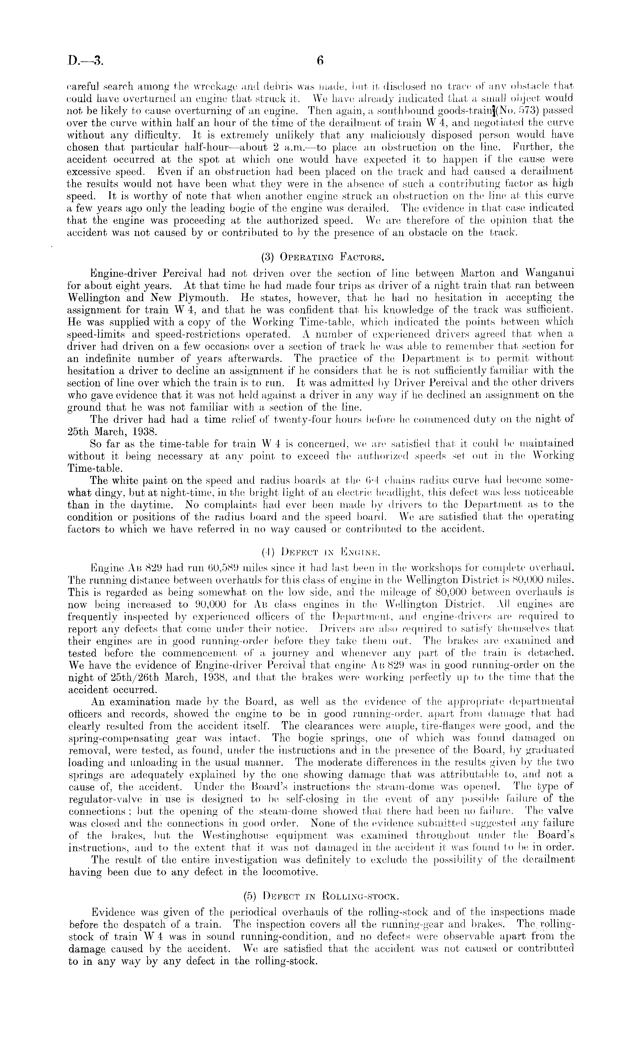 careful search among the wreckage and debris was made, but it disclosed no trace of any obstacle that could have overturned an engine that struck it. We have already indicated that a small object would not be likely to cause overturning of an engine. Then again, a southbound goods-trainJ(No. 573) passed over the curve within half an hour of the time of the derailment of train W 4, and negotiated the curve without any difficulty. It is extremely unlikely that any maliciously disposed person would have chosen that particular half-hour—about 2 a.m. —to place an obstruction on the line. Further, the accident occurred at the spot at which one would have expected it to happen if the cause were excessive speed. Even if an obstruction had been placed on the track and had caused a derailment the results would not have been what they were in the absence of such a contributing factor as high speed. It is worthy of note that when another engine struck an obstruction on the line at this curve a few years ago only the leading bogie of the engine was derailed. The evidence in that case indicated that the engine was proceeding at the authorized speed. We are therefore of the opinion that the accident was not caused by or contributed to by the presence of an obstacle on the track. (3) Operating Factors. Engine-driver Percival had not driven over the section of line between Marton and Wanganui for about eight years. At that time he had made four trips as driver of a night train that ran between Wellington and New Plymouth. He states, however, that he had no hesitation in accepting the assignment for train W 4, and that he was confident that his knowledge of the track was sufficient. He was supplied with a copy of the Working Time-table, which indicated the points between which speed-limits and speed-restrictions operated. A number of experienced drivers agreed that when a driver had driven on a few occasions over a section of track he was able to remember that section for an indefinite number of years afterwards. The practice of the Department is to permit without hesitation a driver to decline an assignment if he considers that he is not sufficiently familiar with the section of line over which the train is to run. It was admitted by Driver Percival and the other drivers who gave evidence that it was not held against a driver in any way if he declined an assignment on the ground that he was not familiar with a section of the line. The driver had had a time relief of twenty-four hours before he commenced duty on the night of 25th March, 1938. So far as the time-table for train W 4 is concerned, we are satisfied that it could be maintained without it being necessary at any point to exceed the authorized speeds set out in the Working Time-table. The white paint on the speed and radius boards at the 64 chains radius curve had become somewhat dingy, but at night-time, in the bright light of an electric headlight, this defect was less noticeable than in the daytime. No complaints had ever been made by drivers to the Department as to the condition or positions of the radius board and the speed board. We are satisfied that the operating factors to which we have referred in no way caused or contributed to the accident. (4) Defect in Engine. Engine Ab 829 had run 60,589 miles since it had last been in the workshops for complete overhaul. The running distance between overhauls for this class of engine in the Wellington District is 80,000 miles. This is regarded as being somewhat on the low side, and the mileage of 80,000 between overhauls is now being increased to 90,000 for Ab class engines in the Wellington District. All engines are frequently inspected by experienced officers of the Department, and engine-drivers are required to report any defects that come under their notice. Drivers are also required to satisfy themselves that their engines are in good running-order before they take them out. The brakes are examined and tested before the commencement of a journey and whenever any part of the train is detached. We have the evidence of Engine-driver Percival that engine Ab 829 was in good running-order on the night of 25th/26th March, 1938, and that the brakes were working perfectly up to the time that the accident occurred. An examination made by the Board, as well as the evidence of the appropriate departmental officers and records, showed the engine to be in good running-order, apart from damage that had clearly resulted from the accident itself. The clearances were ample, tire-flanges were good, and the spring-compensating gear was intact. The bogie springs, one of which was found damaged on removal, were tested, as found, under the instructions and in the presence of the Board, by graduated loading and unloading in the usual manner. The moderate differences in the results given by the two springs are adequately explained by the one showing damage that was attributable to, and not a cause of, the accident. Under the Board's instructions the steam-dome was opened. The type of regulator-valve in use is designed to be self-closing in the event of any possible failure of the connections ; but the opening of the steam-dome showed that there had been no failure. The valve was closed and the connections in good order. None of the evidence submitted suggested any failure of the brakes, but the Westinghouse equipment was examined throughout under the Board's instructions, and to the extent that it was not damaged in the accident, it was found to be in order. The result of the entire investigation was definitely to exclude the possibility of the derailment having been due to any defect in the locomotive. (5) Defect in Rolling-stock. Evidence was. given of the periodical overhauls of the rolling-stock and of the inspections made before the despatch of a train. The inspection covers all the running-gear and brakes. The, rollingstock of train W 4 was in sound running-condition, and no defects were observable apart fr