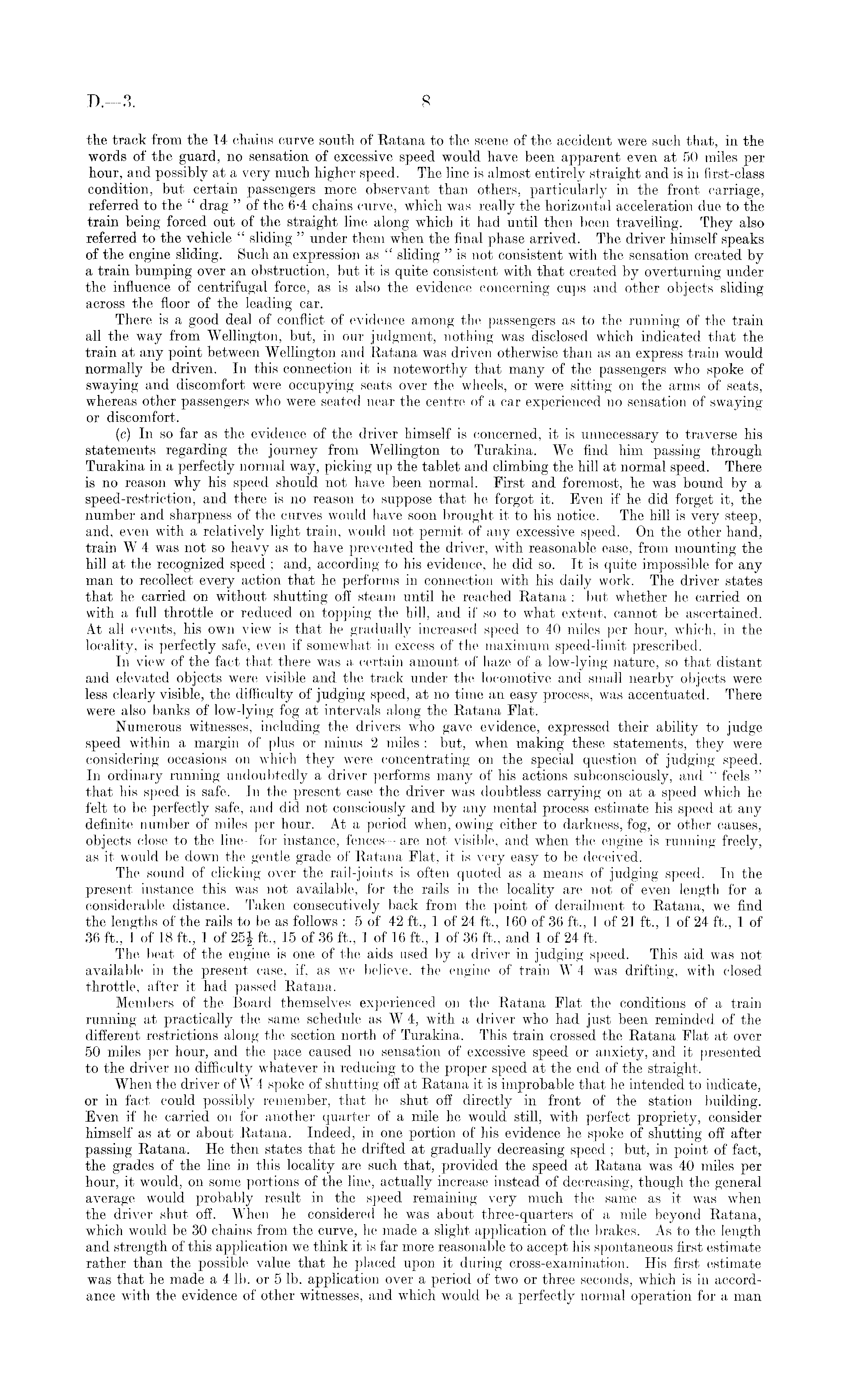 the track from the 14 chains curve south of Ratana to the scene of the accident were such that, in the words of the guard, no sensation of excessive speed would have been apparent even at 50 miles per hour, and possibly at a very much higher speed. The line is almost entirely straight and is in first-class condition, but certain passengers more observant than others, particularly in the front carriage, referred to the " drag " of the 6-4 chains curve, which was really the horizontal acceleration due to the train being forced out of the straight line along which it had until then been travelling. They also referred to the vehicle " sliding " under them when the final phase arrived. The driver himself speaks of the engine sliding. Such an expression, as " sliding "is not consistent with the sensation created by a train bumping over an obstruction, but it is quite consistent with that created by overturning under the influence of centrifugal force, as is also the evidence concerning cups and other objects sliding across the floor of the leading car. There is a good deal of conflict of evidence among the passengers as to the running of the train all the way from Wellington, but, in our judgment, nothing was disclosed which indicated that the train at any point between Wellington and Ratana was driven otherwise than as an express train would normally be driven. In this connection it is noteworthy that many of the passengers who spoke of swaying and discomfort were occupying seats over the wheels, or were sitting on the arms of seats, whereas other passengers who were seated near the centre of a car experienced no sensation of swaying or discomfort. (c) In so far as the evidence of the driver himself is concerned, it is unnecessary to traverse his statements regarding the journey from Wellington to Turakina. We find him passing through Turakina in a perfectly normal way, picking up the tablet and climbing the hill at normal speed. There is no reason why his speed should not have been normal. First and foremost, he was bound by a speed-restriction, and there is no reason to suppose that he forgot it. Even if he did forget it, the number and sharpness of the curves would have soon brought it to his notice. The hill is very steep, and, even with a relatively light train, would not permit of any excessive speed. On the other hand, train W 4 was not so heavy as to have prevented the driver, with reasonable ease, from mounting the hill at the recognized speed ; and, according to his evidence, he did so. It is quite impossible for any man to recollect every action that he performs in connection with his daily work. The driver states that he carried on without shutting off steam until he reached Ratana ; but whether he carried on with a full throttle or reduced on topping the hill, and if so to what extent, cannot be ascertained. At all events, his own view is that he gradually increased speed to 40 miles per hour, which, in the locality, is perfectly safe, even if somewhat in excess of the maximum speed-limit prescribed. In view of the fact that there was a certain amount of haze of a low-lying nature, so that distant and elevated objects were visible and the track under the locomotive and small nearby objects were less clearly visible, the difficulty of judging speed, at no time an easy process, was accentuated. There were also banks of low-lying fog at intervals along the Ratana Flat. Numerous witnesses, including the drivers who gave evidence, expressed their ability to judge speed within a margin of plus or minus 2 miles ; but, when making these statements, they were considering occasions on which they were concentrating on the special question of judging speed. In ordinary running undoubtedly a driver performs many of his actions subconsciously, and " feels " that his speed is safe. In the present case the driver was doubtless carrying on at a speed which he felt to be perfectly safe, and did not consciously and by any mental process estimate his speed at any definite number of miles per hour. At a period when, owing either to darkness, fog, or other causes, objects close to the line —for instance, fences —are not visible, and when the engine is running freely, as it would be down the gentle grade of Ratana Flat, it is very easy to be deceived. The sound of clicking over the rail-joints is often quoted as a means of judging speed. In the present instance this was not available, for the rails in the locality are not of even length for a considerable distance. Taken consecutively back from the point of derailment to Ratana, we find the lengths of the rails to be as follows : 5 of 42 ft., 1 of 24 ft., 160 of 36 ft., 1 of 21 ft., 1 of 24 ft., 1 of 36 ft., 1 of 18 ft., 1 of 25-J ft., 15 of 36 ft., 1 of 16 ft., 1 of 36 ft., and 1 of 24 ft. The beat of the engine is one of the aids used by a driver in judging speed. This aid was not available in the present case, if, as we believe, the engine of train W 4 was drifting, with closed throttle, after it had passed Ratana. Members of the Board themselves experienced on the Ratana Flat the conditions of a train running at practically the same schedule as W 4, with a driver who had just been reminded of the different restrictions along the section north of Turakina. This train crossed the Ratana Flat at over 50 miles per hour, and the pace caused no sensation of excessive speed or anxiety, and it presented to the driver no difficulty whatever in reducing to the proper speed at the end of the straight. When the driver of W 4 spoke of shutting off at Ratana it is improbable that he intended to indicate, or in fact could possibly remember, that he shut off directly in front of the station building. Even if he carried on for another quarter of a mile he would still, with perfect propriety, consider himself as at or about Ratana. Indeed, in one portion of his evidence he spoke of shutting off after passing Ratana. He then states that he drifted at gradually de