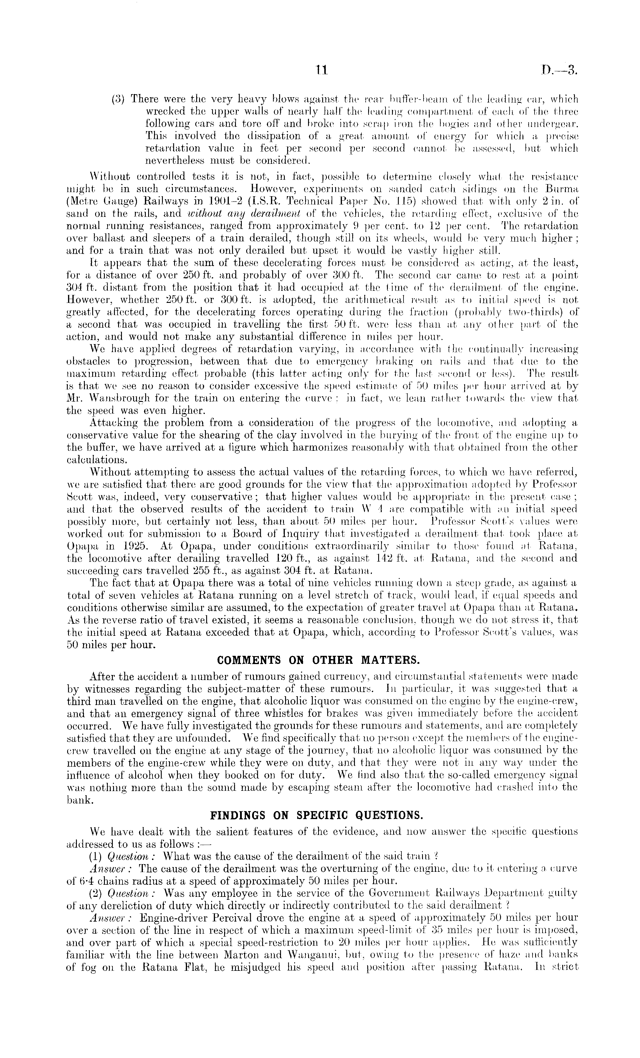 (3) There were the very heavy blows against the rear buffer-beam of the leading car, which wrecked the upper walls of nearly half the leading compartment of each of the three following cars and tore off and broke into scrap iron the bogies and other undergear. This involved the dissipation of a great amount of energy for which a precise retardation value in feet per second per second cannot be assessed, but which nevertheless must be considered. Without controlled tests it is not, in fact, possible to determine closely what the resistance might be in such circumstances. However, experiments on sanded catch sidings on the Burma (Metre Gauge) Railways in 1901-2 (I.S.R. Technical Paper No. 115) showed that with only 2 in. of sand on the rails, and without any derailment of the vehicles, the retarding effect, exclusive of the normal running resistances, ranged from approximately 9 per cent, to 12 per cent. The retardation over ballast and sleepers of a train derailed, though still on its wheels, would be very much higher ; and for a train that was not only derailed but upset it would be vastly higher still. It appears that the sum of these decelerating forces must be considered as acting, at the least, for a distance of over 250 ft. and probably of over 300 ft. The second car came to rest at a point 304 ft. distant from the position that it had occupied at the time of the derailment of the engine. However, whether 250 ft. or 300 ft. is adopted, the arithmetical result as to initial speed is not greatly affected, for the decelerating forces operating during the fraction (probably two-thirds) of a second that was occupied in travelling the first 50 ft. were less than at any other part of the action, and would not make any substantial difference in miles per hour. We have applied degrees of retardation varying, in accordance with the continually increasing obstacles to progression, between that due to emergency braking on rails and that due to the maximum retarding effect probable (this latter acting only for the last second or less). The result is that we see no reason to consider excessive the speed estimate of 50 miles per hour arrived at by Mr. Wansbrough for the train on entering the curve ; in fact, we lean rather towards the view that the speed was even higher. Attacking the problem from a consideration of the progress of the locomotive, and adopting a conservative value for the shearing of the clay involved in the burying of the front of the engine up to the buffer, we have arrived at a figure which harmonizes reasonably with that obtained from the other calculations. Without attempting to assess the actual values of the retarding forces, to which we have referred, we are satisfied that there are good grounds for the view that the approximation adopted by Professor Scott was, indeed, very conservative; that higher values would be appropriate in the present case ; and that the observed results of the accident to train W 4 are compatible with an initial speed possibly more, but certainly not less, than about 50 miles per hour. Professor Scott's values were worked out for submission to a Board of Inquiry that investigated a derailment that took place at Opapa in 1925. At Opapa, under conditions extraordinarily similar to those found at Ratana, the locomotive after derailing travelled 120 ft., as against 142 ft. at Ratana, and the second and succeeding cars travelled 255 ft., as against 304 ft. at Ratana. The fact that at Opapa there was a total of nine vehicles running down a steep grade, as against a total of seven vehicles at Ratana running on a level stretch of track, would lead, if equal speeds and conditions otherwise similar are assumed, to the expectation of greater travel at Opapa than at Ratana. As the reverse ratio of travel existed, it seems a reasonable conclusion, though we do not stress it, that the initial speed at Ratana exceeded that at Opapa, which, according to Professor Scott's values, was 50 miles per hour. COMMENTS ON OTHER MATTERS. After the accident a number of rumours gained currency, and circumstantial statements were made by witnesses regarding the subject-matter of these rumours. In particular, it was suggested that a third man travelled on the engine, that alcoholic liquor was consumed on the engine by the engine-crew, and that an emergency signal of three whistles for brakes was given immediately before the accident occurred. We have fully investigated the grounds for these rumours and statements, and are completely satisfied that they are unfounded. We find specifically that no person except the members of the enginecrew travelled on the engine at any stage of the journey, that no alcoholic liquor was consumed by the members of the engine-crew while they were on duty, and that they were not in any way under the influence of alcohol when they booked on for duty. We find also that the so-called emergency signal was nothing more than the sound made by escaping steam after the locomotive had crashed into the bank. FINDINGS ON SPECIFIC QUESTIONS. We have dealt with the salient features of the evidence, and now answer the specific questions addressed to us. as follows - (1) Question : What was the cause of the derailment of the said train ? Answer : The cause of the derailment was the overturning of the engine, due to it entering a curve of 6-4 chains radius at a speed of approximately 50 miles per hour. (2) Question : Was any employee in the service of the Government Railways Department guilty of any dereliction of duty which directly or indirectly contributed to the said derailment ? Answer : Engine-driver Percival drove the engine at a speed of approximately 50 miles per hour over a section of the line in respect of which a maximum speed-limit of 35 miles per hour is imposed, and over part of which a special speed-restriction to 20 miles per hour applies. He was sufficiently familiar with the line between Marton and Wanganui, but, owing to the presence of haze a