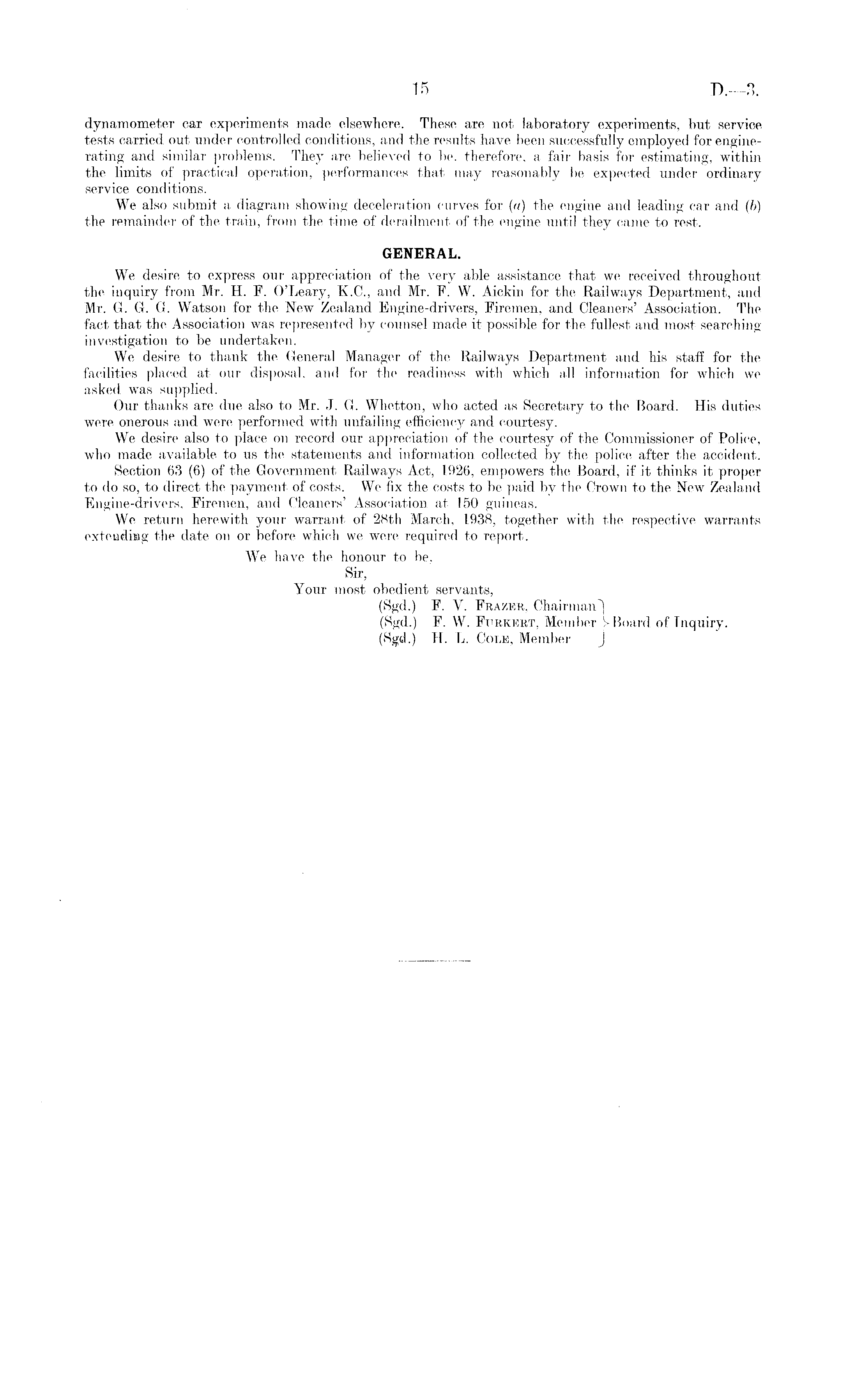 dynamometer car experiments made elsewhere. These are not laboratory experiments, but service tests carried out under controlled conditions, and the results have been successfully employed for enginerating and similar problems. They are believed to be, therefore, a fair basis for estimating, within the limits of practical operation, performances that may reasonably be expected under ordinary service conditions. We also submit a diagram showing deceleration curves for (a) the engine and leading car and (6) the remainder of the train, from the time of derailment of the engine until they came to rest. GENERAL. We desire to express our appreciation of the very able assistance that we received throughout the inquiry from Mr. H. F. O'Leary, K.C., and Mr. F. W. Aickin for the Railways Department, and Mr. G. G. G. Watson for the New Zealand Engine-drivers, Firemen, and Cleaners' Association. The fact that the Association was represented by counsel made it possible for the fullest and most searching investigation to be undertaken. We desire to thank the General Manager of the Railways Department and his staff for the facilities placed at our disposal, and for the readiness with which all information for which we asked was supplied. Our thanks are due also to Mr. J. G. Whetton, who acted as Secretary to the Board. His duties were onerous and were performed with unfailing efficiency and courtesy. We desire also to place on record our appreciation of the courtesy of the Commissioner of Police, who made available to us the statements and information collected by the police after the accident. Section 63 (6) of the Government Railways Act, 1926, empowers the Board, if it thinks it proper to do so, to direct the payment of costs. We fix the costs to be paid by the Crown to the New Zealand Engine-drivers, Firemen, and Cleaners' Association at 150 guineas. We return herewith your warrant of 28th March, 1938, together with the respective warrants extending the date on or before which we were required to report. We have the honour to be, Sir, Your most obedient servants, (Sgd.) F. Y. Fbazer, Chairman^ (Sgd.) F. W. Furkert, Member !> Board of Inquiry. (Sgd.) H. L. Cole, Member j