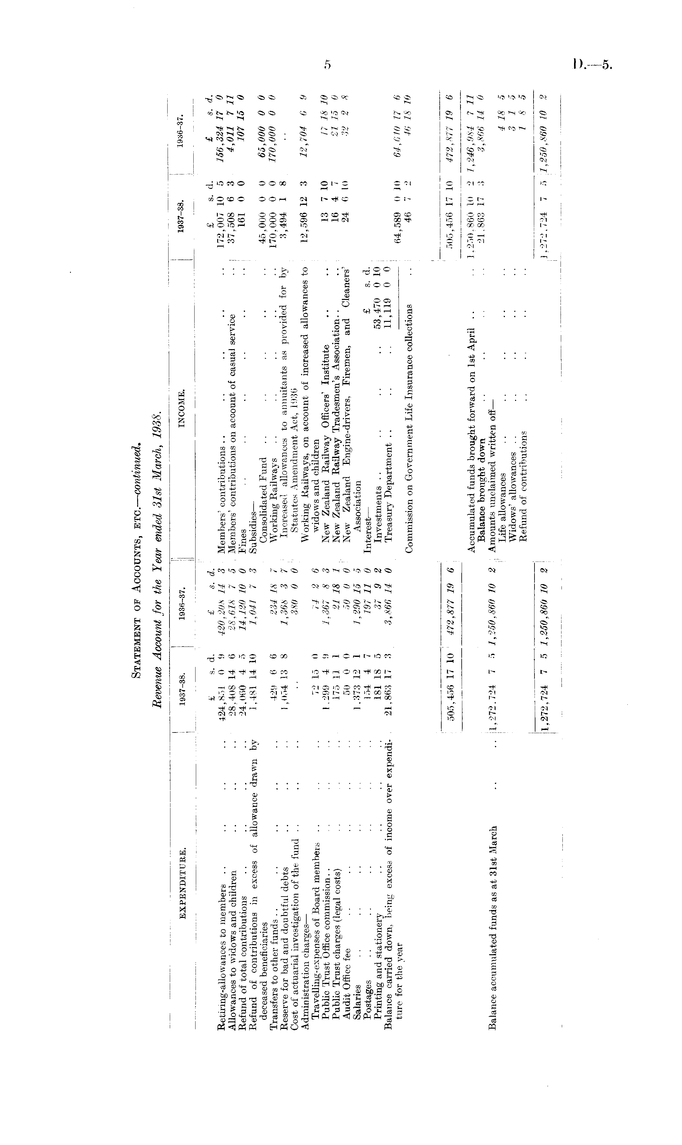 EXPENDITURE. 1937-38. 1936-37. INCOME. 1937-38. 1936-37. £ s. d. £ s. d. £ s. d. £ s. d. Retiring-allowances to members .. .. .. .. 424,851 0 9 420,208 14 3 Members'contributions.. .. .. .. •• 172,007 10 5 156,324 17 0 Allowances to widows and children .. .. .. 28,408 14 6 28,618 7 5 Members'contributions on account of casual service .. 37,508 6 3 4,011 7 11 Refund of total contributions .. .. .. .. 24,060 4 5 14,120 10 0 Fines .. .. .. .. •• •• 161 0 0 107 15 0 Refund of contributions in excess of allowance drawn by 1,481 14 10 1,041 7 3 Subsidies — deceased beneficiaries Consolidated Fund .. .. .. .. .. 45,000 0 0 65,000 0 0 Transfers to other funds .. .. .. .. .. 429 6 6 234 18 7 Working Railways .. .. .. .. •• 170,000 0 0 170,000 0 0 Reserve for bad and doubtful debts .. .. .. 1,054 13 8 1,368 3 7 Increased allowances to annuitants as provided for by 3,494 1 8 Cost of actuarial investigation of the fund .. .. .. .. 380 0 0 Statutes Amendment Act, 1936 Administration charges — Working Railways, on account of increased allowances to 12,596 12 3 12,704 6 9 Travelling-expenses of Board members .. . . 72 15 0 74 2 6 widows and children Public Trust Office commission.. . .. .. 1,299 4 9 1,367 8 3 New Zealand Railway Officers' Institute .. .. 13 7 10 17 18 10 Public Trust charges (legal costs) 175 11 1 21 18 1 New Zealand Railway Tradesmen's Association.. .. 16 4 7 21 15 0 Audit Office fee .. .. .. .. 50 0 0 50 0 0 New Zealand Engine-drivers, Firemen, and Cleaners' 24 6 10 32 2 8 Salaries .. .. .. .. 1,373 12 1 1,290 15 5 Association Postages .. . . .. . . . . .. 154 4 7 197 11 0 Interest — £ s. d. Printing and stationery .. .. .. .. 181 18 5 37 9 2 Investments .. .. .. .. 53,470 0 10 Balance carried down, being excess of income over expendi- 21,863 17 3 3,866 14 0 Treasury Department .. .. .. 11,119 0 0 ture for the year 64,589 0 10 64,610 17 6 Commission on Government Life Insurance collections .. 46 7 2 46 18 10 505,456 17 10 472,877 19 6 ' 505,456 17 10 472,877 19 6 Accumulated funds brought forward on 1st April .. 1,250,860 10 2 1,246,984 7 11 Balance brought down .. .. .. 21,863 17 3 3,866 14 0 Balance accumulated funds as at 31st March .. .. 1,272,724 7 5 1,250,860 10 2 Amounts unclaimed written off — Life allowances .. .. .. .. . . 4 18 5 Widows' allowances .. .. .. .. .. 3 15 Refund of contributions .. .. .. .. 18 5 1,272,724 7 5 1,250,860 10 2 1,272,724 7 5 1,250,860 10 2