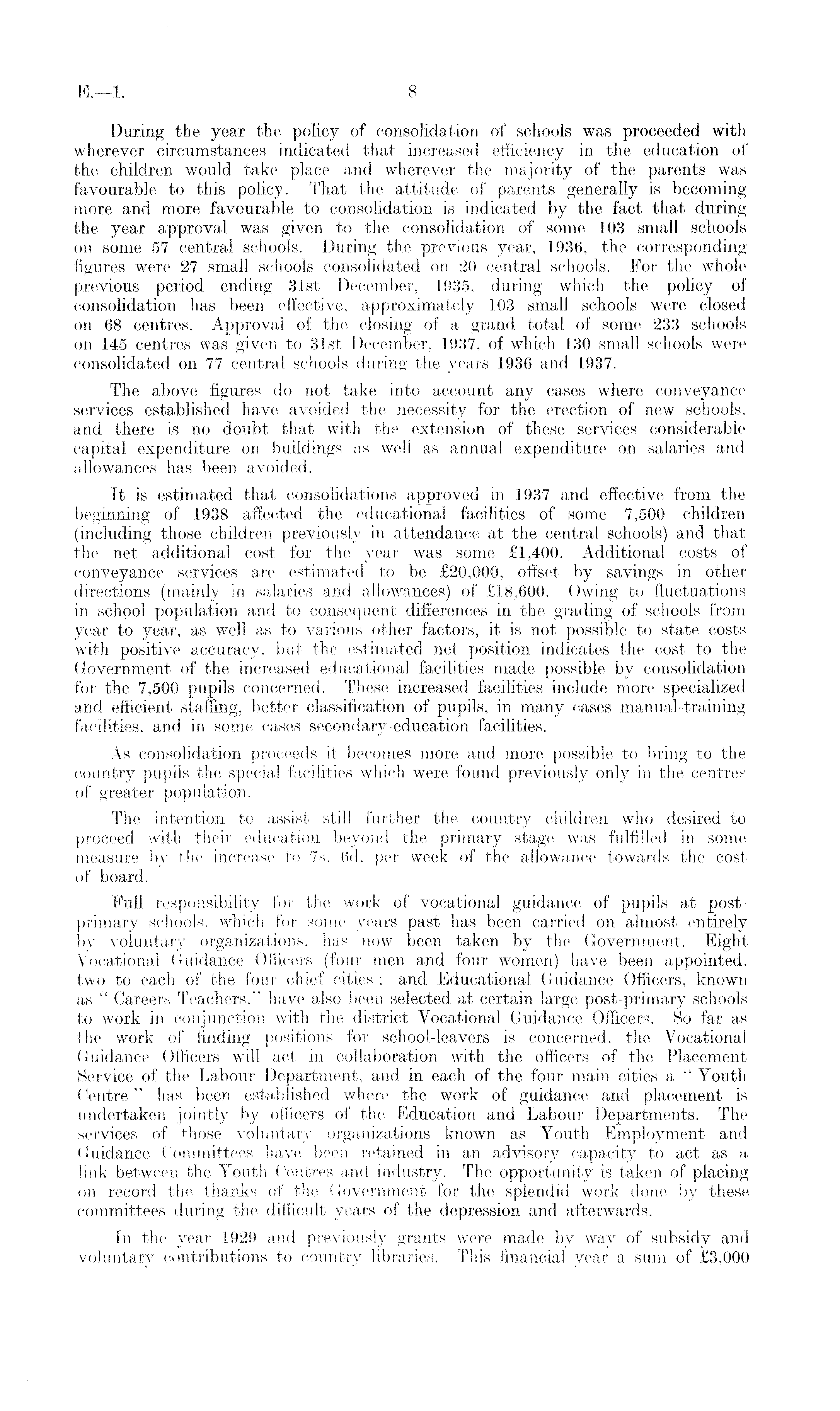 During the year the policy of consolidation of schools was proceeded with wherever circumstances indicated that increased efficiency in the education of the children would take place and wherever the majority of the parents was favourable to this policy. That the attitude of parents generally is becoming more and more favourable to consolidation is indicated by the fact that during the year approval was given to the consolidation of some 103 small schools on some 57 central schools. During the previous year, 1936, the corresponding figures were 27 small schools consolidated on 20 central schools. For the whole previous period ending 31st December, 1935, during which the policy of consolidation has been effective, approximately 103 small schools were closed on 68 centres. Approval of the closing of a grand total of some 233 schools on 145 centres was given to 31st December, 1937, of which 130 small schools were consolidated on 77 central schools during the years 1936 and 1937. The above figures do not take into account any cases where conveyance services established have avoided the necessity for the erection of new schools, and there is no doubt that with the extension of these services considerable capital expenditure on buildings as well as annual expenditure on salaries and allowances has been avoided. It is estimated that consolidations approved in .1937 and effective from the beginning of 1938 affected the educational facilities of some 7,500 children (including those children previously in attendance at the central schools) and that the net additional cost for the year was some £1,400. Additional costs of conveyance services are estimated to be £20,000, offset by savings in other directions (mainly in salaries and allowances) of £18,600. Owing to fluctuations in school population and to consequent differences in the grading of schools from year to year, as well as to various other factors, it is not possible to state costs with positive accuracy, but the estimated net position indicates the cost to the Government of the increased educational facilities made possible by consolidation for the 7,500 pupils concerned. These increased facilities include more specialized and efficient staffing, better classification of pupils, in many cases manual-training facilities, and in some cases secondary-education facilities. As consolidation proceeds it becomes more and more possible to bring to the country pupils the special facilities which were found previously only in the centres of greater population. The intention to assist still further the country children who desired to proceed with their education beyond the primary stage was fulfilled in some measure by the increase to 7s. 6d. per week of the allowance towards the cost of board. Full responsibility for the work of vocational guidance of pupils at postprimary schools, which for some years past has been carried on almost entirely by voluntary organizations, has now been taken by the Government. Eight Vocational Guidance Officers (four men and four women) have been appointed, two to each of the four chief cities ; and Educational Guidance Officers, known as " Careers Teachers," have also been selected at certain large post-primary schools to work in conjunction with the district Vocational Guidance Officers. So far as the work of finding positions for school-leavers is concerned, the Vocational Guidance Officers will act in collaboration with the officers of the Placement Service of the Labour Department, and in each of the four main cities a " Youth Centre " has been established where the work of guidance and placement is undertaken jointly by officers of the Education and Labour Departments. The services of those voluntary organizations known as Youth Employment and Guidance Committees have been retained in an advisory capacity to act as a link between the Youth Centres and industry. The opportunity is taken of placing on record the thanks of the Government for the splendid work done by these committees during the difficult years of the depression and afterwards. In the year 1929 and previously grants were made by way of subsidy and voluntary contributions to country libraries. This financial year a sum of £3,000