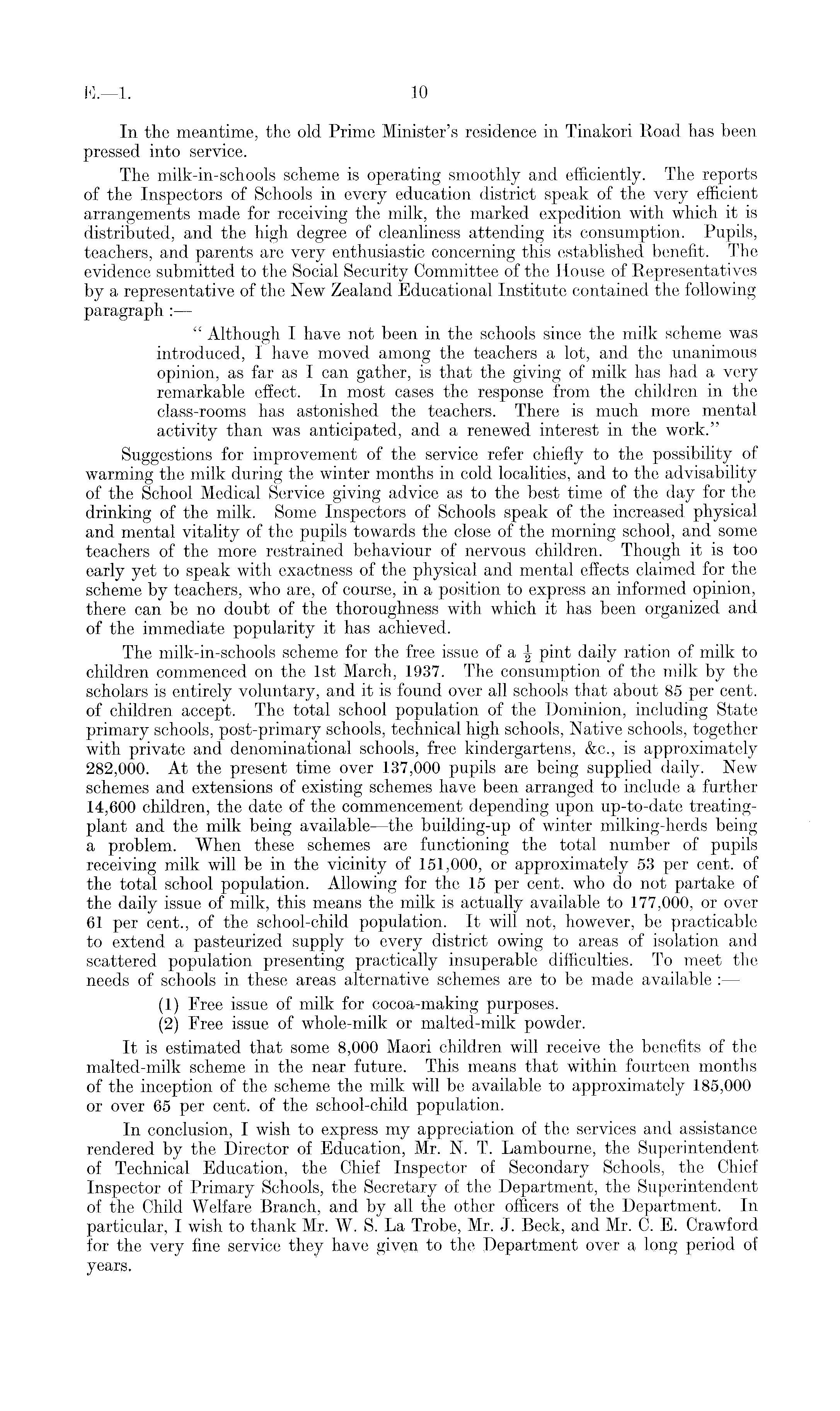 In the meantime, the old Prime Minister's residence in Tinakori Road has been pressed into service. The milk-in-schools scheme is operating smoothly and efficiently. The reports of the Inspectors of Schools in every education district speak of the very efficient arrangements made for receiving the milk, the marked expedition with which it is distributed, and the high degree of cleanliness attending its consumption. Pupils, teachers, and parents are very enthusiastic concerning this established benefit. The evidence submitted to the Social Security Committee of the House of Representatives by a representative of the New Zealand Educational Institute contained the following paragraph : —- " Although I have not been in the schools since the milk scheme was introduced, I have moved among the teachers a lot, and the unanimous opinion, as far as I can gather, is that the giving of milk has had a very remarkable effect. In most cases the response from the children in the class-rooms has astonished the teachers. There is much more mental activity than was anticipated, and a renewed interest in the work." Suggestions for improvement of the service refer chiefly to the possibility of warming the milk during the winter months in cold localities, and to the advisability of the School Medical Service giving advice as to the best time of the day for the drinking of the milk. Some Inspectors of Schools speak of the increased physical and mental vitality of the pupils towards the close of the morning school, and some teachers of the more restrained behaviour of nervous children. Though it is too early yet to speak with exactness of the physical and mental effects claimed for the scheme by teachers, who are, of course, in a position to express an informed opinion, there can be no doubt of the thoroughness with which it has been organized and of the immediate popularity it has achieved. The milk-in-schools scheme for the free issue of a \ pint daily ration of milk to children commenced on the Ist March, 1937. The consumption of the milk by the scholars is entirely voluntary, and it is found over all schools that about 85 per cent, of children accept. The total school population of the Dominion, including State primary schools, post-primary schools, technical high schools, Native schools, together with private and denominational schools, free kindergartens, &c., is approximately 282,000. At the present time over 137,000 pupils are being supplied daily. New schemes and extensions of existing schemes have been arranged to include a further 14,600 children, the date of the commencement depending upon up-to-date treatingplant and the milk being available—the building-up of winter milking-herds being a problem. When these schemes are functioning the total number of pupils receiving milk will be in the vicinity of 151,000, or approximately 53 per cent, of the total school population. Allowing for the 15 per cent, who do not partake of the daily issue of milk, this means the milk is actually available to 177,000, or over 61 per cent., of the school-child population. It will not, however, be practicable to extend a pasteurized supply to every district owing to areas of isolation and scattered population presenting practically insuperable difficulties. To meet the needs of schools in these areas alternative schemes are to be made available : — (1) Free issue of milk for cocoa-making purposes. (2) Free issue of whole-milk or malted-milk powder. It is estimated that some 8,000 Maori children will receive the benefits of the malted-milk scheme in the near future. This means that within fourteen months of the inception of the scheme the milk will be available to approximately 185,000 or over 65 per cent, of the school-child population. In conclusion, I wish to express my appreciation of the services and assistance rendered by the Director of Education, Mr. N. T. Lambourne, the Superintendent of Technical Education, the Chief Inspector of Secondary Schools, the Chief Inspector of Primary Schools, the Secretary of the Department, the Superintendent of the Child Welfare Branch, and by all the other officers of the Department. In particular, I wish to thank Mr. W. S. La Trobe, Mr. J. Beck, and Mr. C. E. Crawford for the very fine service they have given to the Department over a long period of years.