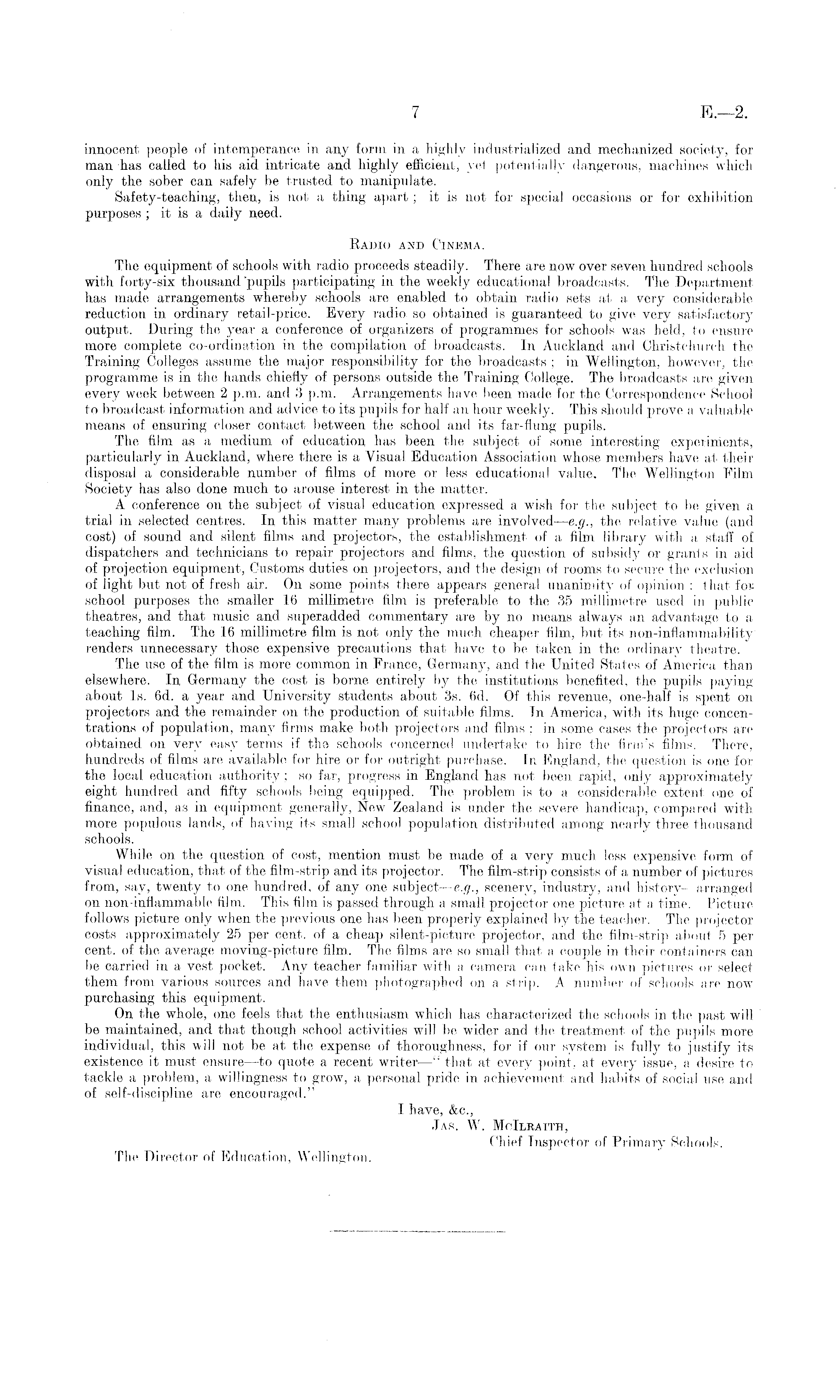 innocent people of intemperance in any form in a highly industrialized and mechanized society, for man has called to his aid intricate and highly efficient, yet potentially dangerous, machines which only the sober can safely be trusted to manipulate. Safety-teaching, then, is not a thing apart ; it is not for special occasions or for exhibition purposes ; it is a daily need. Radio and Cinema. The equipment of schools with radio proceeds steadily. There are now over seven hundred schools with forty-six thousand'pupils participating in the weekly educational broadcasts. The Department lias made arrangements whereby schools are enabled to obtain radio sets at a very considerable reduction in ordinary retail-price. Every radio, so obtained is guaranteed to give very satisfactory output. During the year a conference of organizers of programmes for schools was held, to ensure more complete co-ordination in the compilation of broadcasts. In Auckland and Christchurch the Training Colleges assume the major responsibility for the broadcasts ; in Wellington, however, the programme is in the hands chiefly of persons outside the Training College. The broadcasts are given every week between 2 p.m. and 3 p.m. Arrangements have been made for the Correspondence School to broadcast information and advice to its pupils for half an hour weekly. This should prove a valuable means of ensuring closer contact between the school and its far-flung pupils. The film as a medium of education has been the subject of some interesting experiments, particularly in Auckland, where there is a Visual Education Association whose members have at their disposal a considerable number of films of more or less educational value. The Wellington Film Society has also done much to arouse interest in the matter. A conference on the subject of visual education expressed a wish for the subject to be given a trial in selected centres. In this matter many problems are involved—e.g., the relative value (and cost) of sound and silent films and projectors, the establishment of a film library with a staff of dispatchers and technicians to repair projectors and films, the question of subsidy or grants in aid of projection equipment, Customs duties on projectors, and the design of rooms to secure the exclusion of light but not of fresh air. On some points there appears general unanimity of opinion : that fos school purposes the smaller 16 millimetre film is preferable to the 35 millimetre used in public theatres, and that music and superadded commentary are by no means always an advantage to a teaching film. The 16 millimetre film is not only the much cheaper film, but its non-inflammability renders unnecessary those expensive precautions that have to be taken in the ordinary theatre. The use of the film is more common in France, Germany, and the United States of America than elsewhere. In Germany the cost is borne entirely by the institutions benefited, the pupils paying about Is. 6d. a year and University students about 3s. 6d. Of this revenue, one-half is spent on projectors and the remainder on the production of suitable films. In America, with its huge concentrations of population, many firms make both projectors and films ; in some cases the projectors are obtained on very easy terms if the schools concerned undertake to hire the firm's films. There, hundreds of films are available for hire or for outright purchase. In England, the question is one for the local education authority ; so far, progress in England has not been rapid, only approximately eight hundred and fifty schools being equipped. The problem is to a considerable extent one of finance, and, as in equipment generally, New Zealand is under the severe handicap, compared with more populous lands, of having its small school population distributed among nearly three thousand schools. While on the question of cost, mention must be made of a very much less expensive form of visual education, that of the film-strip and its projector. The film-strip consists of a number of pictures from, say, twenty to one hundred, of any one subject—e.g., scenery, industry, and history —arranged on non-inflammable film. This film is passed through a small projector one picture at a time. Picture follows picture only when the previous one has been properly explained by the teacher. The projector costs approximately 25 per cent, of a cheap silent-picture projector, and the film-strip about 5 per cent, of the average moving-picture film. The films are so small that a couple in their containers can be carried in a vest pocket. Any teacher familiar with a camera can take his own pictures or select them from various sources and have them photographed on a strip. A number of schools are now purchasing this equipment. On the whole, one feels that the enthusiasm which has characterized the schools in the past will be maintained, and that though school activities will be wider and the treatment of the pupils more individual, this will not be at the expense of thoroughness, for if our system is fully to justify its existence it must ensure —to quote a recent writer—" that at every point, at every issue, a desire to tackle a problem, a willingness to grow, a personal pride in achievement and habits of social use and of self-discipline are encouraged." I have, &c., .Tas. W. Mclleaith, Chief Inspector of Primary Schools. The Director of Education, Wellington.