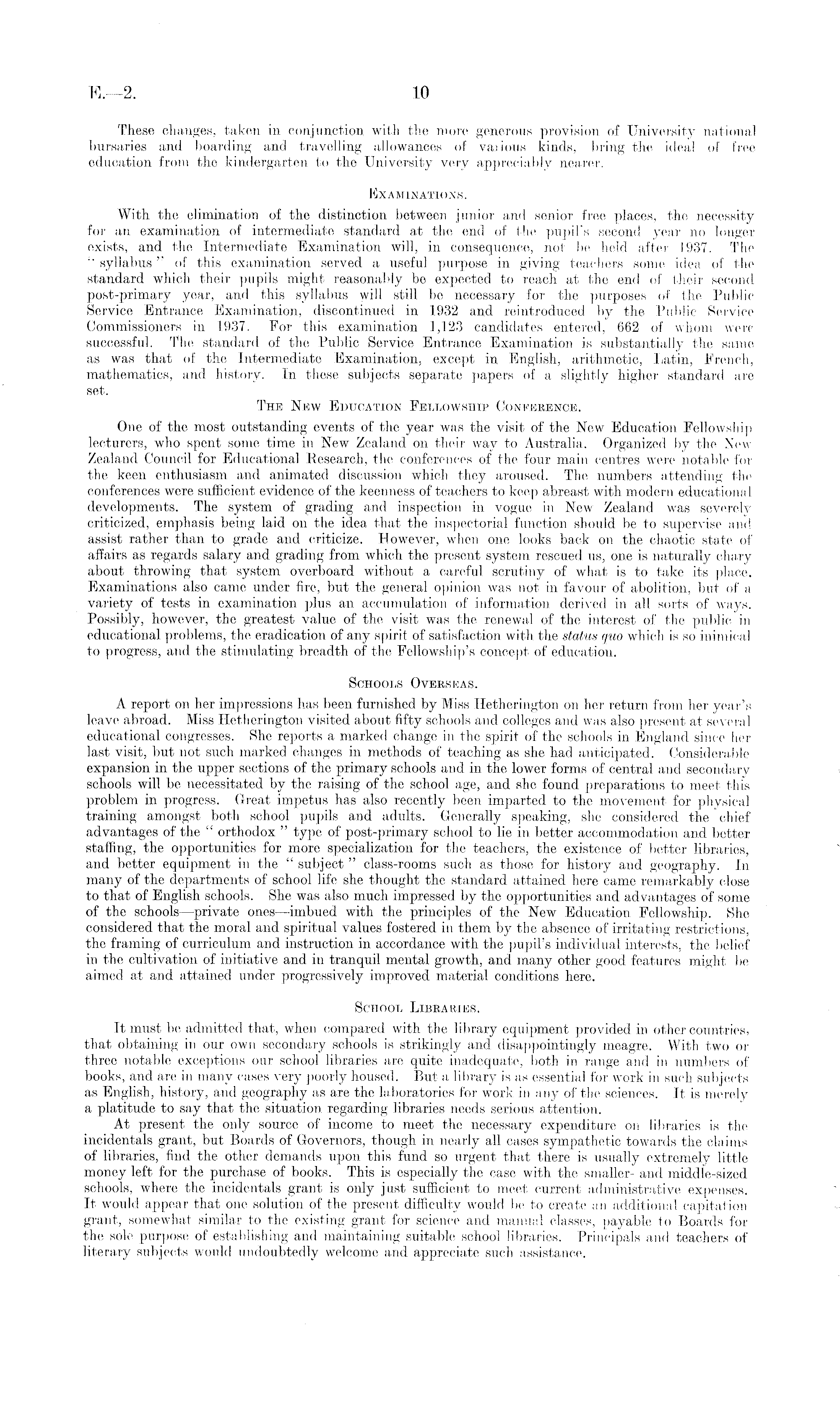These changes, taken in conjunction with the more generous provision of University national bursaries and boarding and travelling allowances of vaiious kinds, bring the ideal of free education from the kindergarten to the University very appreciably nearer. Examinations. With the elimination of the distinction between junior and senior free places, the necessity for an examination of intermediate standard at the end of the pupil's second year no longer exists, and the Intermediate Examination will, in consequence, not be held after 1937. The " syllabus" of this examination served a useful purpose in giving teachers some idea of the standard which their pupils might reasonably be expected to reach at the end of their second post-primary year, and this syllabus will still be necessary for the purposes of the Public Service Entrance Examination, discontinued in 1932 and reintroduced by the Public Service Commissioners in 1937. For this examination 1,123 candidates entered, 662 of whom were successful. The standard of the Public Service Entrance Examination is substantially the same as was that of the Intermediate Examination, except in English, arithmetic, Latin, French, mathematics, and history. In these subjects separate papers of a slightly higher standard are set. The New Education Fellowship Conpeeenoe. One of the most outstanding events of the year was the visit of the New Education Fellowship lecturers, who spent some time in New Zealand on their way to Australia. Organized by the New Zealand Council for Educational Research, the conferences of the four main centres were notable for the keen enthusiasm and animated discussion which they aroused. The numbers attending the conferences were sufficient evidence of the keenness of teachers to keep abreast with modern educational developments. The system of grading and inspection in vogue in New Zealand was severely criticized, emphasis being laid on the idea that the inspectorial function should be to supervise and assist rather than to grade and criticize. However, when one looks back on the chaotic state of affairs as regards salary and grading from which the present system rescued us, one is naturally chary about throwing that system overboard without a careful scrutiny of what is to take its place. Examinations also came under fire, but the general opinion was not in favour of abolition, but of a variety of tests in examination plus an accumulation of information derived in all sorts of ways. Possibly, however, the greatest value of the visit was the renewal of the interest of the public in educational problems, the eradication of any spirit of satisfaction with the status quo which is so inimical to progress, and the stimulating breadth of the Fellowship's concept of education. Schools Overseas. A report on her impressions has been furnished by Miss Hetherington on her return from her year's leave abroad. Miss Hetherington visited about fifty schools and colleges and was also present at several educational congresses. She reports a marked change in the spirit of the schools in England since her last visit, but not such marked changes in methods of teaching as she had anticipated. Considerable expansion in the upper sections of the primary schools and in the lower forms of central and secondary schools will be necessitated by the raising of the school age, and she found preparations to meet this problem in progress. Great impetus has also recently been imparted to the movement for physical training amongst both school pupils and adults. Generally speaking, she considered the chief advantages of the " orthodox " type of post-primary school to lie in better accommodation and better staffing, the opportunities for more specialization for the teachers, the existence of better libraries, and better equipment in the " subject " class-rooms such as those for history and geography. In many of the departments of school life she thought the standard attained here came remarkably close to that of English schools. She was also much impressed by the opportunities and advantages of some of the schools—private ones —imbued with the principles of the New Education Fellowship. She considered that the moral and spiritual values fostered in them by the absence of irritating restrictions, the framing of curriculum and instruction in accordance with the pupil's individual interests, the belief in the cultivation of initiative and in tranquil mental growth, and many other good features might be aimed at and attained under progressively improved material conditions here. School Libraries. It must be admitted that, when compared with the library equipment provided in other countries, that obtaining in our own secondary schools is strikingly and disappointingly meagre. With two or three notable exceptions our school libraries are quite inadequate, both in range and in numbers of books, and are in many cases very poorly housed. But a library is as essential for work in such subjects as English, history, and geography as are the laboratories for work in any of the sciences. It is merely a platitude to say that the situation regarding libraries needs serious attention. At present the only source of income to meet the necessary expenditure on libraries is the incidentals grant, but Boards of Governors, though in nearly all cases sympathetic towards the claims of libraries, find the other demands upon this fund so urgent that there is usually extremely little money left for the purchase of books. This is especially the case with the smaller- and middle-sized schools, where the incidentals grant is only just sufficient to meet, current administrative expenses. It would appear that one solution of the present difficulty would be to create an additional capitation grant, somewhat similar to the existing grant for science and manual classes, payable to Boards for the sole purpose of establishing and maintaining suitable school libraries. Principals and teachers of