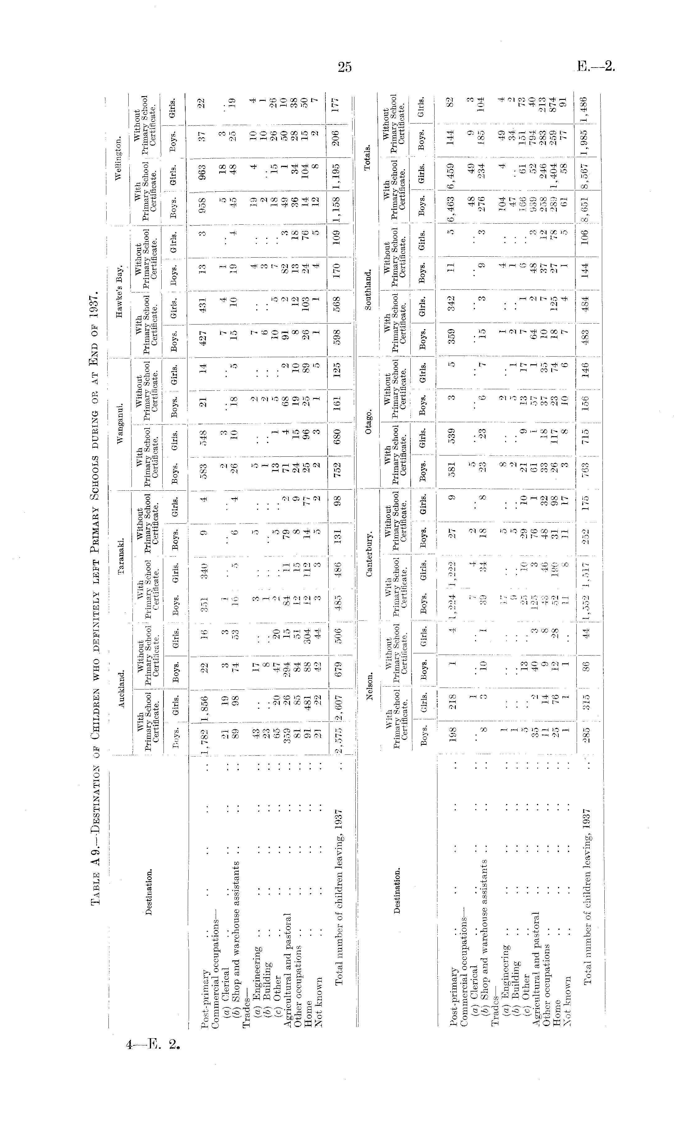 Auckland. Taranaki. Wanganui. Hawke's Bay. Wellington. With Without ! With Without With Without With Without With Without Destination. Primary School Primary School Primary School I Primary School Primary School Primary School Primary School Primary School Primary School; i rimary school Certificate. Certificate. Certificate. Certificate. Certificate. Certificate. Certificate. Certificate. Certificate. Certificate. Boys. Girls. Boys. Girls. ; Boys. Girls. I Boys. Girls. Boys. Girls. Boys. j Girls. Boys. Girls. Boys, i Girls. Boys, i Girls. Boys. Girls. Post-primary .. .. .. .. .. 1,782 1,856 22 10 j 351 1 340 9 4 583 548 21 14 427 431 13 3 958 903 37 22 Commercial occupations — (а) Clerical .. .. .. .. .. 21 19 3 3 j 1 2 3 .. .. 7 4 1 5 18 3 .. (б) Shop and warehouse assistants .. .. 89 98 74 53 16 | 5 6 4 26 10 18 5 15 10 19 4 45 48 25 Trades — (a) Engineering .. .. .. .. .. 43 17 3 j 5 5 2 7 4 19 4 10 (b) Building .. .. .. .. .. 23 8 1 ; .. .. 1 .. 2 6 3 2 10 1 (c) Other .. .. .. .. .. 65 20 47 20 2 1.. 5 13 1 5 10 5 7 18 15 2b 26 Agricultural and pastoral .. .. .. 359 26 294 15 84 11 79 2 71 4 68 2 91 2 82 3 49 1 »» Other occupations .. .. .. .. 81 85 84 51 12 15 8 9 24 15 19 10 8 12 13 18 36 34 28 Home .. .. .. .. .. 91 481 88 304 12 112 14 77 25 96 25 89 26 103 24 76 14 104 15 50 Not known .. .. .. .. .. 21 22 42 44 3 3 5 2 2 3 1 5 1 1 4 5 12 8 Total number of children leaving, 1937 .. 2,575 2,607 679 506 485 [ 486 131 98 752 680 161 125 598 568 170 109 1,158 1,195 206 1/* Nelson. Canterbury. Otago. Southland. Totals. With Without With Without With Without With Without With Without Destination. Primary School Primary School Primary School j Primary School Primary School Primary School Primary School Primary School Primary School ] Primary School Certificate. Certificate. Certificate. I Certificate. Certificate. Certificate. Certificate. Certificate. j Certificate. | Certificate. I I ; I i [ f . Boys. | Girls. Boys. Girls, i Boys. Girls. Boys. Girls. Boys. Girls. Boys. Girls. Boys. Girls. Boys. Girls. Boys. ! Girls. Boys. Girls. Post-primary .. .. .. .. 198 218 1 4 1,224 ! 1,222 | 27 9 581 539 3 5 359 342 11 5 0,463 6,459 144 82 Commercial occupations — (a) Clerical .. .. .. •. . . . . 1 ■ • • ■ 7 4 2 .. 5 .. .. .. .. .. • ■ • • 48 49 9 3 (b) Shop and warehouse assistants .. .. .. 8 3 10 1 39 34 18 8 23 23 6 7 15 3 9 3 276 234 18o 104 Trades — (a) Engineering .. •• •• 1 •• • • 17 i 5 .. 8 .. 2 .. 1 .. 4 .. 104 4 49 4 (b) Building .. .. .. • • .. 1 • • • ■ 9 .. 5 2 5 1 2 1 47 34 -■ c) Other .. . • • • • • • ■ 5 13 25 . 10 29 10 21 9 13 17 7 1 6 .. 106 61 151 73 Agricultural and pastoral .. .. .. .. 35 2 40 3 125 3 76 1 61 1 57 1 64 2 48 3 939 52 794 40 Other occupations 11 14 9 8 43 j 46 48 32 33 18 37 35 10 7 37 12 258 246 283 213 Home ■ •• 25 76 12 28 52 ; 190 31 98 26 117 23 74 18 125 27 78 289 1,404 259 874 Not known .. .. .. .. .. 1 1 1 11 8 11 17 3 8 10 6 7 4 1 5 61 58 77 91 Total number of children leaving, 1937 285 315 86 44 1,552 1,517 252 175: 763 715 156 146 483 484 144 106 js, 651 8,567 1,985 1,486