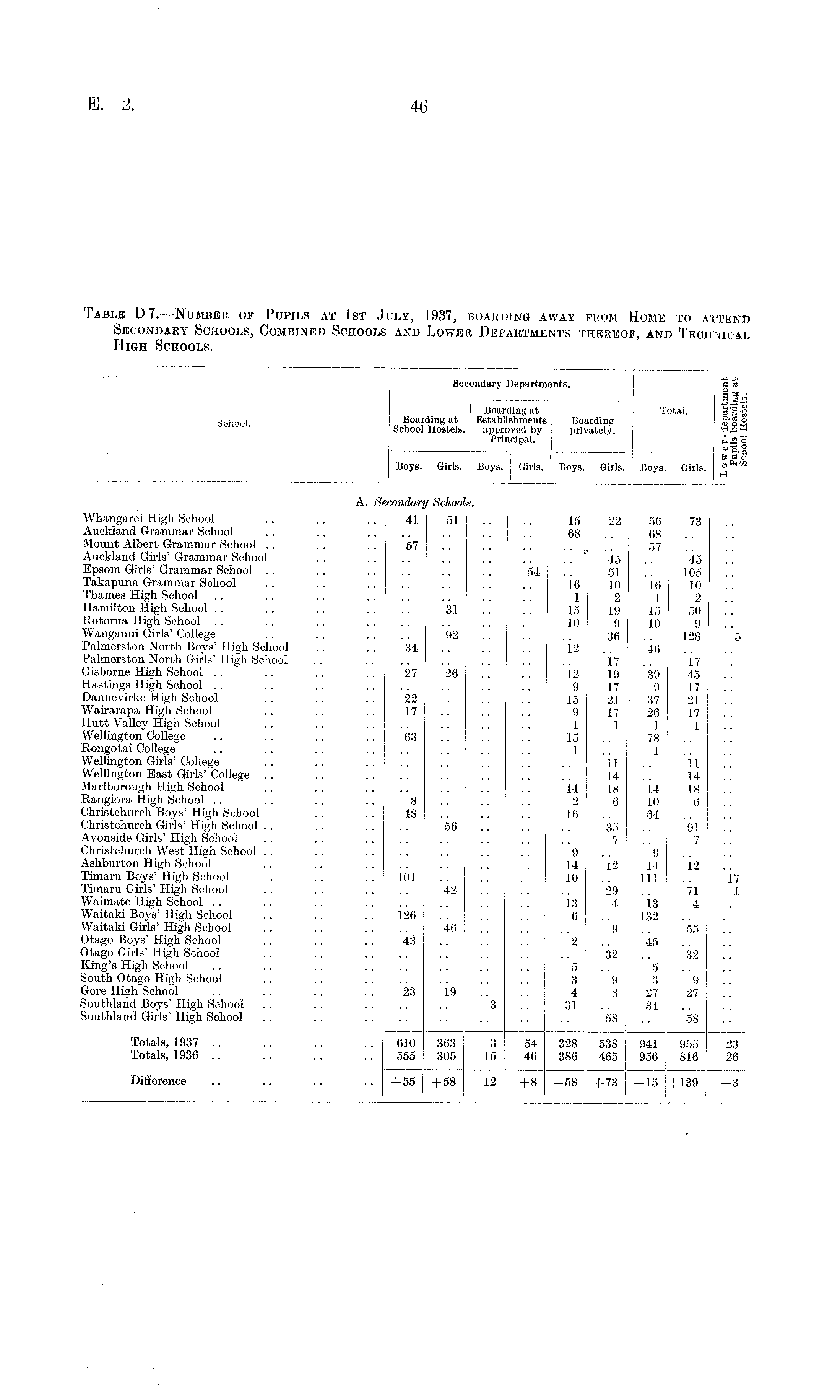 Secondary Departments. ate —* - . b Boarding at Total. ST?!! School Boarding at Establishments Boarding §* o £ School Hostels. ; approved by privately. u ,2 W Principal. d, » o ! ®"&2 I tag Boys. Girls. Boys. Girls. Boys. Girls. Boys. ! Girls. A. Secondary Schools. Whangarei High School .. .. .. 41 51 . . 15 22 56 73 Auckland Grammar School .. .. .. .. .. .. . . 68 . . 68 Mount Albert Grammar School .. .. .. 57 .. .. .. 57 Auckland Girls' Grammar School .. . . .. , . .. . . .. " 45 . . 45 Epsom Girls' Grammar School .. .. .. .. .. .. 54 .. 51 . . 105 Takapuna Grammar School .. .. . . .. .. .. .. 16 10 16 10 Thames High School .. .. .. .. .. .. .. .. 1 2 1 2.. Hamilton High School .. .. .. .. .. 31 . . .. 15 19 15 50 Rotorua High School .. .. .. . . .. .. . . . . 10 9 10 9 Wanganui Girls' College .. .. .. . . 92 .. .. .. 36 .. 128 5 Palmerston North Boys' High School .. . . 34 .. .. .. 12 .. 46 Palmerston North Girls' High School . . .. .. .. .. . . .. 17 .. 17 Gisborne High School .. .. . . .. 27 26 .. 12 19 39 45 Hastings High School .. .. .. .. .. .. .. .. 9 17 9 17 Dannevirke High School .. .. .. 22 .. .. .. 15 21 37 21 Wairarapa High School .. .. .. 17 .. .. 9 17 26 17 Hutt Valley High School .. .. .. .. .. .. .. 1 1 1 1 Wellington College .. .. .. .. 63 .. .. . . 15 .. 78 Rongotai College .. . . .. .. .. .. . . ,. 1 .. 1 Wellington Girls'College .. .. .. .. .. .. .. ,. 11 11 Wellington East Girls' College .. . . . . . . .. .. .. .. 14 , . 14 Marlborough High School .. . . . . .. .. .. . . 14 18 14 18 Rangiora High School . . .. .. .. 8 .. . . 2 6 10 6 Christchurch Boys' High School . . . . 48 .. .. . . 16 . . 64 Christchurch Girls' High School .. . . .. .. 56 . . .. .. 35 .. 91 Avonside Girls' High School . . .. .. . . . . .. .. .. 7 . . 7 Christchurch West High School . . . . .. .. .. .. . . 9 .. 9 Ashburton High School .. .. .. .. .. .. .. 14 12 14 12 Timaru Boys'High School .. .. .. 101 .. .. .. 10 .. Ill .. 17 Timaru Girls' High School . . .. .... 42 . . . . 29 71 1 Waimate High School .. .. .. . . .. .. .. . . 13 4 13 4 Waitaki Boys' High School .. .. . . 126 .. .. .. 6 .. 132 Waitaki Girls' High School . . .. .. .. 46 .. . . .. 9 .. 55 Otago Boys' High School .. . . .. 43 .. . . .. 2 .. 45 Otago Girls' High School .. .. .. .. .. , . .. .. 32 .. 32 King's High School .. .. .. .. .. .. .. .. 5 .. 5 South Otago High School .. .. .... .. .. .. 3 9 3 9.. Gore High School .. .. .. .. 23 19 . . 4 8 27 27 Southland Boys' High School .. . . . . .. . . 3 .. 31 .. 34 Southland Girls' High School . . . . .. .. .. .. .. .. 58 .. 58 Totals, 1937 .. .. .. 610 363 3 54 328 538 941 955 23 Totals, 1936 .. .. . . 555 305 15 46 386 465 956 816 26 Difference .. .. .. .. +55 +58 -12 +8 -58 +73 -15 +139 —3