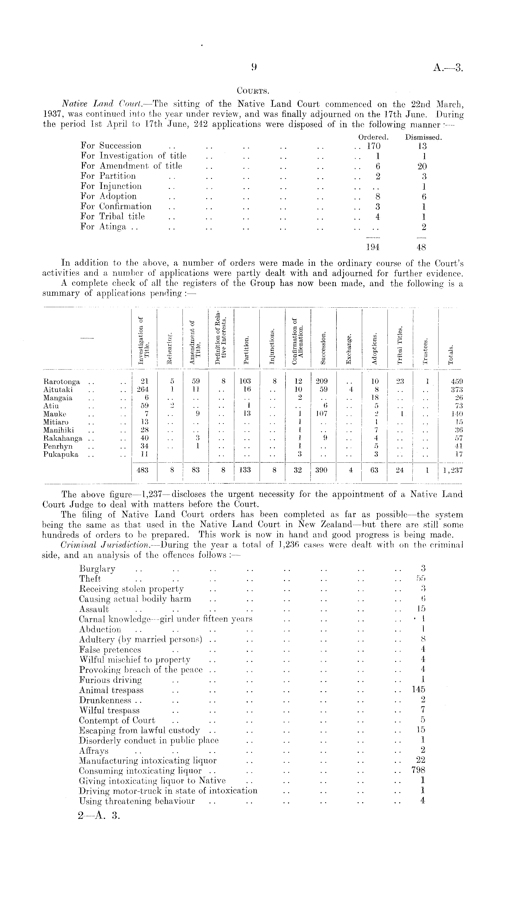 Coukts. Native Land Court.—The sitting of the Native Land Court commenced on the 22nd March, 1937, was continued into the year under review, and was finally adjourned on the 17th June. During the period Ist April to 17th June, 242 applications were disposed of in the following manner : — Ordered. Dismissed. For Succession . . .. .. .. .. .. 170 13 For Investigation of title . . . . .. . . 1 1 For Amendment of title .. . . .. .. 6 20 For Partition .. .. . . .. .. 2 3 For Injunction .. .. .. .. .. .... 1 For Adoption .. .. .. .. .. 8 6 For Confirmation . . .. . . .. . . 3 1 For Tribal title . . .. .. . . .. 4- 1 For Atinga .. . . .. .. . . .. .... 2 194 48 In addition to the above, a number of orders were made in the ordinary course of the Court's activities and a number of applications were partly dealt with and adjourned for further evidence. A complete check of all the registers of the Croup has now been made, and the following is a summary of applications pending : —