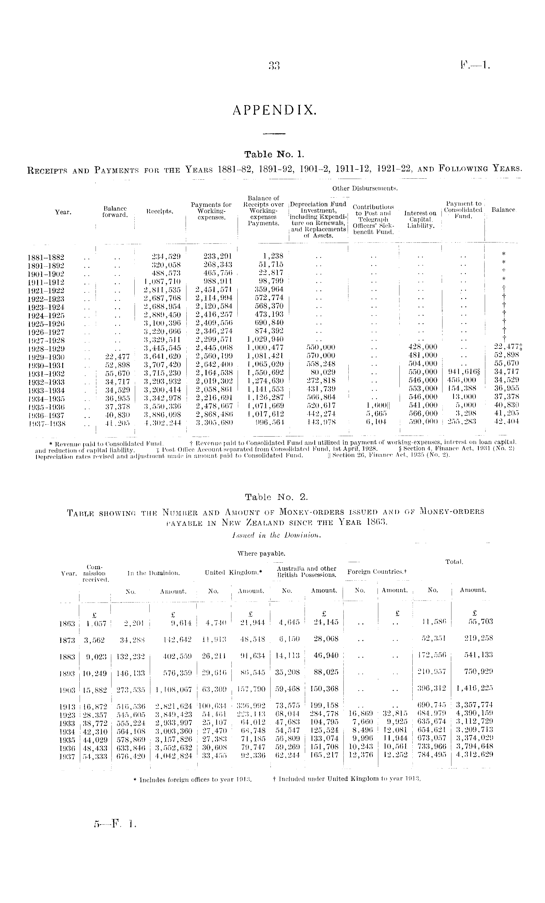 Other Disbursements. Balance of j j , „ . Payments for Receipts over Depreciation Fund p rm + r ihn+inns I Payment to Year. j Receipts. Working- Working- investment Interest on.. Consolidated Balance. t0rwad - ! expenses. expenses including Expendi- Telegraph Capltal Fund..:,,;; Payments. tare on Renewals, offl £ k . Ua £ ility . Kssete benefit Fund. ] 1881-1882 .. .. 234,529 233,291 1,238 .. .. .. .. * 1891-1892 .. .. 320,058 268,343 51,715 .. •• ■■ •• * 1901-1902 .. 488,573 465,756 22,817 1911-1912 .. .. 1,087,710 988,911 98,799 .. .. * 1921-1922 .. .. 2,811,535 2,451,571 359,964 .. .. .. .. t 1922-1923 .. .. 2,687,768 2,114,994 572,774 .. .. .. .. t 1923-1924 .. .. 2,688,954 2,120,584 568,370 .. .. ■■ t 1924-1925 .. 2,889,450 2,416,257 473,193 .. .. •• •• t 1925-1926 .. 3,100,396 2,409,556 690,840 .. .. •• t 1926-1927 .. .. 3,220,666 2,346,274 874,392 .. .. .. .. t 1927-1928 .. 3,329,511 2,299,571 1,029,940 .. .. •• t 1928-1929 .. .. 3,445,545 2,445,068 1,000,477 550,000 .. 428,000 .. 22,477} 1929-1930 22,477 3,641,620 2,560,199 1,081,421 570,000 .. 481,000 .. 52,898 .1930-1931 . 52,898 3,707,420 2,642,400 1,065,020 558,248 .. 504,000 .. 55,670 1931-1932 55,670 3,715,230 2,164,538 1,550,692 80,029 .. 550,000 941,616§ 34,717 1932-1933 34,717 3,293,932 2,019,302 1,274,630 272,818 .. 546,000 456,000 34,529 1933-1934 34,529 3,200,414 2,058,861 1,141,553 431,739 .. 553,000 154,388 36,955 1934-1935 36,955 3,342,978 2,216,691 1,126,287 566,864 .. 546,000 13,000 37,378 1935-1936 .. 37,378 3,550,336 2,478,667 1,071,669 520,617 1,600|| 541,000 5,000 40,830 1936-1937 40,830 3,886,098 2,868,486 1,017,612 442,274 5,665 566,000 3,298 41,205 1937-1938 .. 41,205 4,302,244 3,305,680 996,564 143,978 6,104 590,000 255,283 42,404 * Revenue paid to Consolidated Fund. t Revenue paid to Consolidated Fund and utilized in payment of working-expenses, interest on loan capita), and reduction of capital liability. I Post Oltice Account separated from Consolidated Fund, 1st April, 19*28. § Section 4. Finance Act, 1931 (No. 2) Depreciation rates revised and adjustment made in amount paid to Consolidated Fund. || Section 26, Finance Act, 1935 (No. 2).