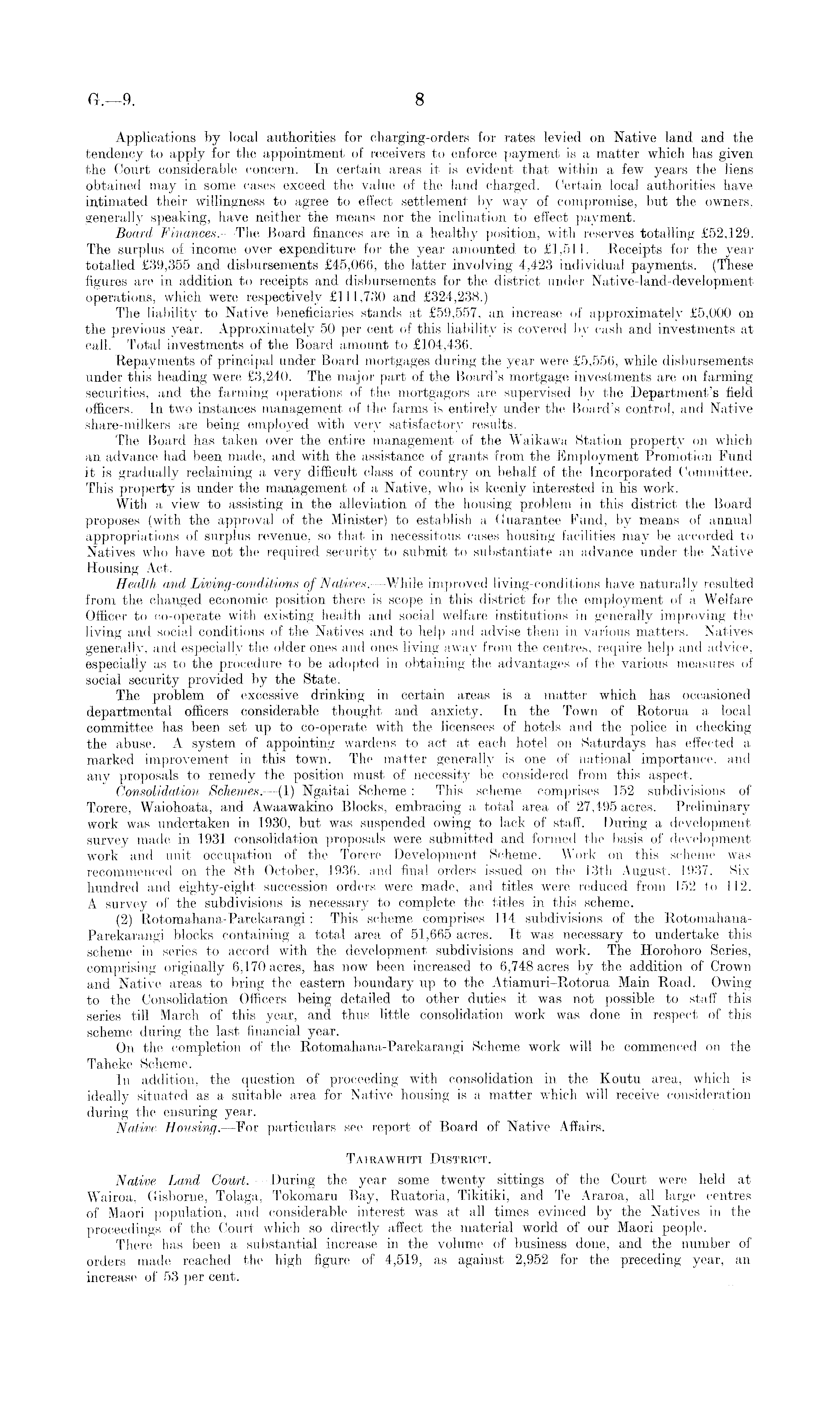 Applications by local authorities for charging-orders for rates levied on Native land and the tendency to apply for the appointment of receivers to enforce payment is a matter which has given the Court considerable concern. In certain areas it is evident that within a few years the liens obtained may in some cases exceed the value of the land charged. Certain local authorities have intimated their willingness to agree to effect settlement by way of compromise, but the owners, generally speaking, have neither the means nor the inclination to effect payment. Board Finances. —The Board finances are in a healthy position, with reserves totalling £52,129. The surplus of income over expenditure for the year amounted to £1,511. Receipts for the year totalled £39,355 and disbursements £45,066, the latter involving 4,423 individual payments. (These figures are in addition to receipts and disbursements for the district under Native-land-development operations, which were respectively £111,730 and £324,238.) The liability to Native beneficiaries stands at £59,557, an increase of approximately £5,000 on the previous year. Approximately 50 per cent of this liability is covered by cash and investments at call. Total investments of the Board amount to £104,436. Repayments of principal under Board mortgages during the year were £5,556, while disbursements under this heading were £3,240. The major part of the Board's mortgage investments are on farming securities, and the farming operations of the mortgagors are supervised by the Department's field officers. In two instances management of the farms is entirely under the Board's control, and Native share-milkers are being employed with very satisfactory results. The Board has taken over the entire management of the Waikawa Station property on which an advance had been made, and with the assistance of grants from the Employment Promotion Fund it is gradually reclaiming a very difficult class of country on behalf of the Incorporated Committee. This property is under the management of a Native, who is keenly interested in his work. With a view to assisting in the alleviation of the housing problem in this district the Board proposes (with the approval of the Minister) to establish a Guarantee Fund, by means of annual appropriations of surplus revenue, so that in necessitous cases housing facilities may be accorded to Natives who have not the required security to submit to substantiate an advance under the Native Housing Act. Health and Living-conditions of Natives. —While improved living-conditions have naturally resulted from the changed economic position there is scope in this district for the employment of a Welfare Officer to co-operate with existing health and social welfare institutions in generally improving the living and social conditions of the Natives and to help and advise them in various matters. Natives generally, and especially the older ones and ones living away from the centres, require help and advice, especially as to the procedure to be adopted in obtaining the advantages of the various measures of social security provided by the State. The problem of excessive drinking in certain areas is a matter which has occasioned departmental officers considerable thought and anxiety. In the Town of Rotorua a local committee has been set up to co-operate with the licensees of hotels and the police in checking the abuse. A system of appointing wardens to act at each hotel on Saturdays has effected a marked improvement in this town. The matter generally is one of national importance, and any proposals to remedy the position must of necessity be considered from this aspect. Consolidation Schemes.—(l) Ngaitai Scheme: This scheme comprises 152 subdivisions of Torere, Waiohoata, and Awaawakino Blocks, embracing a total area of 27,495 acres. Preliminary work was undertaken in 1930, but was suspended owing to lack of staff. During a development survey made in 1931 consolidation proposals were submitted and formed the basis of development work and unit occupation of the Torere Development Scheme. Work on this scheme was recommenced on the Bth October, 1936, and final orders issued on the 13th August, 1937. Six hundred and eighty-eight succession orders were made, and titles were reduced from 152 to 112. A survey of the subdivisions is necessary to complete the titles in this scheme. (2) Rotomahana-Parekarangi: This scheme comprises 114 subdivisions of the RotomahanaParekarangi blocks containing a total area of 51,665 acres. It was necessary to undertake this scheme in series to accord with the development subdivisions and work. The Horohoro Series, comprising originally 6,170 acres, has now been increased to 6,748 acres by the addition of Crown and Native areas to bring the eastern boundary up to the Atiamuri-Rotorua Main Road. Owing to the Consolidation Officers being detailed to other duties it was not possible to staff this series till March of this year, and thus little consolidation work was done in respect of this scheme during the last financial year. On the completion of the Rotomahana-Parekarangi Scheme work will be commenced on the Taheke Scheme. In addition, the question of proceeding with consolidation in the Koutu area, which is ideally situated as a suitable area for Native housing is a matter which will receive consideration during the ensuring year. Native Housing.—For particulars see report of Board of Native Affairs. Tairawhiti District. Native Land Court. — During the year some twenty sittings of the Court were held at Wairoa, Gisborne, Tolaga, Tokomaru Bay, Ruatoria, Tikitiki, and Te Araroa, all large centres of Maori population, and considerable interest was at all times evinced by the Natives in the proceedings of the Court which so directly affect the material world of our Maori people. There has been a substantial increase in the volume of business done, and the number of orders made, reached the high figure of 4,