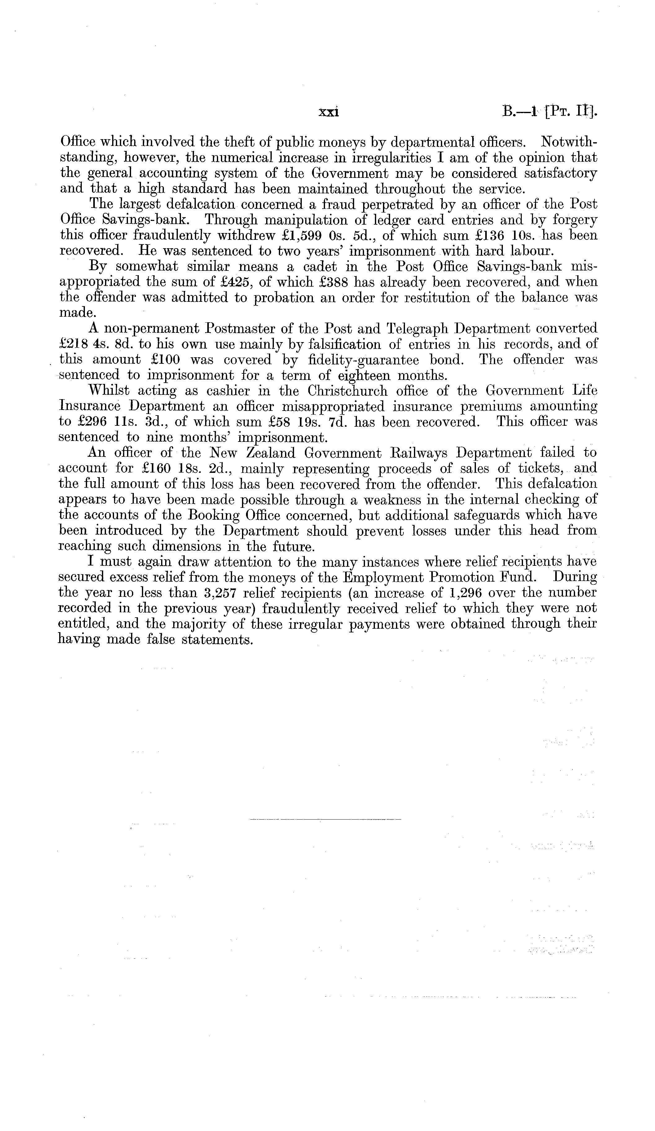Office which involved the theft of public moneys by departmental officers. Notwithstanding, however, the numerical increase in irregularities I am of the opinion that the general accounting system of the Government may be considered satisfactory and that a high standard has been maintained throughout the service. The largest defalcation concerned a fraud perpetrated by an officer of the Post Office Savings-bank. Through manipulation of ledger card entries and by forgery this officer fraudulently withdrew £1,599 Os. 5d., of which sum £136 10s. has been recovered. He was sentenced to two years' imprisonment with hard labour. By somewhat similar means a cadet in the Post Office Savings-bank misappropriated the sum of £425, of which £388 has already been recovered, and when the offender was admitted to probation an order for restitution of the balance was made. A non-permanent Postmaster of the Post and Telegraph Department converted £218 4s. Bd. to his own use mainly by falsification of entries in his records, and of this amount £100 was covered by fidelity-guarantee bond. The offender was sentenced to imprisonment for a term of eighteen months. Whilst acting as cashier in the Christchurch office of the Government Life Insurance Department an officer misappropriated insurance premiums amounting to £296 11s. 3d., of which sum £58 19s. 7d. has been recovered. This officer was sentenced to nine months' imprisonment. An officer of the New Zealand Government Eailways Department failed to account for £160 18s. 2d., mainly representing proceeds of sales of tickets, and the full amount of this loss has been recovered from the offender. This defalcation appears to have been made possible through a weakness in the internal checking of the accounts of the Booking Office concerned, but additional safeguards which have been introduced by the Department should prevent losses under this head from reaching such dimensions in the future. I must again draw attention to the many instances where relief recipients have secured excess relief from the moneys of the Employment Promotion Fund. During the year no less than 3,257 relief recipients (an increase of 1,296 over the number recorded in the previous year) fraudulently received relief to which they were not entitled, and the majority of these irregular payments were obtained through their having made false statements.