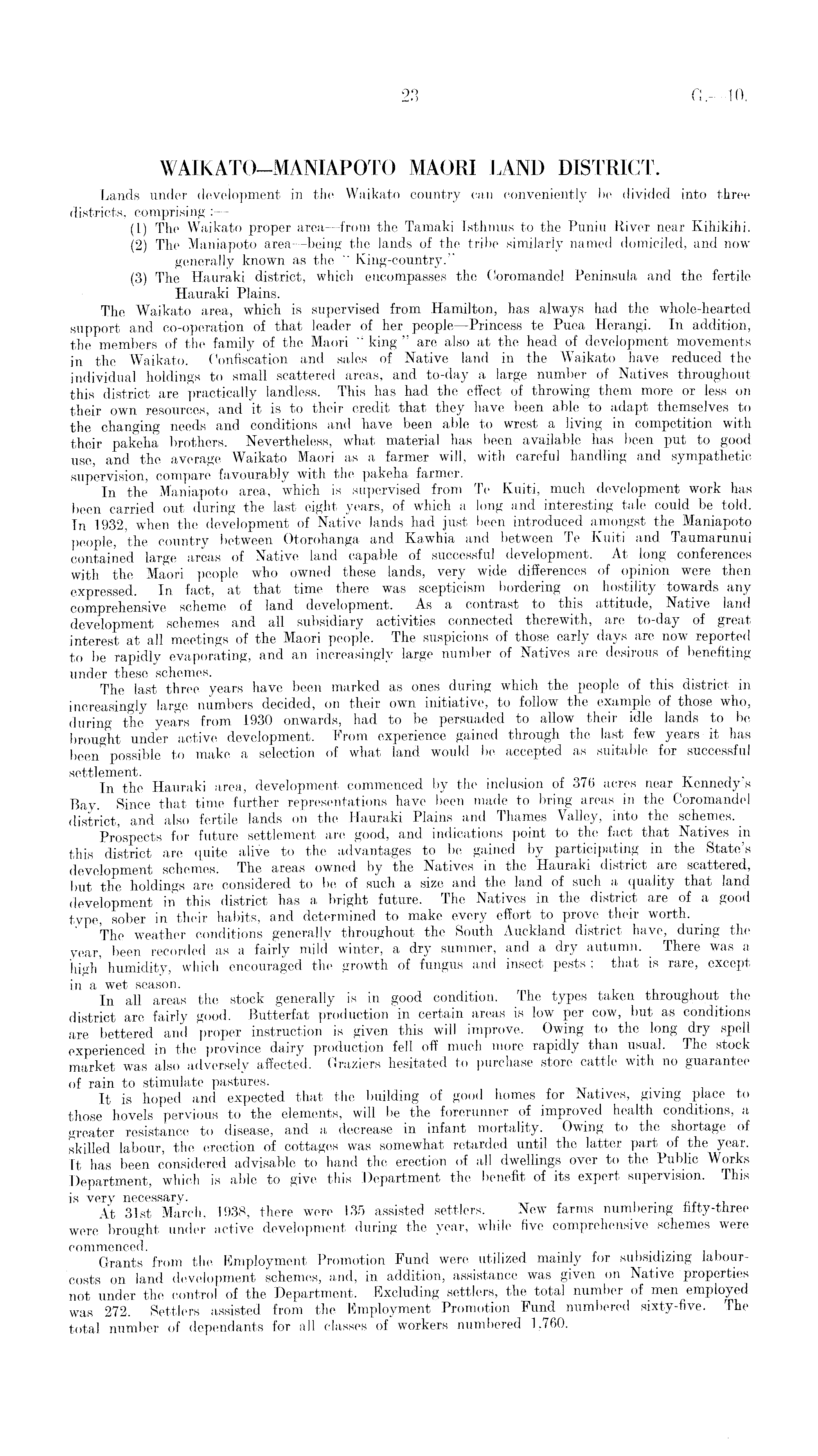 WAIKATO—MANIAPOTO MAORI LAND DISTRICT. Lands under development in the Waikato country can conveniently be divided into three districts, comprising : — (1) The Waikato proper area —from the Tamaki Isthmus to the Puniu River near Kihikihi. (2) The Maniapoto area —being the lands of the tribe similarly named domiciled, and now generally known as the " King-country." (3) The Hauraki district, which encompasses the Coromandel Peninsula and the fertile Hauraki Plains. The Waikato area, which is supervised from Hamilton, has always had the whole-hearted support and co-operation of that leader of her people —Princess te Puea Herangi. In addition, the members of the family of the Maori " king " are also at the head of development movements in the Waikato. Confiscation and sales of Native land in the Waikato have reduced the individual holdings to small scattered areas, and to-day a large number of Natives throughout this district are practically landless. This has had the effect of throwing them more or less on their own resources, and it is to their credit that they have been able to adapt themselves to the changing needs and conditions and have been able to wrest a living in competition with their pakeha brothers. Nevertheless, what material has been available has been put to good use, and the average Waikato Maori as a farmer will, with careful handling and sympathetic supervision, compare favourably with the pakeha farmer. In the Maniapoto area, which is supervised from Te Kuiti, much development Work has been carried out during the last eight years, of which a long and interesting tale could be told. In 1932, when the development of Native lands had just been introduced amongst the Maniapoto people, the country between Otorohanga and Kawhia and between Te Kuiti and Taumarunui contained large areas of Native land capable of successful development. At long conferences with the Maori people who owned these lands, very wide differences of opinion were then expressed. In fact, at that time there was scepticism bordering on hostility towards any comprehensive scheme of land development. As a contrast to this attitude, Native land development schemes and all subsidiary activities connected therewith, are to-day of great interest at all meetings of the Maori people. The suspicions of those early days are now reported to be rapidly evaporating, and an increasingly large number of Natives are desirous of benefiting under these schemes. The last three years have been marked as ones during which the people of this district in increasingly large numbers decided, on their own initiative, to follow the example of those who, during the years from 1930 onwards, had to be persuaded to allow their idle lands to be brought under active development. From experience gained through the last few years it has been possible to make a selection of what - land would be accepted as suitable for successful settlement. In the Hauraki area, development commenced by the inclusion of 376 acres near Kennedy s Bay. Since that time further representations have been made to bring areas in the Coromandel district, and also fertile lands on the Hauraki Plains and Thames Valley, into the schemes. Prospects for future settlement are good, and indications point to the fact that Natives in this district are quite alive to the advantages to be gained by participating in the State's developmptit, schemes. The a.reas owned by the Natives m the Hauraki district are scattered, but the holdings are considered to be of such a size and the land of such a quality that land development in this district has a bright future. The Natives in the district are of a good type, sober in their habits, and determined to make every effort to prove their worth. The weather conditions generally throughout the South Auckland district have, during the year, been recorded as a fairly mild winter, a dry summer, and a dry autumn. There was a high humidity, which encouraged the growth of fungus and insect pests ; that is rare, except in a wet season. In all areas the stock generally is in good condition. The types taken throughout the district are fairly good. Butterfat production in certain areas is low per cow, but as conditions are bettered and proper instruction is given this will improve. Owing to the long dry spell experienced in the province dairy production fell off much more rapidly than usual. The stock market was also adversely affected. Graziers hesitated to purchase store cattle with no guarantee of rain to stimulate pastures. It is hoped and expected that the building of good homes for Natives, giving place to those hovels pervious to the elements, will be the forerunner of improved health conditions, a greater resistance to disease, and a decrease in infant mortality. Owing to the shortage of skilled labour, the erection of cottages was somewhat retarded until the latter part of the year. It has been considered advisable to hand the erection of all dwellings over to the Public Works Department, which is able to give this Department the benefit of its expert supervision. This is very necessary. At 31st March, 1938, there were 135 assisted settlers. New farms numbering fifty-three were brought under active development during the year, while five comprehensive schemes were commenced. . , , Grants from the Employment Promotion Fund were utilized mainly for subsidizing labourcosts on land development schemes, and, in addition, assistance was given on Native properties not under the control of the Department. Excluding settlers, the total number of men employed was 272. Settlers assisted from the Employment Promotion Fund numbered sixty-five. The total number of dependants for all classes of workers numbered 1,760.