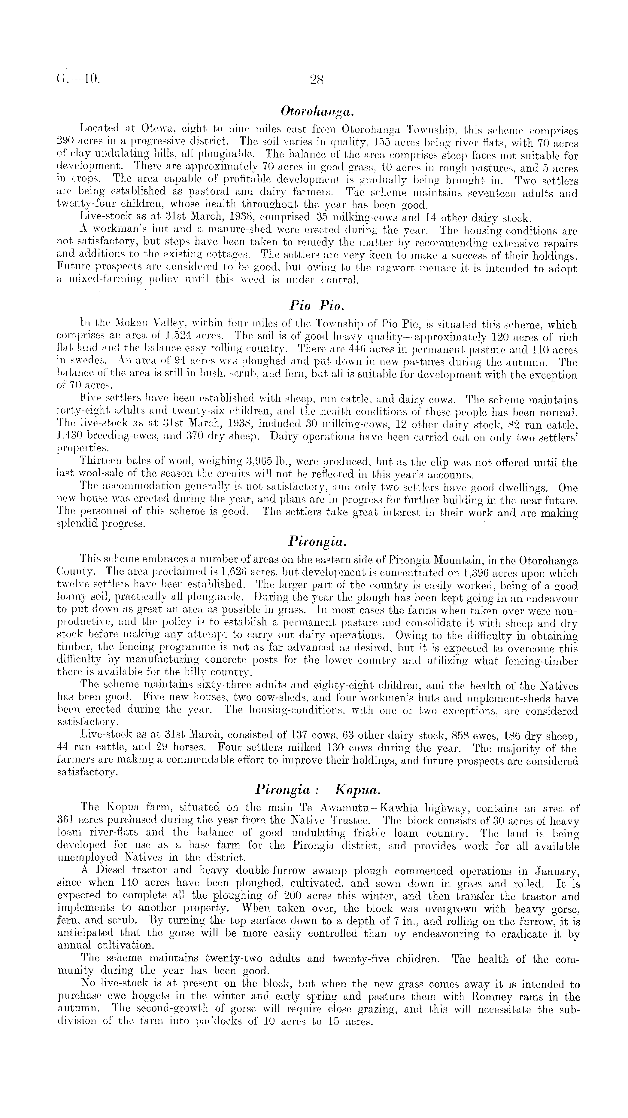 Otorohanga. Located at Otewa, eight to nine miles east from Otorohanga Township, this scheme comprises 290 acres in a progressive district. The soil varies in quality, 155 acres being river flats, with 70 acres of clay undulating hills, all ploughable. The balance of the area comprises steep faces not suitable for development. There are approximately 70 acres in good grass, 40 acres in rough pastures, and 5 acres in crops. The area capable of profitable development is gradually being brought in. Two settlers are being established as pastoral and dairy farmers. The scheme maintains seventeen adults and twenty-four children, whose health throughout the year has been good. Live-stock as at 31st March, 1938, comprised 35 milking-cows and 14 other dairy stock. A workman s hut and a manure-shed were erected during the year. The housing conditions are not satisfactory, but steps have been taken to remedy the matter by recommending extensive repairs and additions to the existing cottages. The settlers are very keen to. make a success of their holdings. Future prospects are considered to be good, but owing to the ragwort menace it is intended to adopt a mixed-farming policy until this weed is under control. Pio Pio. In the Mokau Valley, within four miles of the Township of Pio Pio, is situated this scheme, which comprises an area of 1,524 acres. The soil is of good heavy quality —approximately 120 acres of rich flat land and the balance easy rolling country. There are 446 acres in permanent pasture and 110 acres in swedes. An area of 94 acres was ploughed and put down in new pastures during the autumn. The balance of the area is still in bush, scrub, and fern, but all is suitable for development with the exception of 70 acres. Five settlers have been established with sheep, run cattle, and dairy cows. The scheme maintains forty-eight adults and twenty-six children, and the health conditions of these people has been normal. The live-stock as at 31st March, 1938, included 30 milking-cows, 12 other dairy stock, 82 run cattle, 1,430 breeding-ewes, and 370 dry sheep. Dairy operations have been carried out on only two settlers' properties. Thirteen bales of wool, weighing 3,965 lb., were produced, but as the clip was not offered until the last wool-sale of the season the credits will not be reflected in this year's accounts. The accommodation generally is not satisfactory, and only two settlers have good dwellings. One new house was erected during the year, and plans are in progress for further building in the near future. The personnel of this scheme is good. The settlers take great interest in their work and are making splendid progress. Pirongia. This scheme embraces a number of areas on the eastern side of Pirongia Mountain, in the Otorohanga County. The area proclaimed is 1,626 acres, but development is concentrated on 1,396 acres upon which twelve settlers have been established. The larger part of the country is easily worked, being of a good loamy soil, practically all ploughable. During the year the plough has been kept going in an endeavour to put down as great an area as possible in grass. In most cases the farms when taken over were nonproductive, and the policy is to establish a permanent pasture and consolidate it with sheep and dry stock before making any attempt to carry out dairy operations. Owing to the difficulty in obtaining timber, the fencing programme is not as far advanced as desired, but it is expected to overcome this difficulty by manufacturing concrete posts for the lower country and utilizing what fencing-timber there is available for the hilly country. The scheme maintains sixty-three adults and eighty-eight children, and the health of the Natives has been good. Five new houses, two cow-sheds, and four workmen's huts and implement-sheds have been erected during the year. The housing-conditions, with one or two exceptions, are considered satisfactory. Live-stock as at 31st March, consisted of 137 cows, 63 other dairy stock, 858 ewes, 186 dry sheep, 44 run cattle, and 29 horses. Four settlers milked 130 cows during the year. The majority of the farmers are making a commendable effort to improve their "holdings, and future prospects are considered satisfactory. Pirongia : Kopua. The Kopua farm, situated on the main Te Awamutu - Kawhia highway, contains an area of 361 acres purchased during the year from the Native Trustee. The block consists of 30 acres of heavy loam river-flats and the balance of good undulating friable loam country. The land is being developed for use as a base farm for the Pirongia district, and provides work for all available unemployed Natives in the district. A Diesel tractor and heavy double-furrow swamp plough commenced operations in January, since when 140 acres have been ploughed, cultivated, and sown down in grass and rolled. It is expected to complete all the ploughing of 200 acres this winter, and then transfer the tractor and implements to another property. When taken over, the block was overgrown with heavy gorse, fern, and scrub. By turning the top surface down to a depth of 7 in., and rolling on the furrow, it is anticipated that the gorse will be more easily controlled than by endeavouring to eradicate it by annual cultivation. The scheme maintains twenty-two adults and twenty-five children. The health of the community during the year has been good. No live-stock is at present on the block, but when the new grass comes away it is intended to purchase ewe hoggets in the winter and early spring and pasture them with Romney rams in the autumn. The second-growth of gorse will require close grazing, and this will necessitate the subdivision of the farm into paddocks of 10 acres to 15 acres.