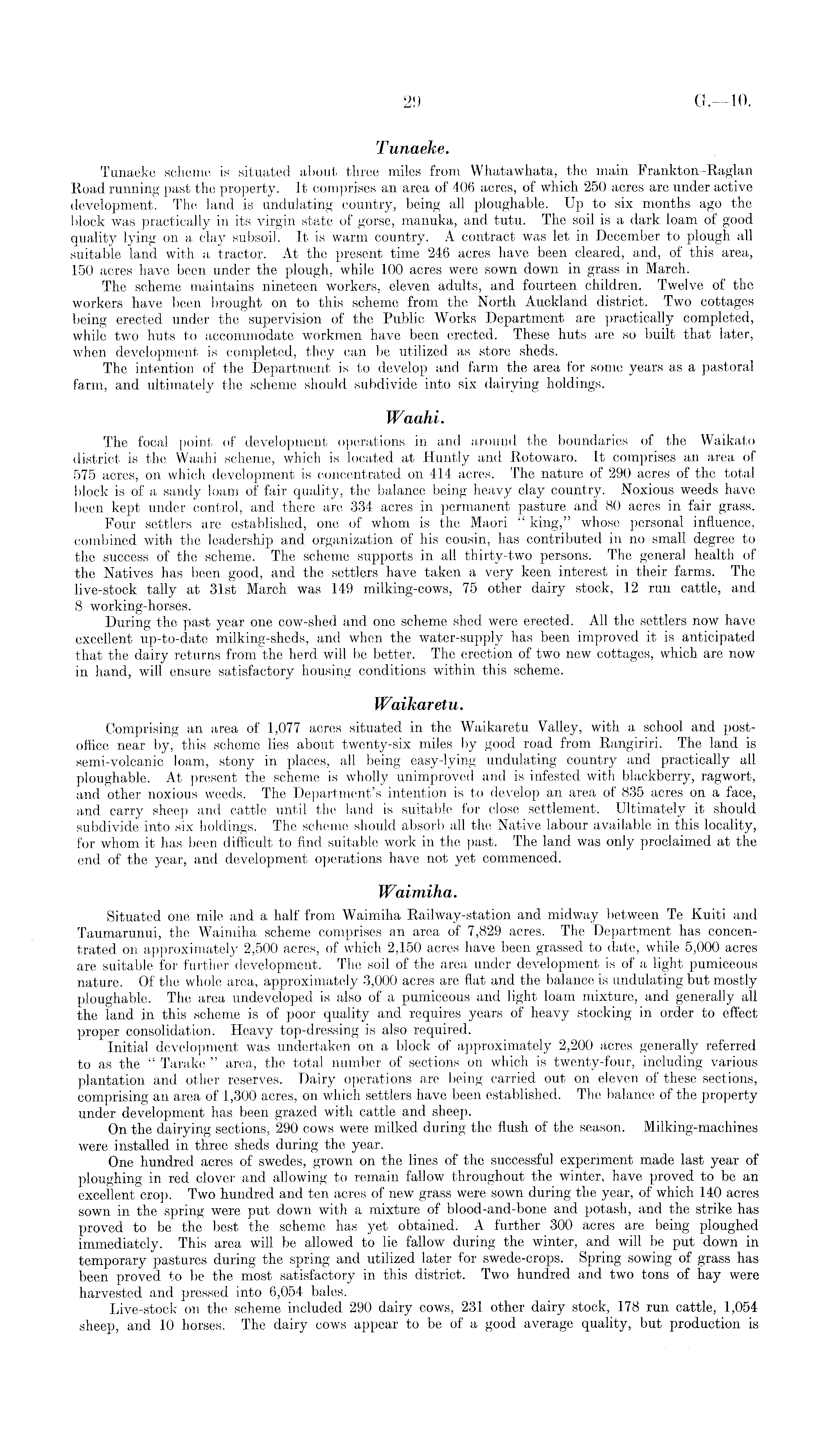 Tunaeke. Tunaeke scheme is situated about three miles from Whatawhata, the main Frankton-Raglan Road running past the property. It comprises an area of 406 acres, of which 250 acres are under active development. The land is undulating country, being all ploughable. Up to six months ago the block was practically in its virgin state of gorse, manuka, and tutu. The soil is a dark loam of good quality lying on a clay subsoil. It is warm country. A contract was let in December to plough all suitable land with a tractor. At the present time 246 acres have been cleared, and, of this area, 150 acres have been under the plough, while 100 acres were sown down in grass in March. The scheme maintains nineteen workers, eleven adults, and fourteen children. Twelve of the workers have been brought on to this scheme from the North Auckland district. Two cottages being erected under the supervision of the Public Works Department are practically completed, while two huts to accommodate workmen have been erected. These huts are so built that later, when development is completed, they can be utilized as store sheds. The intention of the Department is to develop and farm the area for some years as a pastoral farm, and ultimately the scheme should subdivide into six dairying holdings. Waahi. The focal point of development operations in and around the boundaries of the Waikato district is the Waahi scheme, which is located at Huntly and Rotowaro. It comprises an area of 575 acres, on which development is concentrated on 414 acres. The nature of 290 acres of the total block is of a sandy loam of fair quality, the balance being heavy clay country. Noxious weeds have been kept under control, and there are 334 acres in permanent pasture and 80 acres in fair grass. Four settlers are established, one of whom is the Maori " king," whose personal influence, combined with the leadership and organization of his cousin, has contributed in no small degree to the success of the scheme. The scheme supports in all thirty-two persons. The general health of the Natives has been good, and the settlers have taken a very keen interest in their farms. The live-stock tally at 31st March was 149 milking-cows, 75 other dairy stock, 12 run cattle, and 8 working-horses. During the past year one cow-shed and one scheme shed were erected. All the settlers now have excellent up-to-date milking-sheds, and when the water-supply has been improved it is anticipated that the dairy returns from the herd will be better. The erection of two new cottages, which are now in hand, will ensure satisfactory housing conditions within this scheme. Waikaretu. Comprising an area of 1,077 acres situated in the Waikaretu Valley, with a school and postoffice near by, this scheme lies about twenty-six miles by good road from Rangiriri. The land is semi-volcanic loam, stony in places, all being easy-lying undulating country and practically all ploughable. At present the scheme is wholly unimproved and is infested with blackberry, ragwort, and other noxious weeds. The Department's intention is to develop an area of 835 acres on a face, and carry sheep and cattle until the land is suitable for close settlement. Ultimately it should subdivide into six holdings. The scheme should absorb all the Native labour available in this locality, for whom it has been difficult to find suitable work in the past. The land was only proclaimed at the end of the year, and development operations have not yet commenced. Waimiha. Situated one mile and a half from Waimiha Railway-station and midway between Te Kuiti and Taumarunui, the Waimiha scheme comprises an area of 7,829 acres. The Department has concentrated on approximately 2,500 acres, of which 2,150 acres have been grassed to date, while 5,000 acres are suitable for further development. The soil of the area under development is of a light pumiceous nature. Of the whole area, approximately 3,000 acres are flat and the balance is undulating but mostly ploughable. The area undeveloped is also of a pumiceous and light loam mixture, and generally all the land in this scheme is of poor quality and requires years of heavy stocking in order to effect proper consolidation. Heavy top-dressing is also required. Initial development was undertaken on a block of approximately 2,200 acres generally referred to as the " Tarake " area, the total number of sections on which is twenty-four, including various plantation and other reserves. Dairy operations are being carried out on eleven of these sections, comprising an area of 1,300 acres, on which settlers have been established. The balance of the property under development has been grazed with cattle and sheep. On the dairying sections, 290 cows were milked during the flush of the season. Milking-machines were installed in three sheds during the year. One hundred acres of swedes, grown on the lines of the successful experiment made last year of ploughing in red clover and allowing to remain fallow throughout the winter, have proved to be an excellent crop. Two hundred and ten acres of new grass were sown during the year, of which 140 acres sown in the spring were put down with a mixture of blood-and-bone and potash, and the strike has proved to be the best the scheme has yet obtained. A further 300 acres are being ploughed immediately. This area will be allowed to lie fallow during the winter, and will be put down in temporary pastures during the spring and utilized later for swede-crops. Spring sowing of grass has been proved to be the most satisfactory in this district. Two hundred and two tons of hay were harvested and pressed into 6,054 bales. Live-stock on the scheme included 290 dairy cows, 231 other dairy stock, 178 run cattle, 1,054 sheep, and 10 horses. The dairy cows appear to be of a good average quality, but production is