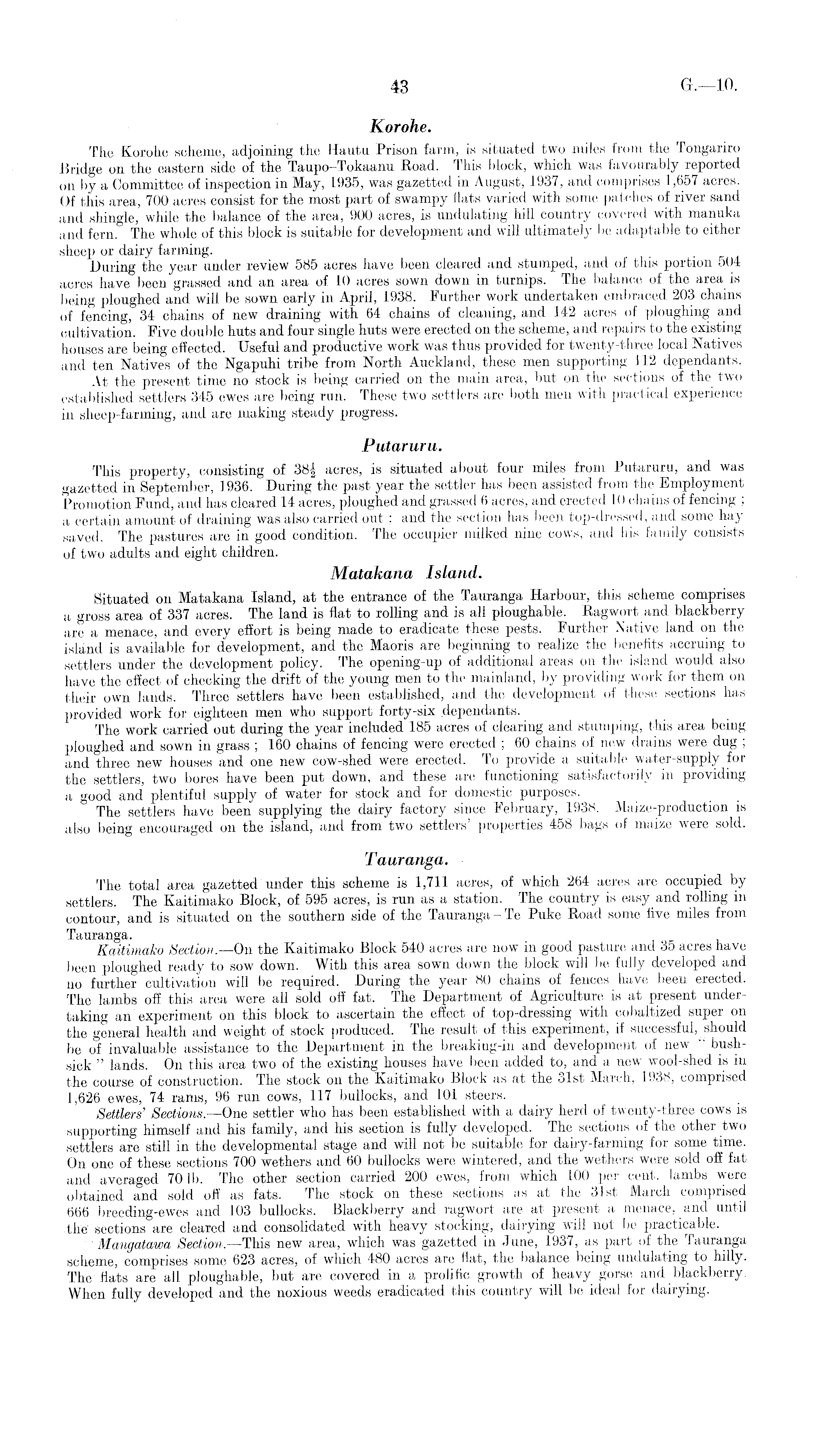Korohe. The Korohe scheme, adjoining the Hautu Prison farm, is situated two miles from the Tongariro .Bridge on the eastern side of the Taupo-Tokaanu Road. This block, which was favourably reported on by a Committee of inspection in May, 1935, was gazetted in August, 1937, and comprises 1,657 acres. Of this area, 700 acres consist for the most part of swampy flats varied with some patches of river sand and shingle, while the balance of the area, 900 acres, is undulating hill country covered with manuka and fern. The whole of this block is suitable for development and will ultimately be adaptable to either sheep or dairy farming. During the year under review 585 acres have been cleared and stumped, and of this portion 504 acres have been grassed and an area of 10 acres sown down in turnips. The balance of the area is being ploughed and will be sown early in April, 1938. Further work undertaken embraced 203 chains of fencing, 34 chains of new draining with 64 chains of cleaning, and 142 acres of ploughing and cultivation. Five double huts and four single huts were erected on the scheme, and repairs to the existing houses are being effected. Useful and productive work was thus provided for twenty-three local Natives and ten Natives of the Ngapuhi tribe from North Auckland, these men supporting 112 dependants. At the present time no stock is being carried on the main area, but on the sections of the two established settlers 345 ewes are being run. These two settlers are both men with practical experience in sheep-farming, and arc making steady progress. Putaruru. This property, consisting of 38£ acres, is situated about four miles from Putaruru, and was gazetted in September, 1936. During the past year the settler has been assisted from the Employment Promotion Fund, and has cleared 14 acres, ploughed and grassed 6 acres, and erected 10 chains of fencing ; a certain amount of draining was also carried out ; and the section has been top-dressed, and some hay saved. The pastures are in good condition. The occupier milked nine cows, and his family consists of two adults and eight children. Matakana Island. Situated on Matakana Island, at the entrance of the Tauranga Harbour, this scheme comprises a gross area of 337 acres. The land is flat to rolling and is all ploughable. Ragwort and blackberry are a menace, and every effort is being made to eradicate these pests. Further Native land on the island is available for development, and the Maoris are beginning to realize the benefits accruing to settlers under the development policy. The opening-up of additional areas on the island would also have the effect of checking the drift of the young men to the mainland, by providing work for them on their own lands. Three settlers have been established, and the development of these sections has provided work for eighteen men who support forty-six dependants. The work carried out during the year included 185 acres of clearing and stumping, this area being ploughed and sown in grass ; 160 chains of fencing were erected ; 60 chains of new drains were dug ; and three new houses and one new cow-shed were erected. To provide a suitable water-supply for the settlers, two bores have been put down, and these are functioning satisfactorily in providing a good and plentiful supply of water for stock and for domestic purposes. The settlers have been supplying the dairy factory since February, 1938. Maize-production is also being encouraged on the island, and from two settlers' properties 458 bags of maize were sold. Tauranga. The total area gazetted under this scheme is 1,711 acres, of which 264 acres are occupied by settlers. The Kaitimako Block, of 595 acres, is run as a station. The country is easy and rolling in contour, and is situated on the southern side of the Tauranga -Te Puke Road some five miles from Tauranga. Kaitimako Section— On the Kaitimako Block 540 acres are now in good pasture and 35 acres have been ploughed ready to sow down. With this area sown down the block will be fully developed and no further cultivation will be required. During the year 80 chains of fences have been erected. The lambs off this area were all sold off fat. The Department of Agriculture is at present undertaking an experiment on this block to ascertain the effect of top-dressing with cobaltized super on the general health and weight of stock produced. The result of this experiment, if successful, should be of invaluable assistance to the Department in the breaking-in and development of new " bushsick " lands. On this area two of the existing houses have been added to, and a new wool-shed is in the course of construction. The stock on the Kaitimako Block as at the 31st March, 1938, comprised 1,626 ewes, 74 rams, 96 run cows, 117 bullocks, and 101 steers. Settlers' Sections—One settler who has been established with a dairy herd of twenty-three cows is supporting himself and his family, and his section is fully developed. The sections of the other two settlers are still in the developmental stage and will not be suitable for dairy-farming for some time. On one of these sections 700 wethers and 60 bullocks were wintered, and the wethers were sold off fat and averaged 70 lb. The other section carried 200 ewes, from which 100 per cent, lambs were obtained and sold off as fats. The stock on these sections as at the 31st March comprised 666 breeding-ewes and 103 bullocks. Blackberry and ragwort are at present a menace, and until the' sections are cleared and consolidated with heavy stocking, dairying will not be practicable. Mangatawa Section. —This new area, which was gazetted in June, 1937, as part of the Tauranga scheme, comprises some 623 acres, of which 480 acres are flat, the balance being undulating to hilly. The flats are all ploughable, but are covered in a prolific growth of heavy gorse and blackberry. When fully developed and the noxious weeds eradicated this country will be ideal for dairying.