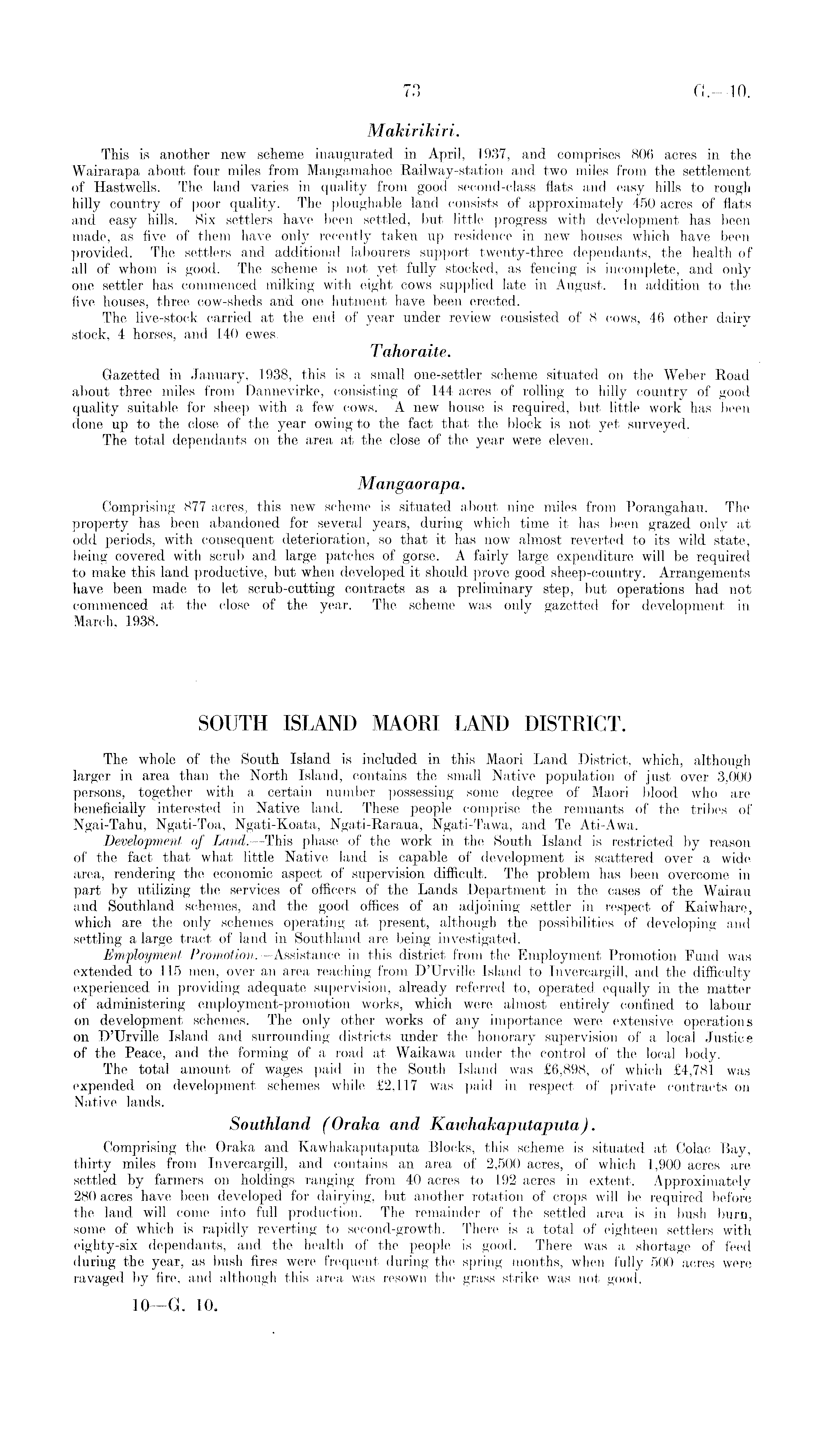 Makirikiri. This is another new scheme inaugurated in April, 1937, and comprises 806 acres in the Wairarapa about four miles from Mangamahoe Railway-station and two miles from the settlement of Hastwells. The land varies in quality from good second-class flats and easy hills to rough hilly country of poor quality. The ploughable land consists of approximately 4-50 acres of flats and easy hills. Six settlers have been settled, but little progress with development has been made, as five of them have only recently taken up residence in new houses which have been provided. The settlers and additional labourers support twenty-three dependants, the health of all of whom is good. The scheme is not yet fully stocked, as fencing is incomplete, and only one settler has commenced milking with eight cows supplied late in August. In addition to the five houses, three cow-sheds and one hutment have been erected. The live-stock carried at the end of year under review consisted of 8 cows, 46 other dairv stock, 4 horses, and 140 ewes. Tahoraite. Gazetted in January, 1938, this is a small one-settler scheme situated on the Weber Road about three miles from Dannevirke, consisting of 144 acres of rolling to hilly country of good quality suitable for sheep with a few cows. A new house is required, but little work has been done up to the close of the year owing to the fact that the block is not yet surveyed. The total dependants on the area at the close of the year were eleven. Mangaorapa. Comprising 877 acres, this new scheme is situated about nine miles from Porangahau. The property has been abandoned for several years, during which time it has been grazed only at odd periods, with consequent deterioration, so that it has now almost reverted to its wild state, being covered with scrub and large patches of gorse. A fairly large expenditure will be required to make this land productive, but when developed it should prove good sheep-country. Arrangements have been made to let scrub-cutting contracts as a preliminary step, but operations had not commenced at the close of the year. The scheme was only gazetted for development in March, 1938. SOUTH ISLAND MAORI LAND DISTRICT. The whole of the South Island is included in this Maori Land District, which, although larger in area than the North Island, contains the small Native population of just over 3,000 persons, together with a certain number possessing some degree of Maori blood who are beneficially interested in Native land. These people comprise the remnants of the tribes of Ngai-Tahu, Ngati-Toa, Ngati-Koata, Nga.ti-Raraua, Ngati-Tawa, and Te Ati-Awa. Development of Land. —This phase of the work in the South Island is restricted by reason of the fact that what little Native land is capable of development is scattered over a wide area, rendering the economic aspect of supervision difficult. The problem has been overcome in part by utilizing the services of officers of the Lands Department in the cases of the Wairau and Southland schemes, and the good offices of an adjoining settler in respect of Kaiwhare, which are the only schemes operating at present, although the possibilities of developing and settling a large tract of land in Southland are being investigated. Employment, Promotion. —Assistance in this district from the Employment Promotion Fund was extended to 115 men, over an area reaching from D'Urville Island to Invercargill, and the difficulty experienced in providing adequate supervision, already referred to, operated equally in the matter of administering employment-promotion works, which were almost entirely confined to labour on development schemes. The only other works of any importance were extensive operations on D'Urville Island and surrounding districts under the honorary supervision of a local Justice of the Peace, and the forming of a road at Waikawa under the control of the local body. The total amount of wages paid in the South Island was £6,898, of which £4,781 was expended on development schemes while £2,117 was paid in respect of private contracts on Native lands. Southland (Oraka and Kawhakaputaputa). Comprising the Oraka and Kawhakaputaputa Blocks, this scheme is situated at Colac Bay, thirty miles from Invercargill, and contains an area of 2,500 acres, of which 1,900 acres are settled by farmers on holdings ranging from 40 acres to 192 acres in extent. Approximated 280 acres have been developed for dairying, but another rotation of crops will be required before the land will come into full production. The remainder of the settled area is in bush burn, some of which is rapidly reverting to second-growth. There is a total of eighteen settlers with eighty-six dependants, and the health of the people is good. There was a shortage of feed during the year, as bush fires were frequent during the spring months, when fully 500 acres were ravaged by fire, and although this area was resown the grass strike was not good.
