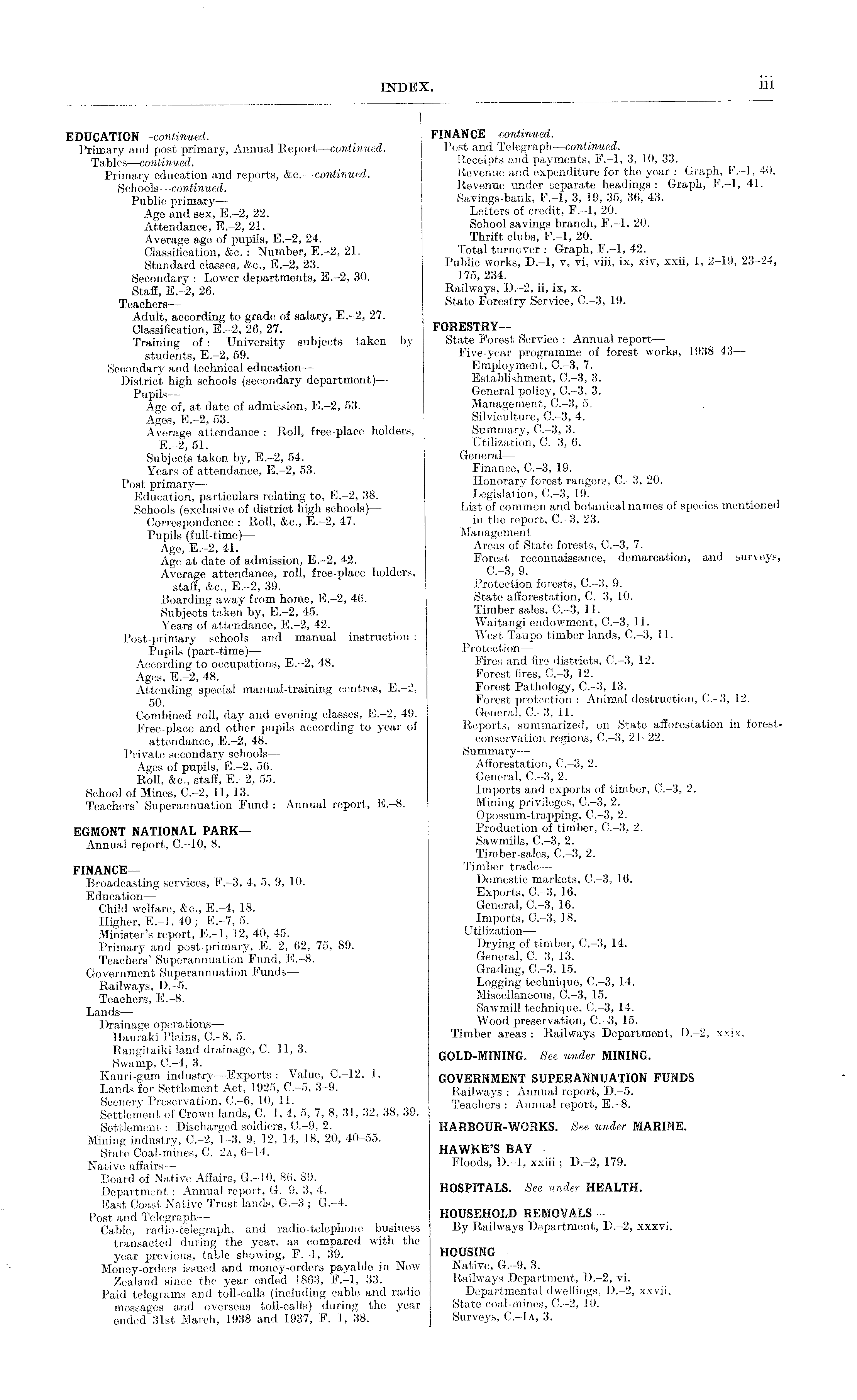 FINAN CE —continued. Post and Telegraph—continued. Receipts and payments, P.—l, 3, 10, 33. Revenue and expenditure for the year : Graph, P.-l, 40. Revenue under separate headings : Graph, P.-l, 41. Savings-bank, P.-l, 3, 19, 35, 36, 43. Letters of credit, P.-l, 20. School savings branch, P.-l, 20. Thrift clubs, F.-l, 20. Total turnover : Graph, P.-l, 42. Public works, D.-l, v, vi, viii, ix, xiv, xxii, 1, 2-19, 23-24, 175, 234. Railways, D.-2, ii, ix, x. State Forestry Service, C.-3, 19. FORESTRY— State Forest Service : Annual report — Five-year programme of forest works, 1938-43 — Employment, C.-3, 7. Establishment, C.—3, 3. General policy, C.-3, 3. Management, C.-3, 5. Silviculture, C.-3, 4. Summary, C.-3, 3. Utilization, C.-3, 6. General— Finance, C.-3, 19. Honorary forest rangers, C.-3, 20. Legislation, C.—3, 19. List of common and botanical names of species mentioned in the report, C.-3, 23. Management— Areas of State forests, C.-3, 7. Forest reconnaissance, demarcation, and surveys, C.-3, 9. Protection forests, C.—3, 9. State afforestation, C.-3, 10. Timber sales, C.-3, 11. Waitangi endowment, C.-3, 11. West Taupo timber lands, C.-3, 11. Protection — Fires and fire districts, C.-3, 12. Forest fires, C.-3, 12. Forest Pathology, C.-3, 13. Forest protection : Animal destruction, C.-3, 12. General, C.-3, 11. Reports, summarized, on State afforestation in forestconservation regions, C.-3, 21-22. Summary— Afforestation, C.-3, 2. General, C.-3, 2. Imports and exports of timber, C.-3, 2. Mining privileges, C.-3, 2. Opossum-trapping, C.-3, 2. Production of timber, C.-3, 2. Sawmills, C.-3, 2. Timber-sales, C.-3, 2. Timber trade — Domestic markets, C.-3, 16. Exports, C.-3, 16. General, C.-3, 16. Imports, C.-3, 18. Utilization — Drying of timber, C.-3, 14. General, C.-3, 13. Grading, C.-3, 15. Logging technique, C.-3, 14. Miscellaneous, C.-3, 15. Sawmill technique, C.-3, 14. Wood preservation, C.-3, 15. Timber areas : Railways Department, D.-2, xxix. GOLD-MINING. See under MINING. GOVERNMENT SUPERANNUATION FUNDS— Railways : Annual report, D.-5. Teachers : Annual report, E.-8. HARBOUR-WORKS. See under MARINE. HAWKE'S BAY— Floods, D.-l, xxiii; D.-2, 179. HOSPITALS. See under HEALTH. HOUSEHOLD REMOVALS By Railways Department, D.-2, xxxvi. HOUSING Native, G.-9, 3. Railways Department, D.-2, vi. i Departmental dwellings, D.—2, xxvii. State coal-mines, C.-2, 10. C.-la, 3.