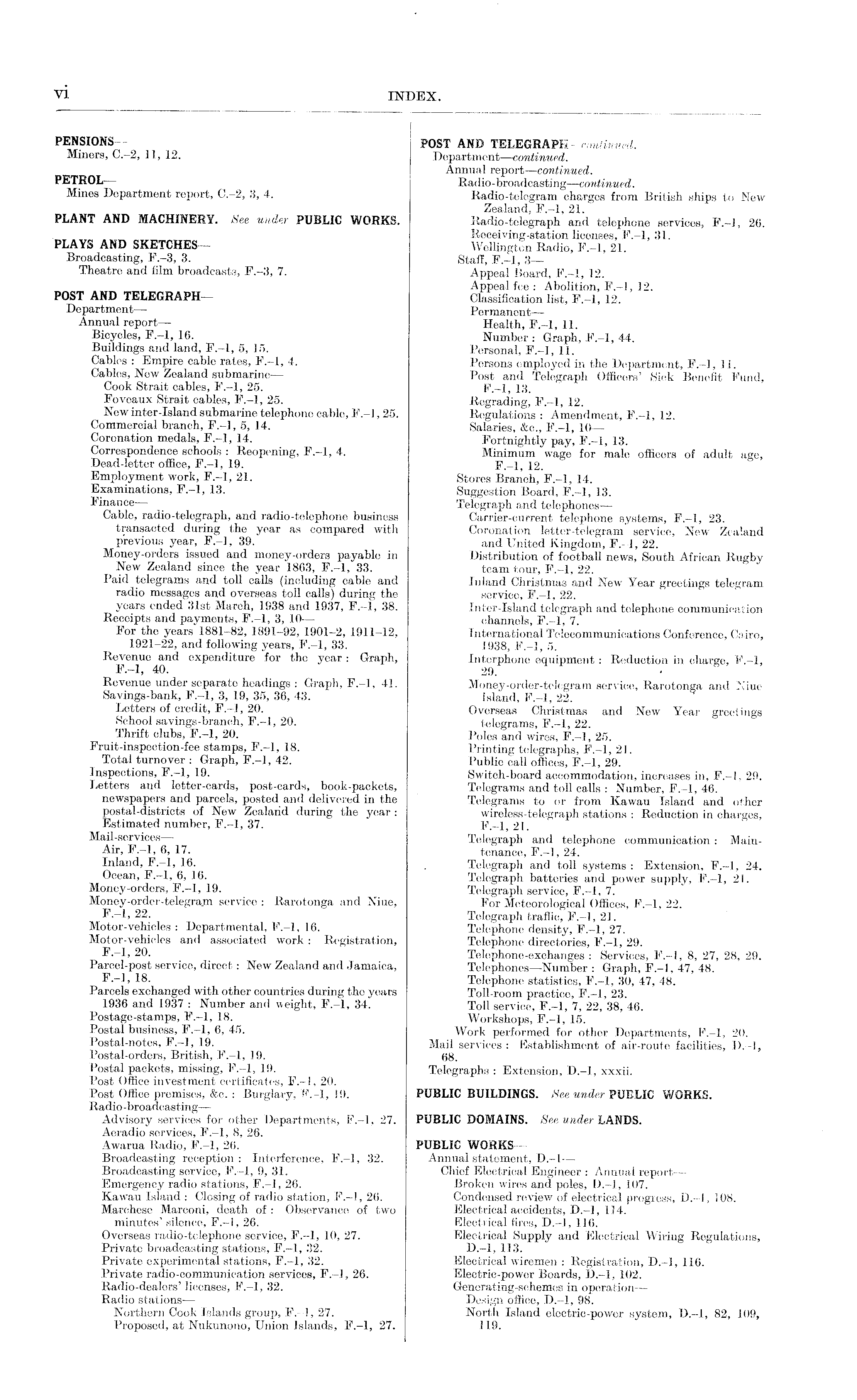 POST AND TELEGRAPH—continued. Department—continued. Annual report —continued. Radio - broadcasting—continued. Radio-telegram charges from British ships to New Zealand, F.-l, 21. Radio-telegraph and telephone services, F.-l, 26. Receiving-station licenses, F.-l, 31. Wellington Radio, F.-l, 21. Staff, F.-l, 3 — Appeal Board, F.-l, 12. Appeal fee : Abolition, F.-l, 12. Classification list, F.-l, 12. Permanent— Health, F.-l, 11. Number : Graph, F.-l, 44. Personal, F.-l, 11. Persons employed in the Department, F.-l, 11. Post and Telegraph Officers' Sick Benefit Fund, F.-l, 13. Regrading, F.-l, 12. Regulations : Amendment, F.-l, 12. Salaries, &c., F.-l, 10 — Fortnightly pay, F.-l, 13. Minimum wage for male officers of adult age, F.-l, 12. Stores Branch, F.-l, 14. Suggestion Board, F.-l, 13. Telegraph and telephones— Carrier-current telephone systems, F.-l, 23. Coronation letter-telegram service, New Zealand and United Kingdom, F.-l, 22. Distribution of football news, South African Rugby team tour, F.-l, 22. Inland Christmas and New Year greetings telegram service, F.-l, 22. Inter-Island telegraph and telephone communication channels, F.-l, 7. International Telecommunications Conference, Cairo, 1938, F.-l, 5. Interphone equipment: Reduction in charge, F.-l, 29. Money-order-telegram service, Rarotonga and Niue Island, F.-l, 22. Overseas Christmas and New Year greetings telegrams, F.-l, 22. Poles and wires, F.-l, 25. Printing telegraphs, F.-l, 21. Public call offices, F.-l, 29. Switch-board accommodation, increases in, F.-l, 29. Telegrams and toll calls : Number, F.-l, 46. Telegrams to or from Kawau Island and other wireless-telegraph stations : Reduction in charges, F.-l, 21. Telegraph and telephone communication : Maintenance, F.—l, 24. Telegraph and toll systems : Extension, F.-l, 24. Telegraph batteries and power supply, F.-l, 21. Telegraph service, F.-l, 7. For Meteorological Offices, F.-l, 22. Telegraph traffic, F.-l, 21. Telephone density, F.-l, 27. Telephone directories, F.-l, 29. Telephone-exchanges : Services, F.-l, 8, 27, 28, 29. Telephones—Number : Graph, F.-l, 47, 48. Telephone statistics, F.-l, 30, 47, 48. Toll-room practice, F.-l, 23. Toll service, F.-l, 7, 22, 38, 46. Workshops, F.-l, 15. Work performed for other Departments, F.-l, 20. Mail services : Establishment of air-route facilities, D.-l, 68. Telegraphs : Extension, D.-l, xxxii. PUBLIC BUILDINGS. See under PUBLIC WORKS. PUBLIC DOMAINS. See under LANDS. PUBLIC WORKS— Annual statement, D.-l— Chief Electrical Engineer : Annual report— Broken wires and poles, D.-l, 107. Condensed review of electrical progress, D.-l, 108. Electrical accidents, D.-l, 114. Electrical fires, D.-l, 116. Electrical Supply and Electrical Wiring Regulations, D.-l, 113. Electrical wiremen : Registration, D.-l, 116. Electric-power Boards, D.-l, 102. Generating-schemes in operation— Design office, D.-l, 98. North Island electric-power system, D.-l, 82, 109, 119.