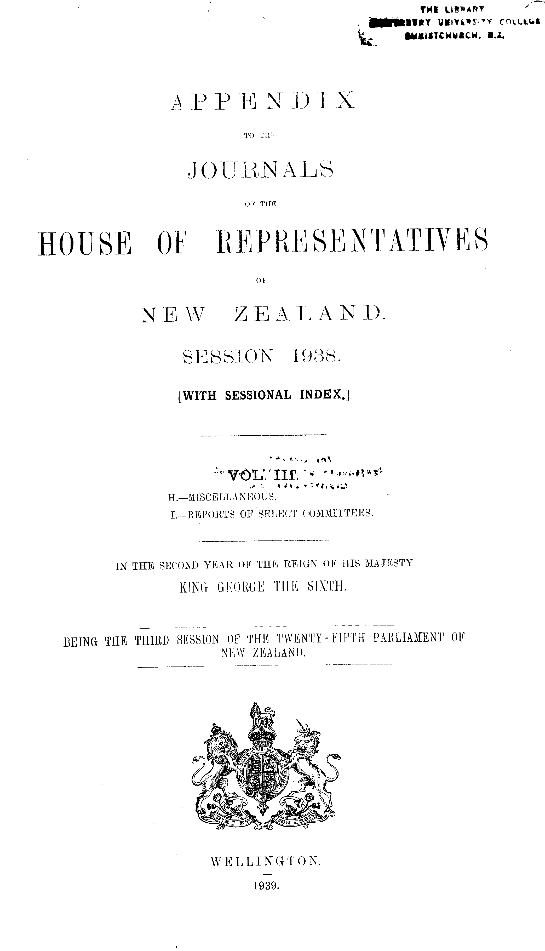 APPENDIX TO THE JOURNALS OF THE HOUSE OF REPRESENTATIVES OF NEW ZEALAND. SESSION 1938. [WITH SESSIONAL INDEX.]