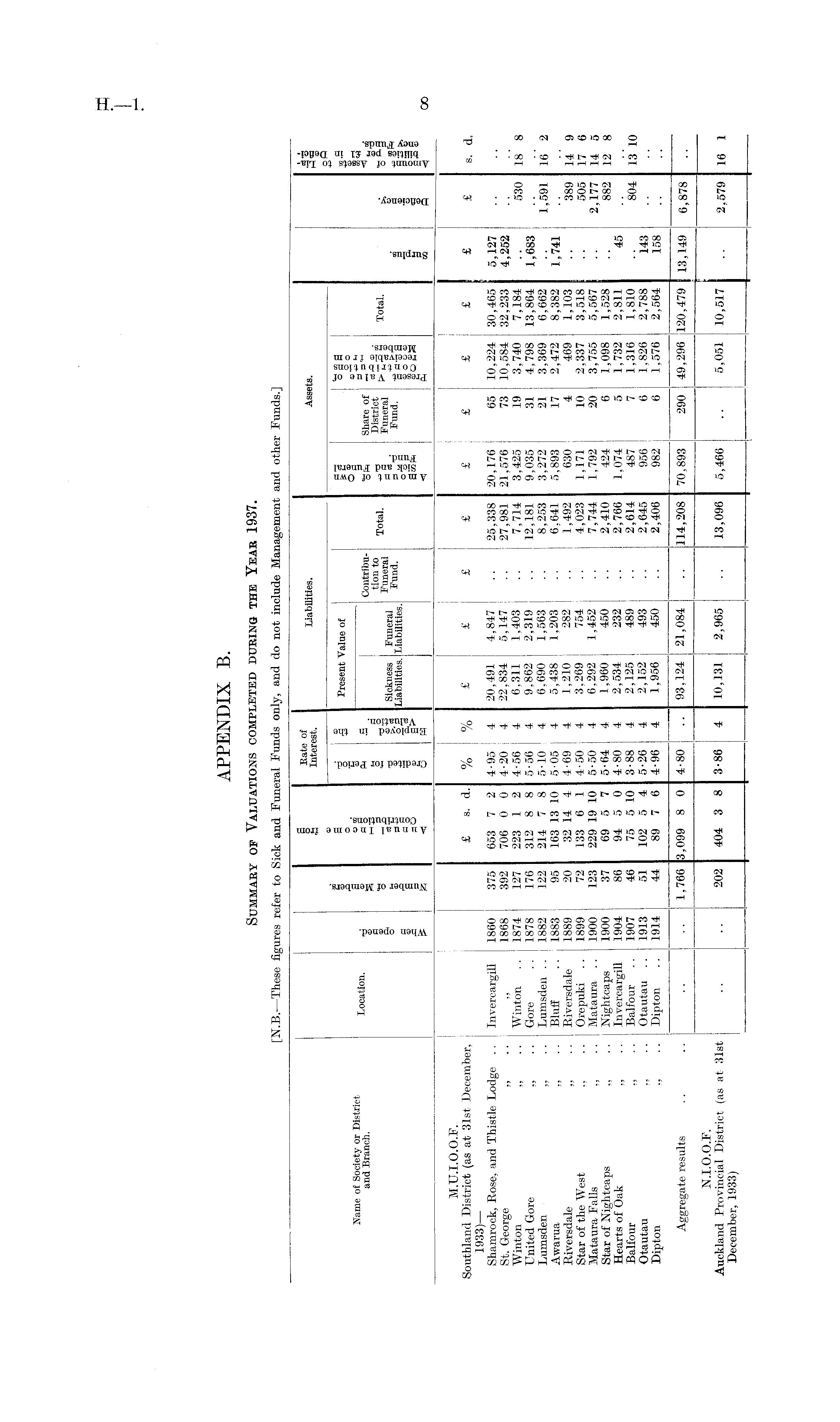 [N.B. —These figures refer to Sick and Funeral Funds only, and do not include Management and other Funds.] 2 Interest. Liabilities. Assets. „ ofi I S ? I Present Value of || ° g | S" Name of Society or District T ° § 8 a ' ° 3 a *" 3« and Branch. Location. ® flo PM .S . Contribu- o Share of — ® "I u a 5 »h P O _§ tionto T t , -j District » . ■«§.'§ a ° -2 £ " «S qiekneTO Tfunem I funeral Total - o Funeral jl a ® Total. ° § o n C T5 > oicKness funeral -ci 11T1 /i " «; S £ s OS Liabilities. Liabilities. Eund - Fund - Sfl'SS S § fso, § I a § 3 ft a 2.s3 ■a -3 lag g § ao g g!» a®P« «oSS g <g gg g g: £ o H fi M.U.I.O.O.F. Southland District (as at 31st December, £s. d. %%£ £ £ £ £ £ £ £ £ £ s. d. 1933)— ! Shamrock, Rose, and Thistle Lodge .. Invercargill 1860 375 653 7 2 4-95 4 20,491 4,847 .. 25,338 20,176 65 10,224 30,465 5,127 St. George „ „ 1868 392 706 0 0 4-20 4 22,834 5,147 .. 27,981 21,576 73 10,584 32,233 4,252 Winton ., .. Winton .. 1874 127 223 1 2 4-56 4 6,311 1,403 .. 7,714 3,425 19 3,740 7,184 .. 530 18 8 United Gore „ .. Gore .. 1878 176 312 8 8 5-56 4 9,862 2,319 .. 12,181 9,035 31 4,798 13,864 1,683 Lumsden „ .. Lumsden .. 1882 122 214 7 8 5-10 4 6,690 1,563 .. 8,253 3,272 21 3,369 6,662 .. 1,591 16 2 Awarua „ .. Bluff .. 1883 95 163 13 10 5-05 4 5,438 1,203 .. 6.641 5,893 17 2,472 8,382 1,741 Riversdale „ .. Riversdale 1889 20 32 14 4 4-69 4 1,210 282 .. 1,492 630 4 469 1,103 .. 389 14 9 Star of the West ., .. Orepuki .. 1899 72 133 6 1 4-50 4 3.269 754 .. 4,023 1,171 10 2,337 3,518 .. 505 17 6 Mataura Falls „ .. Mataura .. 1900 123 229 19 10 5-50 4 6,292 1,452 .. 7,744 1,792 20 3,755 5,567 .. 2,177 14 5 Star of Nightcaps „ .. Nightcaps 1900 37 69 5 7 5-64 4 1,960 450 .. 2,410 424 6 1,098 1,528 .. 882 12 8 Hearts of Oak „ .. Invercargill 1904 86 94 5 0 4-80 4 2,534 232 .. 2,766 1,074 5 1,732 2,811 45 Balfour „ .. Balfour .. 1907 46 75 5 10 3-88 4 2,125 489 .. 2,614 487 7 1,316 1,810 .. 804 13 10 Otautau ., .. Otautau .. 1913 51 102 5 4 5-26 4 2,152 493 .. 2,645 956 6 1,826 2,788 143 Dipton „ .. Dipton .. 1914 44 89 7 6 4-96 4 1,956 450 .. 2,406 982 6 1,576 2,564 158 Aggregate results .. .. .. .. 1,766 3,099 8 0 4-80 .. 93,124 21,084 .. 114,208 70,893 290 49,296 120,479 13,149 6,878 N.I.O.O.F. Auckland Provincial District (as at 31st .. .. 202 404 3 8 3-86 4 10,131 2,965 .. 13,096 5,466 .. 5,051 10,517 .. 2.579 16 1 December, 1933)