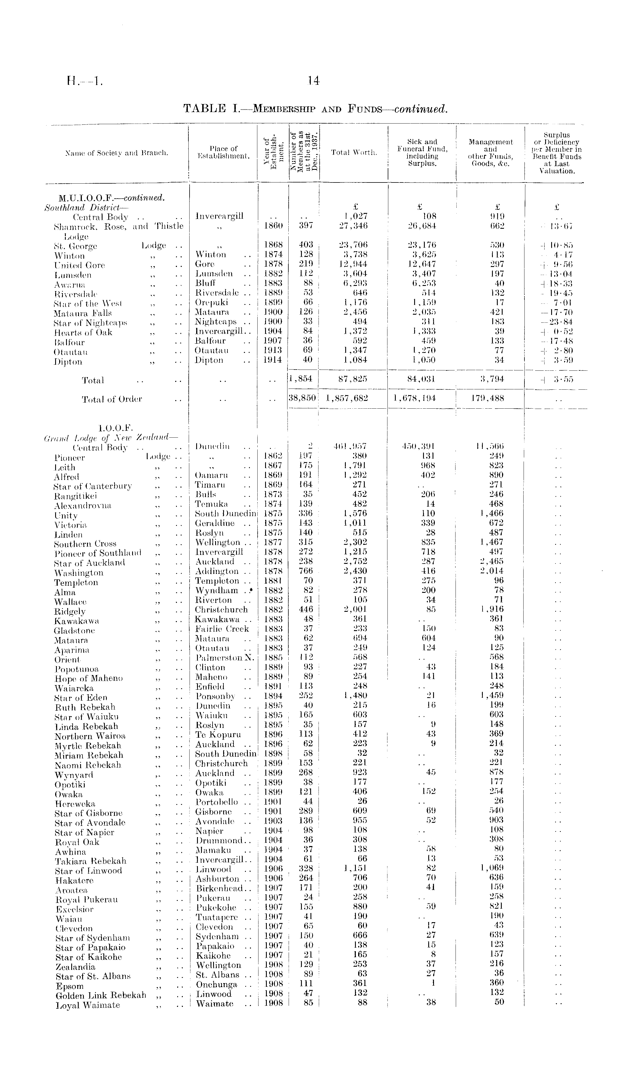 i Surplus © is 43 M 2 co o> Sick and Management or Deficiency at Place of £ ,o ® <» Tntci Funeral Fund, and per Member in Name of Society and Branch. Establishment. $«§ SsSJ Worth. including other Funds, Benefit Funds h S a *= % Surplus. Goods, &c. at last w Valuation. I M.U.I. O.O.F.—continued. Southland District — £ £ ! £ £ Central Body .. ■ * Invercargill .. .. 1,027 108 919 Shamrock, Rose, and Thistle ,, 1860 397 27,346 26,684 662 +13*67 Lodge St. George Lodge .. „ 1868 403 23,706 23,176 530 +10-85 Winton „ •• Winton .. 1874 128 3,738 3,625 | 113 -4-17 United Gore „ .. Gore .. 1878 219 12,944 12,647 297 + 9-56 Lumsden >, ■ • Lumsden .. 1882 112 3,604 3,407 197 —13*04 Awarua „ Bluff .. 1883 88 6,293 6,253 40 +18*33 Riversdale „ •• Riversdale .. 1889 53 646 514 132 —19*45 Star of the West „ .. Orepuki .. 1899 66 1,176 1,159 17 — 7*01 Mataura Falls „ •• Mataura .. 1900 126 2,456 2,035 421 —17*70 Star of Nightcaps ,, .. Nightcaps .. 1900 33 494 311 .183 —23*84 Hearts of Oak „ Invercargill.. 1904 84 1,372 1,333 39 + 0*52 Balfour „ Balfour .. 1907 36 592 459 133 -17*48 Otautau ,, •• Otautau .. 1913 69 1,347 1,270 i 77 + 2*80 Dipton „ .. Dipton .. 1914 40 1,084 1,050 34 + 3*59 Total .. ■■ •• ■■ 1.854 87,825 84,031 3,794 +3*55 Total of Order .. .. .. 38,850 1,857,682 1,678,194 179,488 I.O.O.F. Grand Lodge of New Zealand — Central Body •• •• Dunedin .. .. 2 461,957 450,391 11,566 Pioneer " Lodge .. „ . . 1862 197 380 131 249 Leith » » ■■ 1867 175 1,791 968 | 823 Alfred „ .. Oamaru .. 1869 191 1,292 402 890 Star of Canterbury „ • • Timaru .. 1869 164 271 .. j 271 Rangitikei „ • • Bulls .. 1873 35 452 206 I 246 Alexandrovna ,, ■ ■ Temuka . . 1874 139 482 14 468 Unity » •• South Dunedin 1875 336 1,576 110 1,466 Victoria „ .. Geraldine .. 1875 143 1,011 339 672 Linden >> • ■ Roslyn .. 1875 140 515 28 487 Southern Cross „ .. Wellington.. 1877 315 2,302 835 1,467 Pioneer of Southland „ .. Invercargill 1878 272 1,215 718 497 Star of Auckland „ ** Auckland .. 1878 238 2,752 287 2,465 Washington ,, . • Addington .. 1878 766 2,430 416 2,014 Templeton ,, .. Templeton .. 1881 70 371 275 96 Alma » * • Wyndham . .« 1882 82 278 200 78 Wallace >, • • Riverton .. 1882 51 105 34 71 Ridgely ,, •• Christchurc.h 1882 446 2,001 85 1,916 Kawakawa „ • • Kawakawa . . 1883 48 361 . . 361 Gladstone ,, .. Fairlie Creek 1883 37 233 150 83 Mataura » • • Mataura .. 1883 62 694 604 90 Aparima » • • Otautau . . 1883 37 249 124 125 Orient ,, .. Palmerston N. 1885 112 568 .. 568 Popotunoa „ ■ ■ Clinton . . 1889 93 227 43 184 Hope of Maheno „ •• Maheno .. 1889 89 254 141 113 Waiareka „ •• EnHeld .. 1891 113 248 .. 248 Star of Eden „ •• Ponsonby .. 1894 252 1,480 21 1,459 Ruth Rebekah „ • • Dunedin 1895 40 215 16 199 StarofWaiuku „ ** Waiuku .. 1895 165 603 .. 603 Linda Rebekah „ • • Roslyn .. 1895 35 157 9 148 Northern Wairoa „ .. Te Kopuru 1896 113 412 43 369 Myrtle Rebekah ,, ■ * Auckland .. 1896 62 223 9 214 Miriam Rebekah „ .. South Dunedin 1898 58 32 .. 32 Naomi Rebekah ,, ■ ■ Christchurch 1899 153 221 .. 221 Wvnvard ,, • • Auckland .. 1899 268 923 45 878 Opotiki „ •• Opotiki .. 1899 38 177 .. 177 Owaka „ • • Owaka .. 1899 121 406 152 254 Hereweka ,, • ■ Portobello .. 1901 44 26 . . 26 Star of Gisborne ,, • • Gisborno .. 1901 289 609 69 540 Star of Avondale ,, .. Avondale .. 1903 136 955 52 903 Star of Napier „ • ■ Napier .. 1904 98 108 .. 108 Royal Oak „ •• Drummond.. 1904 36 308 .. 308 Awhina » • • Mamaku .. 1904 37 138 58 80 Takiara Rebekah „ . * Invercargill.. 1904 61 66 13 53 Star of Linwood ,, Linwood .. 1906 328 1,151 82 1,069 Hakatere ,, .. Ashburton. .. 1906 264 706 70 636 Aroatea ,, *• Birkenhead.. 1907 171 200 41 159 Royal Pukerau ,, • • Pukerau .. 1907 24 258 . . 258 Excelsior „ ■■ Pukekohe .. 1907 155 880 59 821 Waiau „ * * Tuatapere .. 1907 41 190 .. 190 Clevedon „ ■ • Clevedon . . 1907 65 60 17 43 Star of Sydenham ,, • • Sydenham .. 1907 150 666 27 639 Star of Papakaio „ •• Papakaio .. 1907 40 138 15 1-3 Star of Kaikohe „ *• Kaikohe .. 1907 21 165 8 157 Zealandia „ • • Wellington 1908 129 253 37 216 Star of St. Albans „ .. St. Albans .. 1908 89 63 27 36 Epsom „ • ■ Onehunga . . 1908 111 361 1 360 Golden Link Rebekah „ .. Linwood .. 1908 47 132 .. 132 Loyal Waimate „ .. Waimate .. 1908 85 88 38 50