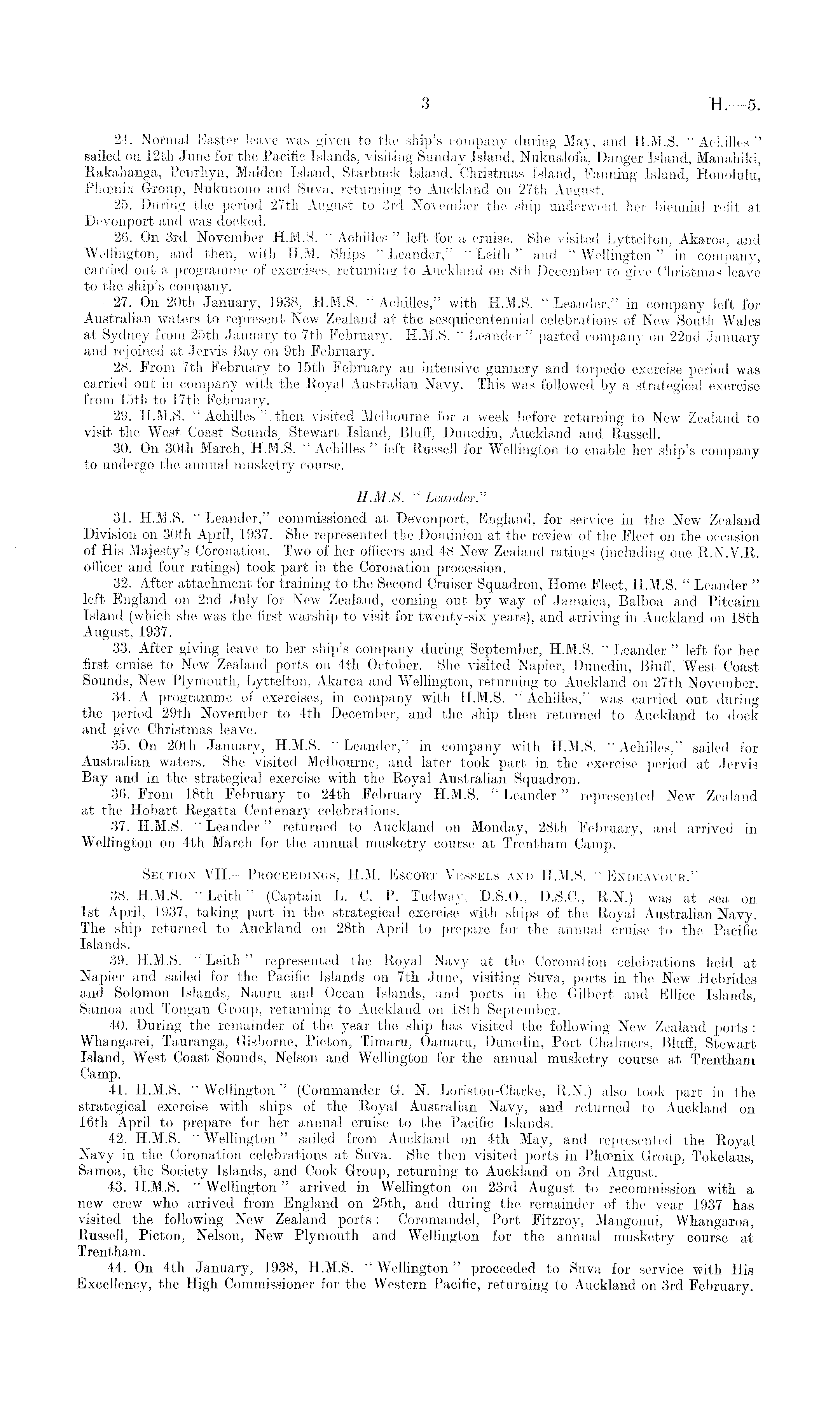 24. Normal Easter leave was given to the ship's company during May, and H.M.S. " Achilles " sailed on 12th June for the Pacific Islands, visiting Sunday Island, Nukualofa, Danger Island, Manahiki, Rakahanga, Penrhyn, Maiden Island, Starbuck Island, Christmas Island, Fanning Island, Honolulu, Phoenix Group, Nukunono and Suva, returning to Auckland on 27th August. 25. During the period 27th August to 3rd November the ship underwent her biennial refit at Devonport and was docked. 26. On 3rd November H.M.S. " Achilles " left for a cruise. She visited Lyttelton, Akaroa, and Wellington, and then, with H.M. Ships " Leander," " Leith " and " Wellington" in company, carried out a programme of exercises, returning to Auckland on Bth December to give Christmas leave to the ship's company. 27. On 20th January, 1938, H.M.S. "Achilles," with H.M.S. "Leander," in company left for Australian waters to represent New Zealand at the sesquicentennial celebrations of New South Wales at Sydney from 25th January to 7th February. H.M.S. " Leander " parted company on 22nd January and rejoined at Jervis Bay on 9th February. 28. From 7th February to 15th February an intensive gunnery and torpedo exercise period was carried out in company with the Royal Australian Navy. This was followed by a strategical exercise from 15th to 17th February. 29. H.M.S. " Achilles then visited Melbourne for a week before returning to New Zealand to visit the West Coast Sounds, Stewart Island, Bluff, Dunedin, Auckland and Russell. 30. On 30th March, H.M.S. " Achilles " left Russell for Wellington to enable her ship's company to undergo the annual musketry course. H.M.S. " Leander." 31. H.M.S. " Leander," commissioned at Devonport, England, for service in the New Zealand Division on 30th April, 1937. She represented the Dominion at the review of the Fleet on the occasion of His Majesty's Coronation. Two of her officers and 48 New Zealand ratings (including one R.N.V.R. officer and four ratings) took part in the Coronation procession. 32. After attachment for training to the Second Cruiser Squadron, Home Fleet, H.M.S. " Leander " left England on 2nd July for New Zealand, coming out by way of Jamaica, Balboa and Pitcairn Island (which she was the first warship to visit for twenty-six years), and arriving in Auckland on 18th August, 1937. 33. After giving leave to her ship's company during September, H.M.S. " Leander " left for her first cruise to New Zealand ports on 4th October. She visited Napier, Dunedin, Bluff, West Coast Sounds, New Plymouth, Lyttelton, Akaroa and Wellington, returning to Auckland on 27th November. 34. A programme of exercises, in company with H.M.S. " Achilles," was carried out during the period 29tli November to 4th December, and the ship then returned to Auckland to dock and give Christmas leave. 35. On 20th January, H.M.S. " Leander," in company with H.M.S. " Achilles," sailed for Australian waters. She visited Melbourne, and later took part in the exercise period at Jervis Bay and in the strategical exercise with the Royal Australian Squadron. 36. From 18th February to 24th February H.M.S. " Leander" represented New Zealand at the Hobart Regatta Centenary celebrations. 37. H.M.S. " Leander" returned to Auckland on Monday, 28th February, and arrived in Wellington on 4th March for the annual musketry course at Trentham Camp. Section YII. —Pboceedings, H.M. Escobt Vessels and H.M.S. " Endeavour." 38. H.M.S. "Leith" (Captain L. C. P. Tudway, D.5.0., D.S.C., R.N.) was at sea on Ist April, .1937, taking part in the strategical exercise with ships of the Royal Australian Navy. The ship returned to Auckland on 28th April to prepare for the annual cruise to the Pacific Islands. 39. H.M.S. " Leith" represented the Royal Navy at the Coronation celebrations held at Napier and sailed for the Pacific Islands on 7th June, visiting Suva, ports in the New Hebrides and Solomon Islands, Nauru and Ocean Islands, and ports in the Gilbert and Ellice Islands, Samoa and Tongan Group, returning to Auckland on 18th September. 40. During the remainder of the year the ship has visited the following New Zealand ports : Whangarei, Tauranga, Gisborne, Picton, Timaru, Oamaru, Dunedin, Port Chalmers, Bluff, Stewart Island, West Coast Sounds, Nelson and Wellington for the annual musketry course at Trentham Camp. 41. H.M.S. " Wellington" (Commander G. N. Loriston-Clarke, R.N.) also took part in the strategical exercise with ships of the Royal Australian Navy, and returned to Auckland on 16th April to prepare for her annual cruise to the Pacific Islands. 42. H.M.S. " Wellington" sailed from Auckland on 4th May, and represented the Royal Navy in the Coronation celebrations at Suva. She then visited ports in Phoenix Group, Tokelaus, Samoa, the Society Islands, and Cook Group, returning to Auckland on 3rd August. 43. H.M.S. " Wellington" arrived in Wellington on 23rd August to recommission with a new crew who arrived from England on 25th, and during the remainder of the year 1937 has visited the following New Zealand ports: Coromandel, Port Fitzroy, Mangonui, Whangaroa, Russell, Picton, Nelson, New Plymouth and Wellington for the annual musketry course at Trentham. 44. On 4th January, 1938, H.M.S. " Wellington" proceeded to Suva for service with His Excellency, the. High Commissioner for the Western Pacific, returning to Auckland on 3rd February.