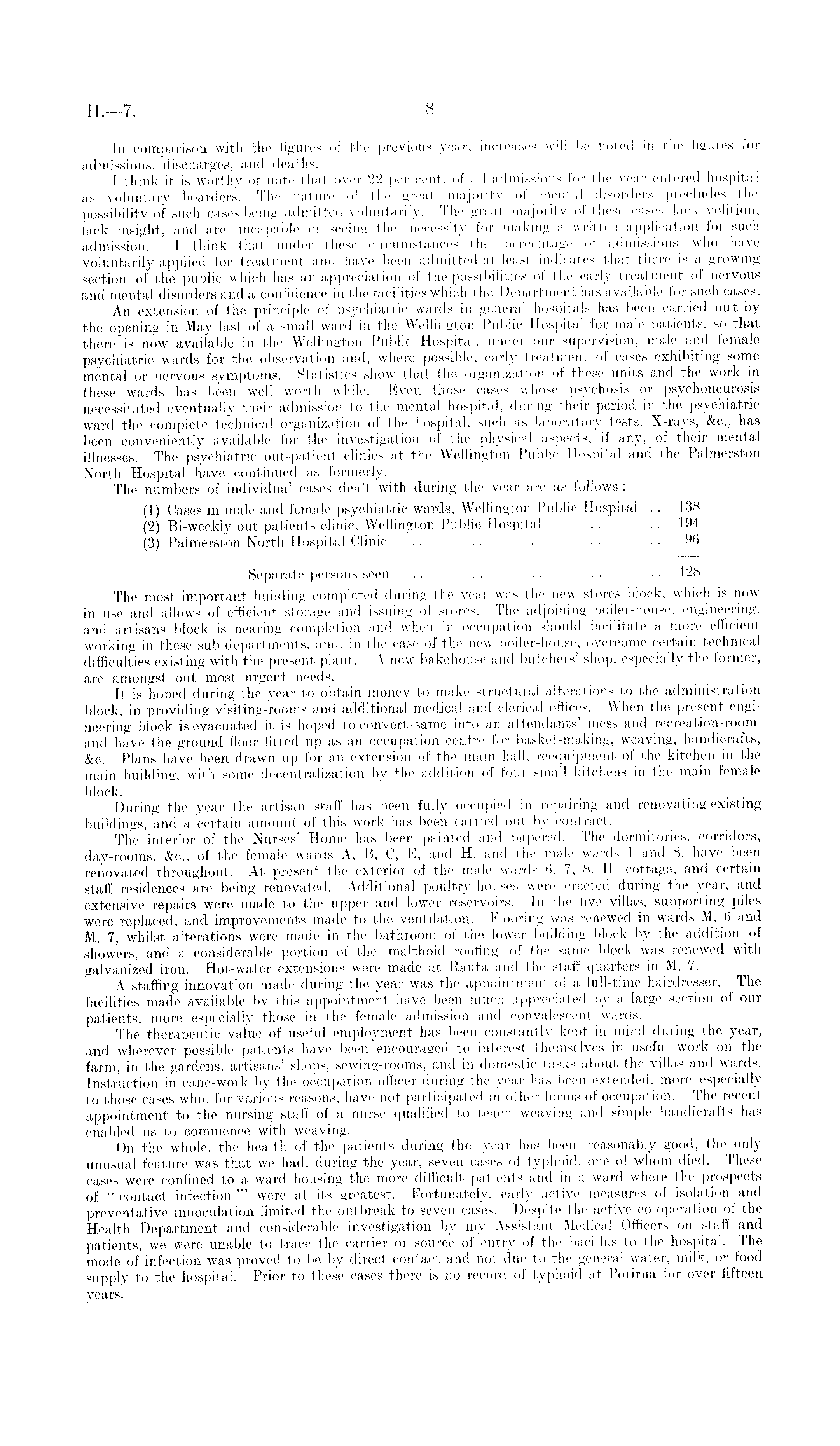 In comparison with the figures of the previous year, increases will be noted in the figures for admissions, discharges, and deaths. I think it is worthy of note that over 22 per cent, of all admissions for the year entered hospital as voluntary boarders. The nature of the great majority of mental disorders precludes the possibility of such cases being admitted voluntarily. The great majority of these cases lack volition, lack insight, and are incapable of seeing the necessity for making a written application for such admission. I think that under these circumstances the percentage of admissions who have voluntarily applied for treatment and have been admitted at least indicates that there is a growing section of the public which has an appreciation of the possibilities of the early treatment of nervous and mental disorders and a confidence in the facilities which the Department has available for such cases. An extension of the principle of psychiatric wards in general hospitals has been carried out by the opening in May last of a small ward in the Wellington Public Hospital for male patients, so that there is now available in the Wellington Public Hospital, under our supervision, male and female psychiatric wards for the observation and, where possible, early treatment of cases exhibiting some mental or nervous symptoms. Statistics show that the organization of these units and the work in these wards has been well worth while. Even those cases whose psychosis or psychoneurosis necessitated eventually their admission to the mental hospital, during their period in the psychiatric ward the complete technical organization of the hospital, such as laboratory tests, X-rays, &c., has been conveniently available for the investigation of the physical aspects, if any, of their mental illnesses. The psychiatric out-patient clinics at the Wellington Public Hospital and the Palmerston North Hospital have continued as formerly. The numbers of individual cases dealt with during the year are as follows : — (1) Cases in male and female psychiatric wards, Wellington Public Hospital .. 138 (2) Bi-weekly out-patients clinic, Wellington Public Hospital . . .. 194 (3) Palmerston North Hospital Clinic . . . . . . . . 96 Separate persons seen . . . . . • • ■ • • 428 The most important building completed during the year was the new stores block, which is now in use and allows of efficient storage and issuing of stores. The adjoining boiler-house, engineering, and artisans block is nearing completion and when in occupation should facilitate a more efficient working in these sub-departments, and, in the case of the new boiler-house, overcome certain technical difficulties existing with the present plant. A new bakehouse and butchers' shop, especially the former, are amongst out most urgent needs. It is hoped during the year to obtain money to make structural alterations to the administration block, in providing visiting-rooms and additional medical and clerical offices. When the present engineering block is evacuated it is hoped to convert same into an attendants' mess and recreation-room and have the ground floor fitted up as an occupation centre for basket-making, weaving, handicrafts, &c. Plans have been drawn up for an extension of the main hall, reequipment of the kitchen in the main building, with some decentralization by the addition of four small kitchens in the main female block. During the year the artisan staff has been fully occupied in repairing and renovating existing buildings, and a certain amount of this work has been carried out by contract. The interior of the Nurses' Home has been painted and papered. The dormitories, corridors, day-rooms, &c., of the female wards A, B, C, E, and H, and the male wards 1 and 8, have been renovated throughout. At present the exterior of the male wards 6, 7, 8, H. cottage, and certain staff residences are being renovated. Additional poultry-houses were erected during the year, and extensive repairs were made to the upper and lower reservoirs. In the five villas, supporting piles were replaced, and improvements made to the ventilation. Flooring was renewed in wards M. 6 and M. 7, whilst alterations were made in the bathroom of the lower building block by the addition of showers, and a considerable portion of the malthoid roofing of the same block was renewed with galvanized iron. Hot-water extensions were made at Rauta and the staff quarters in M. 7. A staffing innovation made during the year was the appointment of a full-time hairdresser. The facilities made available by this appointment have been much appreciated by a large section of our patients, more especially "those in the female admission and convalescent wards. The therapeutic value of useful employment has been constantly kept in mind during the year, and wherever possible patients have been encouraged to interest themselves in useful work on the farm, in the gardens, artisans' shops, sewing-rooms, and in domestic tasks about the villas and wards. Instruction in cane-work by the occupation officer during the year has been extended, more especially to those cases who, for various reasons, have not participated in other forms of occupation. The recent appointment to the nursing staff of a nurse qualified to teach weaving and simple handicrafts has enabled us to commence with weaving. On the whole, the health of the patients during the year has been reasonably good, the only unusual feature was that we had, during the year, seven cases of typhoid, one of whom died. These cases were confined to a ward housing the more difficult patients and in a ward where the prospects of " contact infection '" were at its greatest. Fortunately, early active measures of isolation and preventative innoculation limited the outbreak to seven cases. Despite the active co-operation of the Health Department and considerable investigation by my Assistant Medical Officers on staff and patients, we were unable to trace th