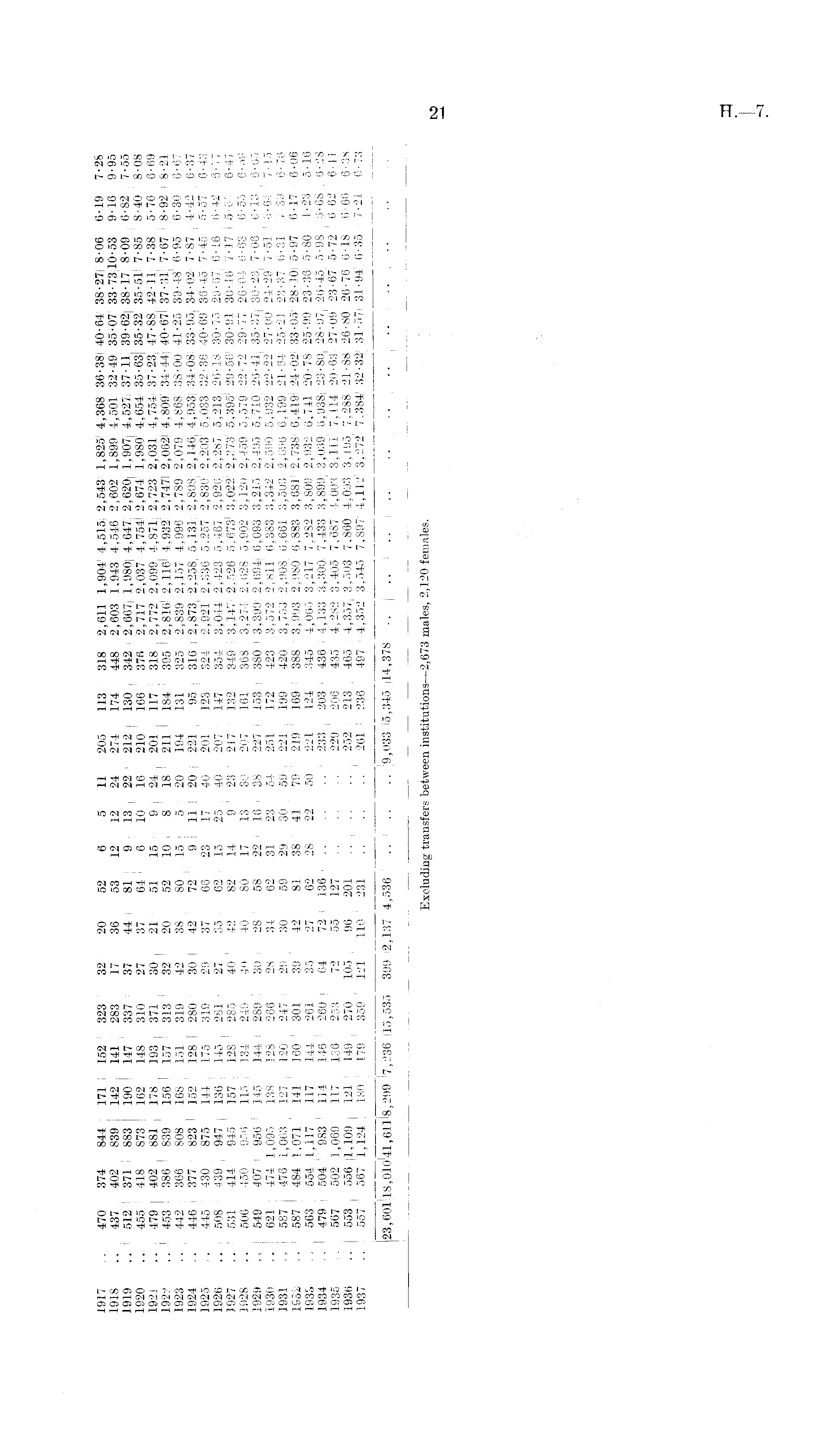 1917 .. 470 374 844 171 152 323 32 20 52 6 5 11 205 113 318 2,611 1,904 4,515 2,543 1,825 4,368 36-38 40-64 38-27 8-06 | 6-19 | 7-2S 1918 .. 437 402 839 142 141 283 17 36 53 12 12 24 274 174 448 2,603 1.943 4,546 2,602 1,899 4,501 32-49 35-07 33-7310-53 9-16 j 9-95 1919 .. 512 371 883 190 147 337 37 44 81 9 13 22 212 130 342 2,667 1,980 4,647 2,620 1,907 4,527 37-11 39-62 38-17 8-09 6-82 7-55 1920 .. 455 418 873 162 148 310 27 37 64 6 10 16 210 166 376 2,717 2,037 4,754 2,674 1,980 4,654 35-63 35-32 35-51 7-85 8-40 8-08 1921 .. 479 402 881 178 193 371 30 21 51 15 9 24 201 117 318 2,772 2,099 4,871 2,723 2,031 4,754 37-23 47-88 42-11 7-38 5-76 6-69 1922 .. 453 386 839 156 157 313 32 20 52 10 8 18 211 184 395 2,816 2,116 4,932 2,747 2,062 4,809 34-44 40-67 37-31 7-67 8-92 8-21 1923 .. 442 366 808 168 151 319 42 38 80 15 5 20 194 131 325 2,839 2,157 4,996 2,789 2,079 4,868 38-00 41-25 39-48 6-95 6-30 6-67 1924 .. 446 377 823 152 128 280 30 42 72 9 11 20 221 95 316 2,873 2,258 5,131 2,808 2,146 4,953 34-08 33-95 34-02 7-87 4-42 6-37 1925 .. 445 430 875 144 175 319 29 37 66 23 17 40 201 123 324 2,921 2,336 5,257 2,830 2,203 5,033 32-36 40-69 36-45 7-45 5-57 6-43 1926 .. 508 439 947 136 145 281 27 35 62 15 25 40 207 147 354 3,044 2,423 5,467 2,926 2,287 5,213 26-18 30-75 29-67 6-16 6-42 6-77 1927 .. 531 414 945 157 128 285 40 42 82 14 9 23 217 132 349 3,147 2,526 5,673 3,022 2,373 5,395 29-56 30-91 30-16 7-17 5-65 6-47 1928 .. 506 450 956 115 134 249 40 40 80 17 13 30 207 161 368 3,274 2,628 5,902 3,120 2,459 5,579 22-72 29-77 26-04 6-63 6-55 6-59 1929 549 407 956 145 144 289 30 28 58 22 16 38 227 153 380 3,399 2,694 6,093 3,215 2,495 5,710 26-41 35-37 30-23 7-06 6-13 6-65 1930 .. 621 474 1,095 138 128 266 28 34 62 31 23 54 251 172 423 3,572 2,811 6,383 3,342 2,590 5,932 22-22 27-00 24-29 7-51 6-64 7-15 1931 .. 587 476 1,063 127 120 247 29 30 59 29 30 59 221 199 420 3,753 2,908 6,661 3,503 2,696 6,199 21-64 25-21 23-37 6-31 7-39 6-76 1632 .. 587 484 1,071 141 160 301 39 42 81 38 41 79 219 169 388 3,903 2,980 6,883 3,681 2,738 6,419 24-02 33-05 28-10 5-97 6-17 6-06 193S .. 563 554 1,117 117 144 261 35 27 62 28 22 50 221 124 345 4,065 3,217 7,282 3,809 2,932 6,741 20-78 25-99 23-36 5-80 4-23 5-16 1934 .. 479 504 983 114 146 260 64 72 136 233 203 436 4,133 3,300 7,433 3,899 3,039 6,938 23-80 28-97 26-45 5-98 6-68 6-28 1935 .. 567 502 1,069 117 136 253 72 55 127 229 206 435 4,282 3,405 7,687 4,003 3,111 7,114 20-63 27-09 23-67 5-72 6-62 6-11 1936 .. 553 556 1,109 121 149 270 105 96 201 252 213 465 4,357 3,503 7,860 4,093 3,195 7,288 21-88 26-80 26-76 6-18 6-66 6-38 1937 .. 557 567 1,124 180 179 359 121 110 231 261 236 497 4,352 3,545 7,897 4,112 3,272 7,384 32-32 31-57 31-94 6-35 7-21 6-73 „ i i ; 23,601 18,010 41,611 8,299 7,236 15,535 399 2,137 4,536 9,033 5,345 14,378 , | ■■ I ••