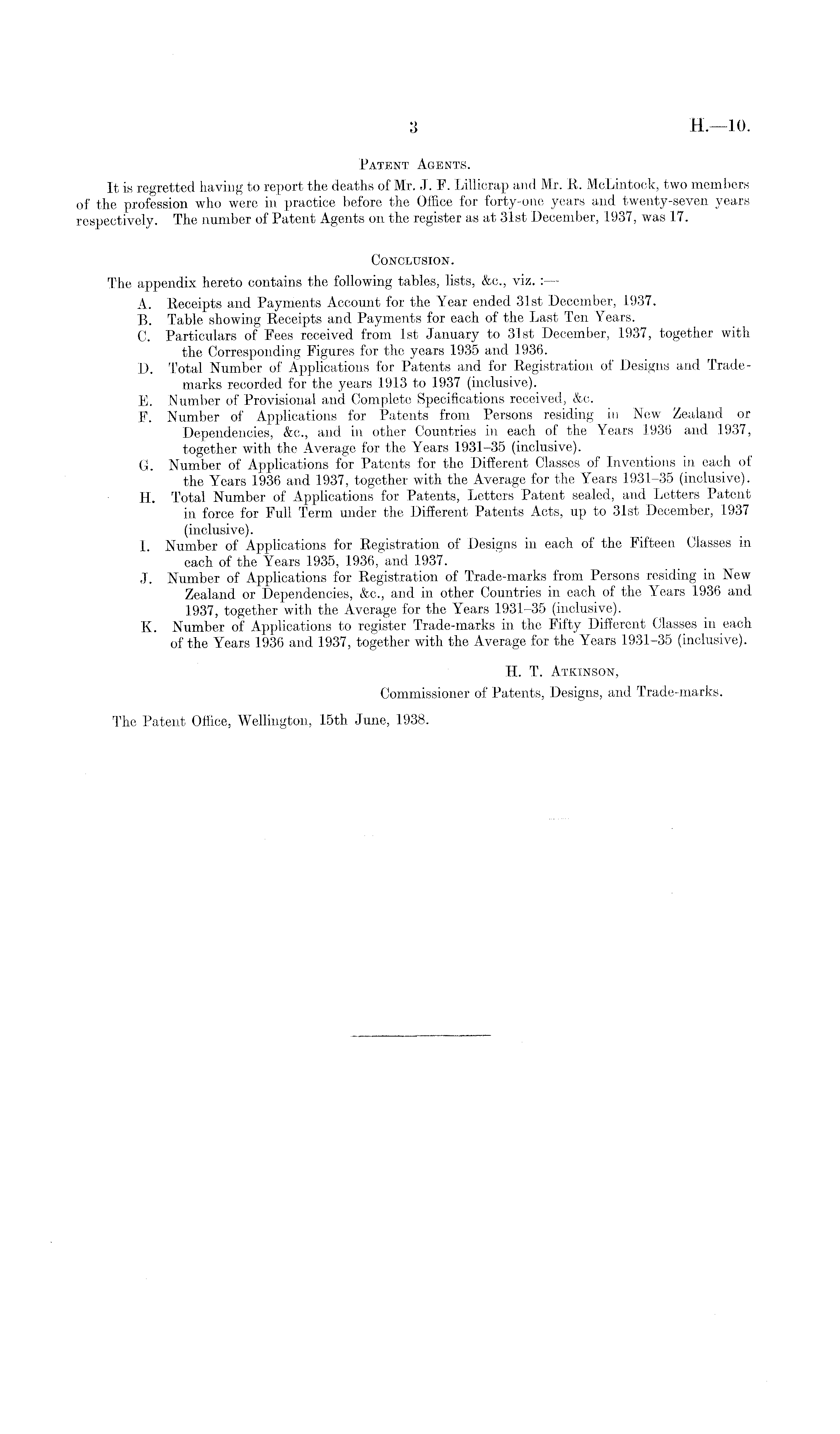 Patent Agents. It is regretted having to report the deaths of Mr. J. F. Lillicrap and Mr. R. McLintock, two members of the profession who were in practice before the Office for forty-one years and twenty-seven years respectively. The number of Patent Agents on the register as at 31st December, 1937, was 17. Conclusion. The appendix hereto contains the following tables, lists, &c., viz. :— A. Receipts and Payments Account for the Year ended 31st December, 1937. B. Table showing Receipts and Payments for each of the Last Ten Years. G. Particulars of Fees received from Ist January to 31st December, 1937, together with the Corresponding Figures for the years 1935 and 1936. D. Total Number of Applications for Patents and for Registration of Designs and Trademarks recorded for the years 1913 to 1937 (inclusive). E. Number of Provisional and Complete Specifications received, &c. F. Number of Applications for Patents from Persons residing in New Zealand or Dependencies, &c., and in other Countries in each of the Years 1936 and 1937, together with the Average for the Years 1931-35 (inclusive). G. Number of Applications for Patents for the Different Classes of Inventions in each of the Years 1936 and 1937, together with the Average for the Years 1931-35 (inclusive). H. Total Number of Applications for Patents, Letters Patent sealed, and Letters Patent in force for Full Term under the Different Patents Acts, up to 31st December, 1937 (inclusive). I. Number of Applications for Registration of Designs in each of the Fifteen Classes in each of the Years 1935, 1936, and 1937. J. Number of Applications for Registration of Trade-marks from Persons residing in New Zealand or Dependencies, &c., and in other Countries in each of the Years 1936 and 1937, together with the Average for the Years 1931-35 (inclusive). K. Number of Applications to register Trade-marks in the Fifty Different Classes in each of the Years 1936 and 1937, together with the Average for the Years 1931-35 (inclusive). H. T. Atkinson, Commissioner of Patents, Designs, and Trade-marks. The Patent Office, Wellington, 15th June, 1938.