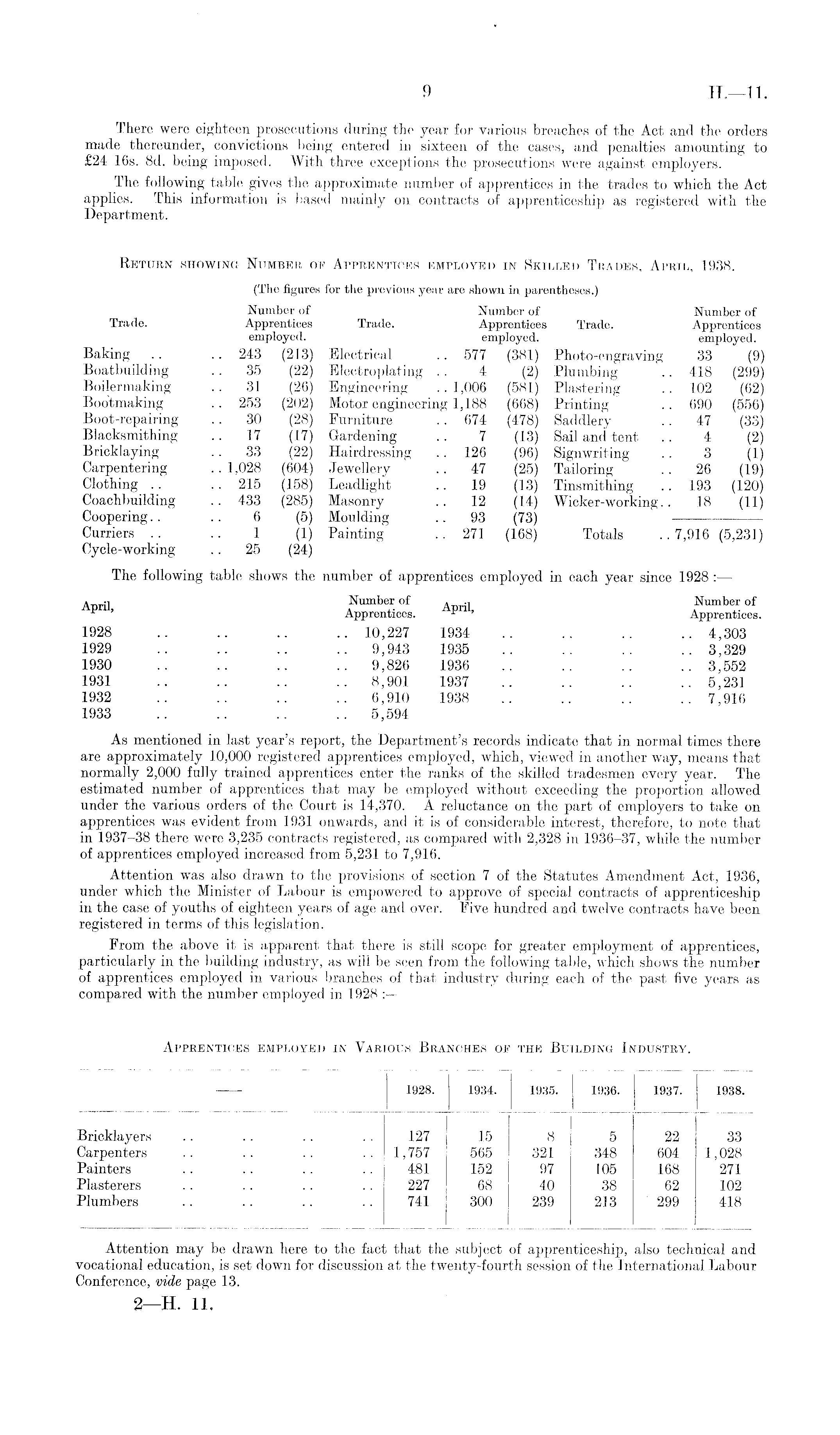 There were eighteen prosecutions during the year for various breaches of the Act and the orders made thereunder, convictions being entered in sixteen of the cases, and penalties amounting to £24 16s. Bd. being imposed. With three exceptions the prosecutions were against employers. The following table gives the approximate number of apprentices in the trades to which the Act applies. This information is based mainly on contracts of apprenticeship as registered with the Department. Return showing Number op Apprentices employed in Skilled Trades, April, 1938. (The figures for the previous year are shown in parentheses.) Number of Number of Number of Trade. Apprentices Trade. Apprentices Trade. Apprentices employed. employed. employed. Baking .. .. 243 (213) Electrical .. 577 (381) Photo-engraving 33 (9) Boatbuilding . . 35 (22) Electroplating .. 4 (2) Plumbing .. 418 (299) Boilermaking .. 31 (26) Engineering .. 1,006 (581) Plastering .. 102 (62) Bootmaking .. 253 (202) Motor engineering 1,188 (668) Printing .. 690 (556) Boot-repairing .. 30 (28) Furniture .. 674 (478) Saddlery .. 47 (33) Blacksmithing .. 17 (17) Gardening .. 7 (13) Sail and tent .. 4 (2) Bricklaying .. 33 (22) Hairdressing .. 126 (96) Signwriting .. 3 (1) Carpentering ..1,028 (604) Jewellery .. 47 (25) Tailoring .. 26 (19) Clothing . . .. 215 (158) Leadlight .. 19 (13) Tinsmithing .. 193 (120) Coachbuilding .. 433 (285) Masonry .. 12 (14) Wicker-working.. 18 (11) Coopering. . .. 6 (5) Moulding .. 93 (73) Curriers .. .. 1 (1) Painting .. 271 (168) Totals ..7,916 (5,231) Cycle-working .. 25 (24) The following table shows the number of apprentices employed in each year since 1928 : — A il Number of . „ Number of ' Apprentices. p ' Apprentices. 1928 .. .. .. .. 10,227 1934 .. .. .. .. 4,303 1929 .. .. .. .. 9,943 1935 .. .. .. .. 3,329 1930 .. .. .. .. 9,826 1936 .. .. .. .. 3,552 1931 .. .. .. .. 8,901 1937 .. .. .. .. 5,231 1932 .. .. .. .. 6,910 1938 .. .. .. .. 7,916 1933 .. .. .. .. 5,594 As mentioned in last year's report, the Department's records indicate that in normal times there are approximately 10,000 registered apprentices employed, which, viewed in another way, means that normally 2,000 fully trained apprentices enter the ranks of the skilled tradesmen every year. The estimated number of apprentices that may be employed without exceeding the proportion allowed under the various orders of the Court is 14,370. A reluctance on the part of employers to take on apprentices was evident from 1931 onwards, and it is of considerable interest, therefore, to note that in 1937-38 there were 3,235 contracts registered, as compared with 2,328 in 1936-37, while the number of apprentices employed increased from 5,231 to 7,916. Attention was also drawn to the provisions of section 7 of the Statutes Amendment Act, 1936, under which the Minister of Labour is empowered to approve of special contracts of apprenticeship in the case of youths of eighteen years of age and over. Five hundred and twelve contracts have been registered in terms of this legislation. From the above it is apparent that there is still scope for greater employment of apprentices, particularly in the building industry, as will be seen from the following table, which shows the number of apprentices employed in various branches of that industry during each of the past five years as compared with the number employed in 1928 : —