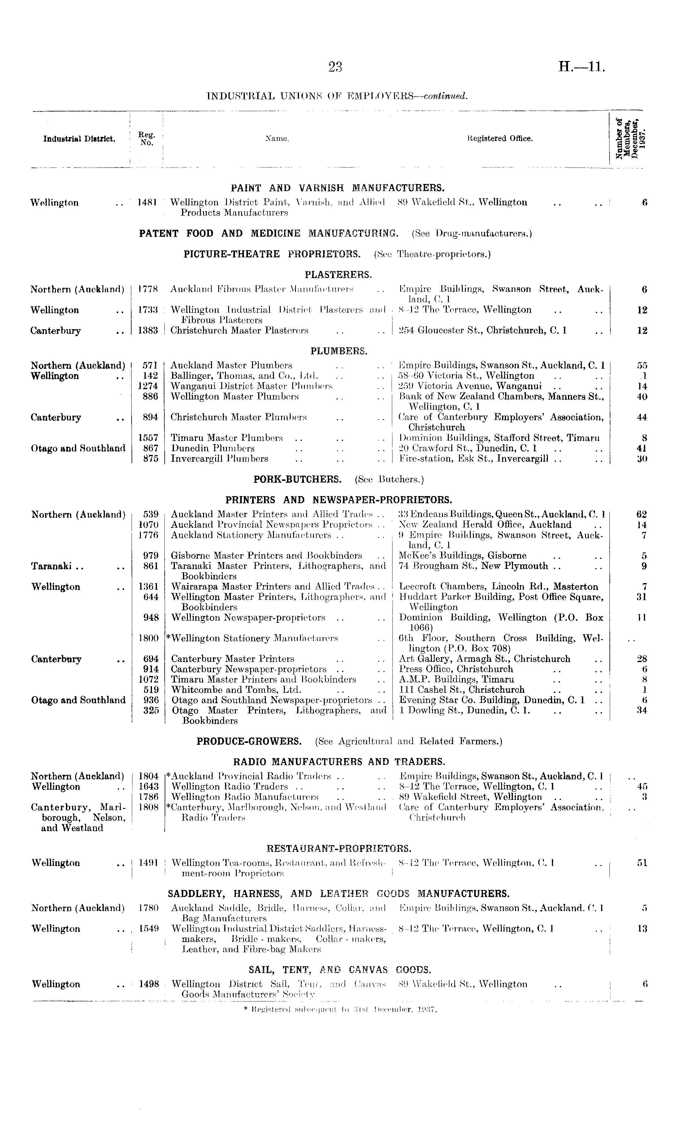 1 *§f. Industrial District. Name. Registered Office. g 91S j. ' [ _ _ _ I*r PAINT AND VARNISH MANUFACTURERS. Wellington .. ' 1481 j Wellington District Paint, Varnish, and Allied j 89 Wakefield St., Wellington .. .. I 6 Products Manufacturers PATENT POOD AND MEDICINE MANUFACTURING. (See Drug-manufacturers.) PICTURE-THEATRE PROPRIETORS. (See Theatre-proprietors.) PLASTERERS. Northern (Auckland) 1778 Auckland Fibrous Plaster Manufacturers .. Empire Buildings, Swanson Street, Auck- 6 land, C. 1 Wellington .. 1733 i Wellington Industrial District Plasterers and 8-12 The Terrace, Wellington .. .. 12 Fibrous Plasterers Canterbury .. 1383 ! Christchurch Master Plasterers .. .. 254 Gloucester St., Christehurch, C. 1 .. 12 PLUMBERS. Northern (Auckland) 571 Auckland Master Plumbers .. .. Empire Buildings, Swanson St., Auckland, C. 1 55 Wellington .. 142 Ballinger, Thomas, and Co., Ltd. .. .. 58-60 Victoria St., Wellington .. .. .1 1274 Wanganui District Master Plumbers .. 259 Victoria Avenue, Wanganui .. .. 14 886 Wellington Master Plumbers .. .. Bank of New Zealand Chambers, Manners St., 40 Wellington, C. 1 Canterbury .. 894 Christchurch Master Plumbers .. .. Care of Canterbury Employers' Association, 44 Christchurch 1557 Timaru Master Plumbers .. .. .. Dominion Buildings, Stafford Street, Timaru 8 Otago and Southland 867 Dunedin Plumbers .. .. 20 Crawford St., Dunedin, C. 1 .. .. 41 875 Invercargill Plumbers .. .. .. Fire-station, Esk St., Invercargill .. .. 30 PORK-BUTCHERS. (See Butchers.) PRINTERS AND NEWSPAPER-PROPRIETORS. Northern (Auckland) 539 Auckland Master Printers and Allied Trades .. 33 Endeans Buildings, Queen St., Auckland, C. 1 62 1070 Auckland Provincial Newspapers Proprietors .. New Zealand Herald Office, Auckland .. 14 1776 Auckland Stationery Manufacturers .. 9 Empire Buildings, Swanson Street, Auck- 7 land, C. 1 979 Gisborne Master Printers and Bookbinders .. McKee's Buildings, G is borne .. .. 5 Taranaki .. .. 861 Taranaki Master Printers, Lithographers, and 74 Brougham St., New Plymouth .. .. 9 Bookbinders Wellington .. 1361 Wairarapa Master Printers and Allied Trades .. Leecroft Chambers, Lincoln Rd., Masterton 7 644 Wellington Master Printers, Lithographers, and Huddart Parker Building, Post Office Square, 31 Bookbinders Wellington 948 Wellington Newspaper-proprietors .. .. Dominion Building, Wellington (P.O. Box 11 1066) 1800 *Wellington Stationery Manufacturers .. 6th Floor, Southern Cross Building, Wellington (P.O. Box 708) Canterbury .. 694 Canterbury Master Printers .. . . Art Gallery, Armagh St., Christchurch .. 28 914 Canterbury Newspaper-proprietors .. .. Press Office, Christchurch .. .. 6 1072 Timaru Master Printers and Bookbinders .. A.M.P. Buildings, Timaru .. .. 8 519 Whitcombe and Tombs, Ltd. .. .. Ill Cashel St., Christchurch .. .. 1 Otago and Southland 936 Otago and Southland Newspaper-proprietors .. Evening Star Co. Building, Dunedin, C. 1 .. 6 325 Otago Master Printers, Lithographers, and 1 Dowling St., Dunedin, C. 1. .. .. 34 Bookbinders PRODUCE-GROWERS. (See Agricultural and Related Farmers.) RADIO MANUFACTURERS AND TRADERS. Northern (Auckland) 1804 * Auckland Provincial Radio Traders .. ..I Empire Buildings, Swanson St., Auckland, C. 1 Wellington .. 1643 Wellington Radio Traders .. .. .. : 8-12 The Terrace, Wellington, C. 1 .. 45 1786 Wellington Radio Manufacturers .. .. 89 Wakefield Street, Wellington .. .. 3 Canterbury, Marl- 1808 *Canterbury, Marlborough, Nelson, and Westland I Care of Canterbury Employers' Association, borough, Nelson, Radio Traders j Christchurch and Westland RESTAURANT-PROPRIETORS. Wellington .. I 1491 j Wellington Tea-rooms, Restaurant, and Refresh- j 8-12 The Terrace, Wellington, C. 1 .. j 51 ment-roorn Proprietors SADDLERY, HARNESS, AND LEATHER GOODS MANUFACTURERS. Northern (Auckland) ! 1780 ! Auckland Saddle, Bridle, Harness, Collar, and j Empire Buildings, Swanson St., Auckland, C. 1 | 5 Bag Manufacturers Wellington .. 1549 1 Wellington Industrial District Saddlers, Harness- 8-12 The Terrace, Wellington, C. 1 .. 1 13 makers, Bridle - makers, Collar - makers, Leather, and Fibre-bag Makers SAIL, TENT, AND CANVAS GOODS. Wellington .. j 1498 | Wellington District Sail, Tent, and Canvas | 89 Wakefield St., Wellington .. I 6 ! j Goods Manufacturers' Society * Registered subsequent to 31st December, 1937.
