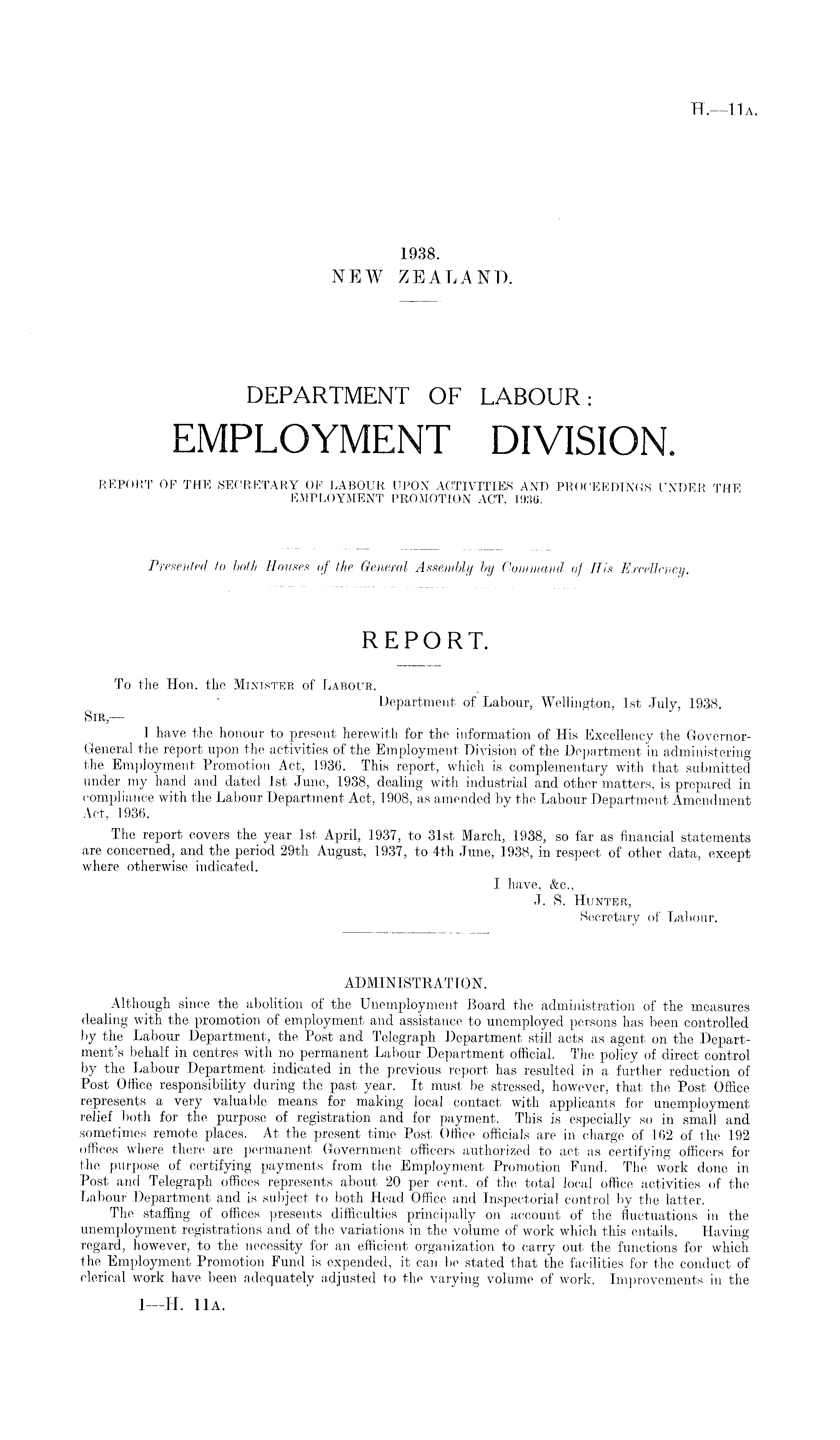 To the Hon. the Minister of Labotjb. Department of Labour, Wellington, Ist July, 1938. Sir,— I have the honour to present herewith for the information of His Excellency the GovernorGeneral the report upon the activities of the Employment Division of the Department in administering the Employment Promotion Act, 1936. This report, which is complementary with that submitted under my hand and dated Ist June, 1938, dealing with industrial and other matters, is prepared in compliance with the Labour Department Act, 1908, as amended by the Labour Department Amendment Act, 1936. The report covers the year Ist April, 1937, to 31st March, 1938, so far as financial statements are concerned, and the period 29th August, 1937, to 4th June, 1938, in respect of other data, except where otherwise indicated. I have, &c., J. S. Hunter, Secretary of Labour.