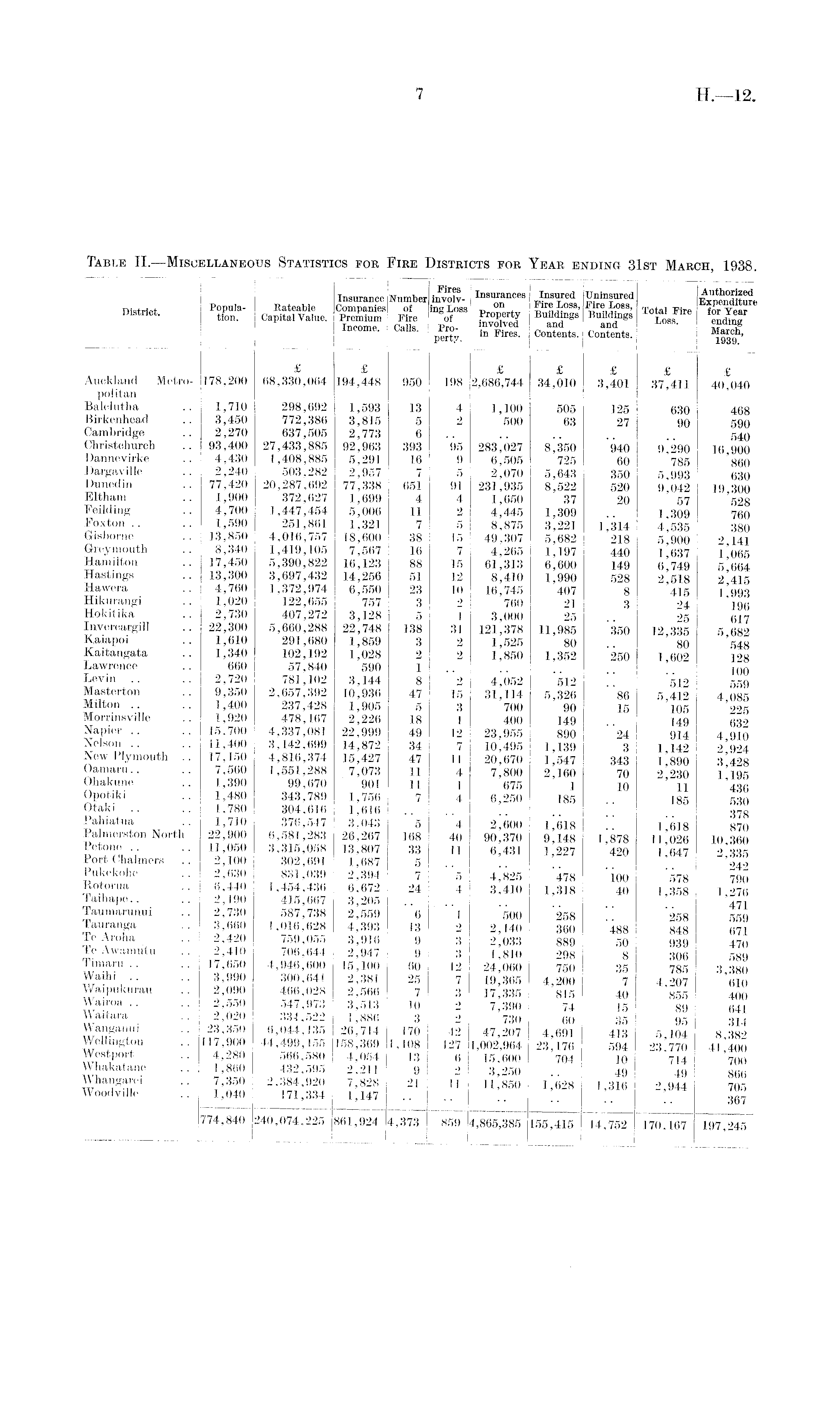 Table II.—Miscellaneous Statistics for Fire Districts for Year ending 31st March, 1938.