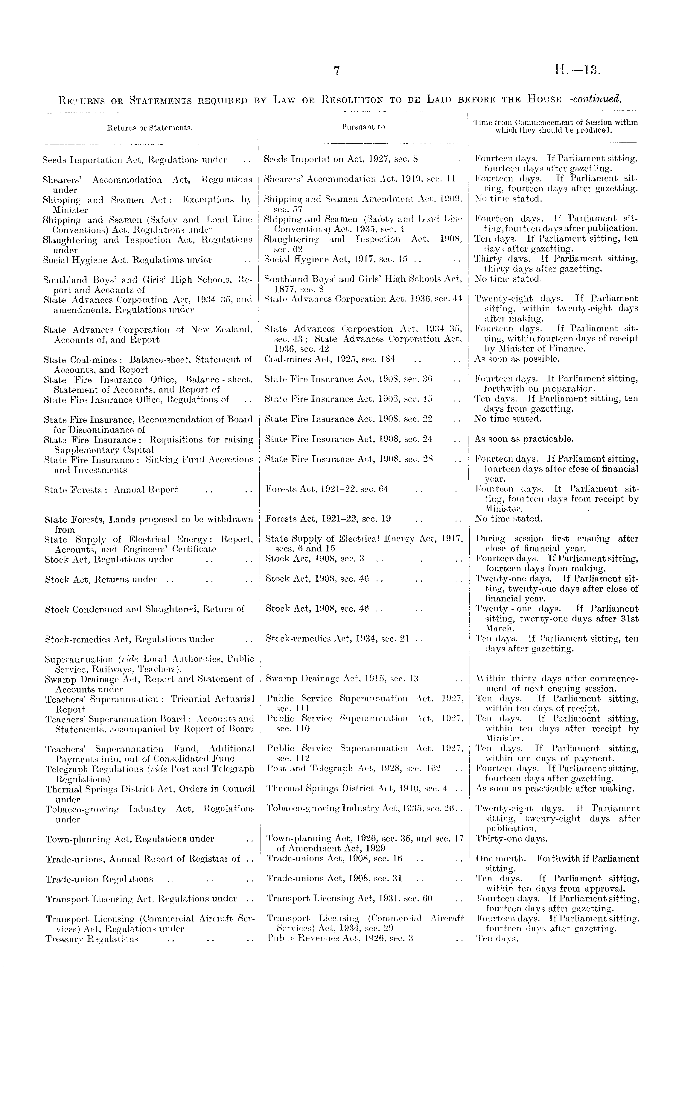 _ , _ , _ , . Time from Commencement of Session within Returns or Statements. Pursuant to which they should be produced. Seeds Importation Act, Regulations under .. Seeds Importation Act, 1927, see. 8 .. Fourteen days. If Parliament sitting, fourteen days after gazetting. Shearers' Accommodation Act, Regulations Shearers' Accommodation Act, 1919, sec. 11 Fourteen days. If Parliament situnder ting, fourteen days after gazetting. Shipping and Seamen Act: Exemptions by Shipping and Seamen Amendment Act, 1909, No time stated. Minister sec. 57 Shipping and Seamen (Safety and Load Line Shipping and Seamen (Safety and Load Line Fourteen days. If Parliament sitConventions) Act, Regulations under Conventions) Act, 1935, sec. 4 ting,fourteen days after publication. Slaughtering and Inspection Act, Regulations Slaughtering and Inspection Act, I90B, Ten days. If Parliament sitting, ten under sec. 62 days after gazetting. Social Hygiene Act, Regulations under .. Social Hygiene Act, 1917, sec. 15 .. .. Thirty days. If Parliament sitting, thirty days after gazetting. Southland Boys' and Girls' High Schools, Re- Southland Boys' and Girls' High Schools Act, No time stated. port and Accounts of 1877, sec. 8 State Advances Corporation Act, 1934-35, and State Advances Corporation Act, 1936, sec. 44 Twenty-eight days. If Parliament amendments, Regulations under sitting, within twenty-eight days after making. State Advances Corporation of New Zealand, State Advances Corporation Act, 1934-35, Fourteen days. If Parliament sitAccounts of, and Report sec. 43 ; State Advances Corporation Act, ting, within fourteen days of receipt 1936, sec. 42 by Minister of Finance. State Coal-mines : Balance-sheet, Statement of Coal-mines Act, 1925, see. 184 .. As soon as possible. Accounts, and Report State Fire Insurance Office, Balance - sheet, State Fire Insurance Act, 1908, sec. 36 .. Fourteen days. If Parliament sitting, Statement of Accounts, and Report of forthwith on preparation. State Fire Insurance Office, Regulations of .. State Fire Insurance Act, 1908, sec. 45 .. Ten days. If Parliament sitting, ten days from gazetting. State Fire Insurance, Recommendation of Board State Fire Insurance Act, 1908, sec. 22 No time stated. for Discontinuance of Stats Fire Insurance : Requisitions for raising State Fire Insurance Act, 1908, sec. 24 As soon as practicable. Supplementary Capital State Fire Insurance : Sinking Fund Accretions State Fire Insurance Act, 1908, sec. 28 .. Fourteen days. If Parliament sitting, and Investments fourteen days after close of financial year. State Forests : Annual Report .. .. Forests Act, 1921-22, sec. 64 .. .. Fourteen days. If Parliament sitting, fourteen days from receipt by Minister. State Forests, Lands proposed to be withdrawn Forests Act, 1921-22, sec. 19 .. No time stated. from State Supply of Electrical Energy: Report, State Supply of Electrical Energy Act, 1917, During session first ensuing after Accounts, and Engineers' Certificate sees. 6 and 15 close of financial year. Stock Act, Regulations under .. .. Stock Act, 1908, sec. 3 .. .. .. Fourteen days. If Parliament sitting, fourteen days from making. Stock Act, Returns under .. .. .. Stock Act, 1908, sec. 46 .. .. .. Twenty-one days. If Parliament sitting, twenty-one days after close of financial year. Stock Condemned and Slaughtered, Return of Stock Act, 1908, sec. 46 .. .. . . Twenty - one days. If Parliament sitting, twenty-one days after 31st March. Stock-remedies Act, Regulations under .. Stock-remedies Act, 1934, sec. 21 .. .. Ten days. If Parliament sitting, ten days after gazetting. Superannuation (vide Local Authorities, Public Service, Railways, Teachers). Swamp Drainage Act, Report and Statement of Swamp Drainage Act, 1915, sec. 13 .. Within thirty days after eommeneeAccounts under ment of next ensuing session. Teachers' Superannuation: Triennial Actuarial Public Service Superannuation Act, 1927, Ten days. If Parliament sitting, Report sec. Ill within ten days of receipt. Teachers' Superannuation Board: Accounts and Public Service Superannuation Act, 1927, Ten days. If Parliament sitting, Statements, accompanied by Report of Board sec. 110 within ten days after receipt by Minister. Teachers' Superannuation Fund, Additional Public Service Superannuation Act, 1927, Ten days. If Parliament sitting, Payments into, out of Consolidated Fund sec. 112 within ten days of payment. Telegraph Regulations (vide Post and Telegraph Post and Telegraph Act, 1928, sec. 162 . . Fourteen days. If Parliament sitting, Regulations) fourteen days after gazetting. Thermal Springs District Act, Orders in Council Thermal Springs District Act, 1910, sec. 4 .. As soon as practicable after making, under Tobacco-growing Industry Act, Regulations Tobacco-growing Industry Act, 1935, sec. 26.. Twenty-eight days. If Parliament under sitting, twenty-eight days after publication. Town-planning Act, Regulations under .. Town-planning Act, 1926, sec. 35, and sec. 17 Thirty-one days. of Amendment Act, 1929 Trade-unions, Annual Report of Registrar of .. Trade-unions Act, 1908, sec. 16 .. One month. Forthwith if Parliament sitting. Trade-union Regulations .. .. .. Trade-unions Act, 1908, sec. 31 .. Ten days. If Parliament sitting, within ten days from approval. Transport Licensing Act, Regulations under .. Transport Licensing Act, 1931, sec. 60 .. Fourteen days. If Parliament sitting, fourteen days after gazetting. Transport Licensing (Commercial Aircraft Ser- Transport licensing (Commercial Aircraft Fourteen days. If Parliament sitting, vices) Act, Regulations under Services) Act, 1934, sec. 29 fourteen days after gazetting. Treasury Rsgulations .. .. .. Public Revenues Act, 1926, sec. 3 .. Ten days.