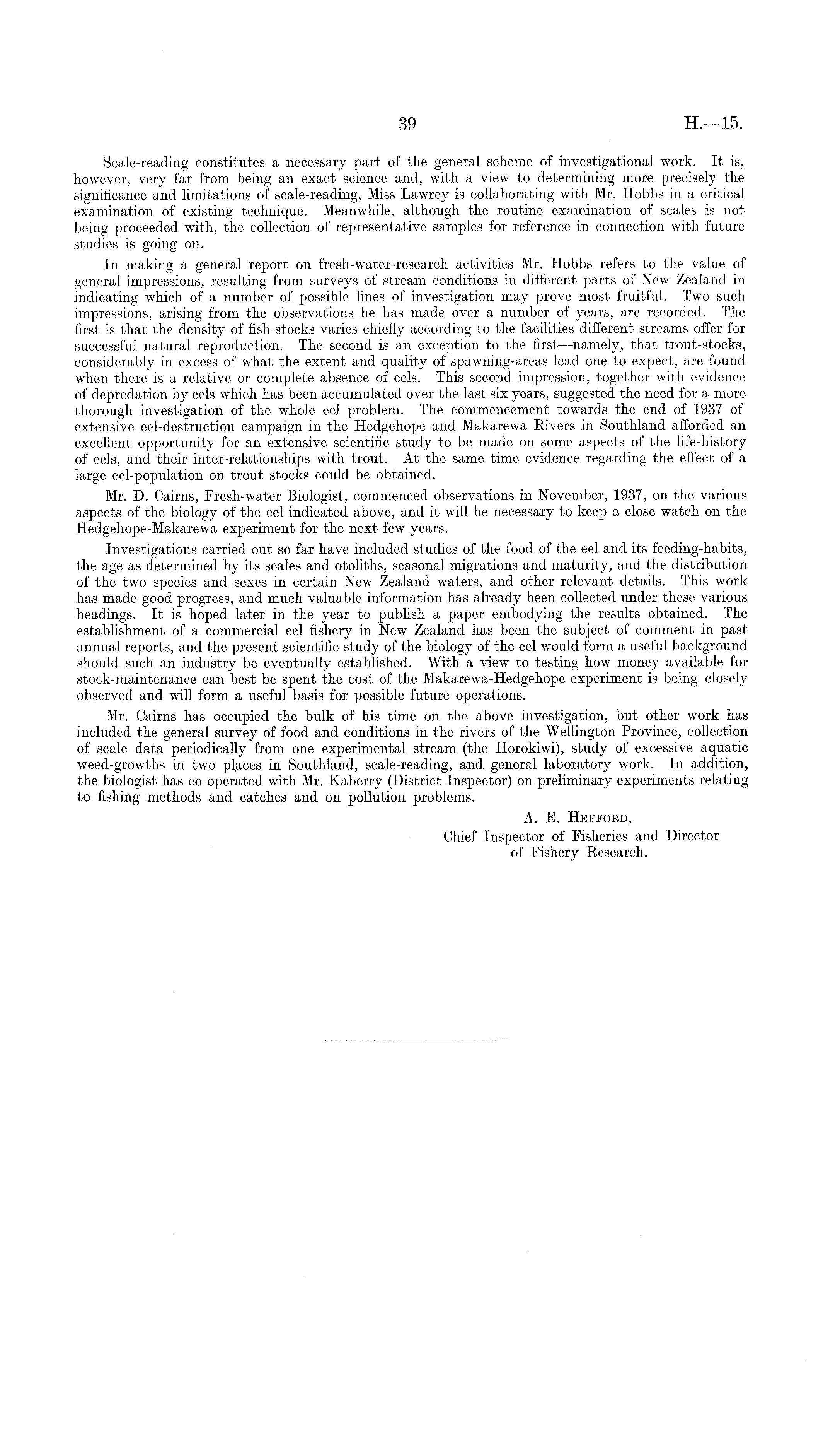 Scale-reading constitutes a necessary part of the general scheme of investigational work. It is, however, very far from being an exact science and, with a view to determining more precisely the significance and limitations of scale-reading, Miss Lawrey is collaborating with Mr. Hobbs in a critical examination of existing technique. Meanwhile, although the routine examination of scales is not being proceeded with, the collection of representative samples for reference in connection with future studies is going on. In making a general report on fresh-water-research activities Mr. Hobbs refers to the value of general impressions, resulting from surveys of stream conditions in different parts of New Zealand in indicating which of a number of possible lines of investigation may prove most fruitful. Two such impressions, arising from the observations he has made over a number of years, are recorded. The first is that the density of fish-stocks varies chiefly according to the facilities different streams offer for successful natural reproduction. The second is an exception to the first —namely, that troirt-stocks, considerably in excess of what the extent and quality of spawning-areas lead one to expect, are found when there is a relative or complete absence of eels. This second impression, together with evidence of depredation by eels which has been accumulated over the last six years, suggested the need for a more thorough investigation of the whole eel problem. The commencement towards the end of 1937 of extensive eel-destruction campaign in the Hedgehope and Makarewa Rivers in Southland afforded an excellent opportunity for an extensive scientific study to be made on some aspects of the life-history of eels, and their inter-relationships with trout. At the same time evidence regarding the effect of a large eel-population on trout stocks could be obtained. Mr. D. Cairns, Fresh-water Biologist, commenced observations in November, 1937, on the various aspects of the biology of the eel indicated above, and it will be necessary to keep a close watch on the Hedgehope-Makarewa experiment for the next few years. Investigations carried out so far have included studies of the food of the eel and its feeding-habits, the age as determined by its scales and otoliths, seasonal migrations and maturity, and the distribution of the two species and sexes in certain New Zealand waters, and other relevant details. This work has made good progress, and much valuable information has already been collected under these various headings. It is hoped later in the year to publish a paper embodying the results obtained. The establishment of a commercial eel fishery in New Zealand has been the subject of comment in past annual reports, and the present scientific study of the biology of the eel would form a useful background should such an industry be eventually established. With a view to testing how money available for stock-maintenance can best be spent the cost of the Makarewa-Hedgehope experiment is being closely observed and will form a useful basis for possible future operations. Mr. Cairns has occupied the bulk of his time on the above investigation, but other work has included the general survey of food and conditions in the rivers of the Wellington Province, collection of scale data periodically from one experimental stream (the Horokiwi), study of excessive aquatic weed-growths in two places in Southland, scale-reading, and general laboratory work. In addition, the biologist has co-operated with Mr. Kaberry (District Inspector) on preliminary experiments relating to fishing methods and catches and on pollution problems. A. E. Heffopj), Chief Inspector of Fisheries and Director of Fishery Research.