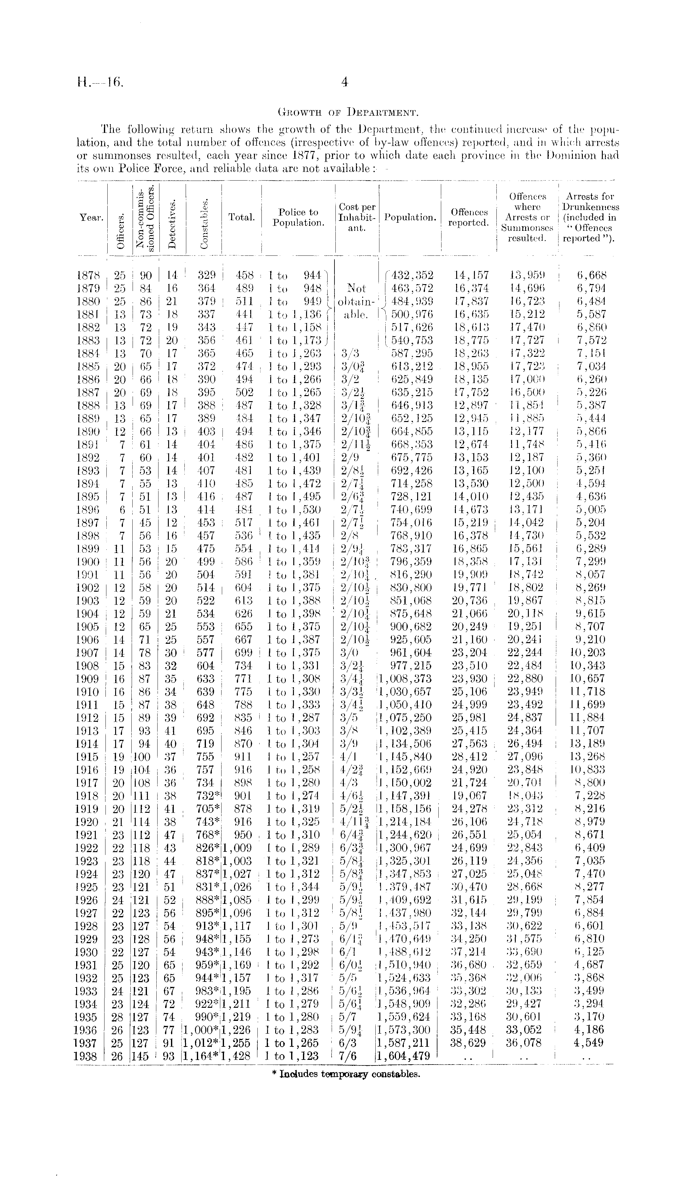 Growth of Department. The following return shows the growth of the Department, the continued increase of the population, and the total number of offences (irrespective of by-law offences) reported, and in which arrests or summonses resulted, each year since 1877, prior to which date each province in the Dominion had its own Police Force, and reliable data are not available:—