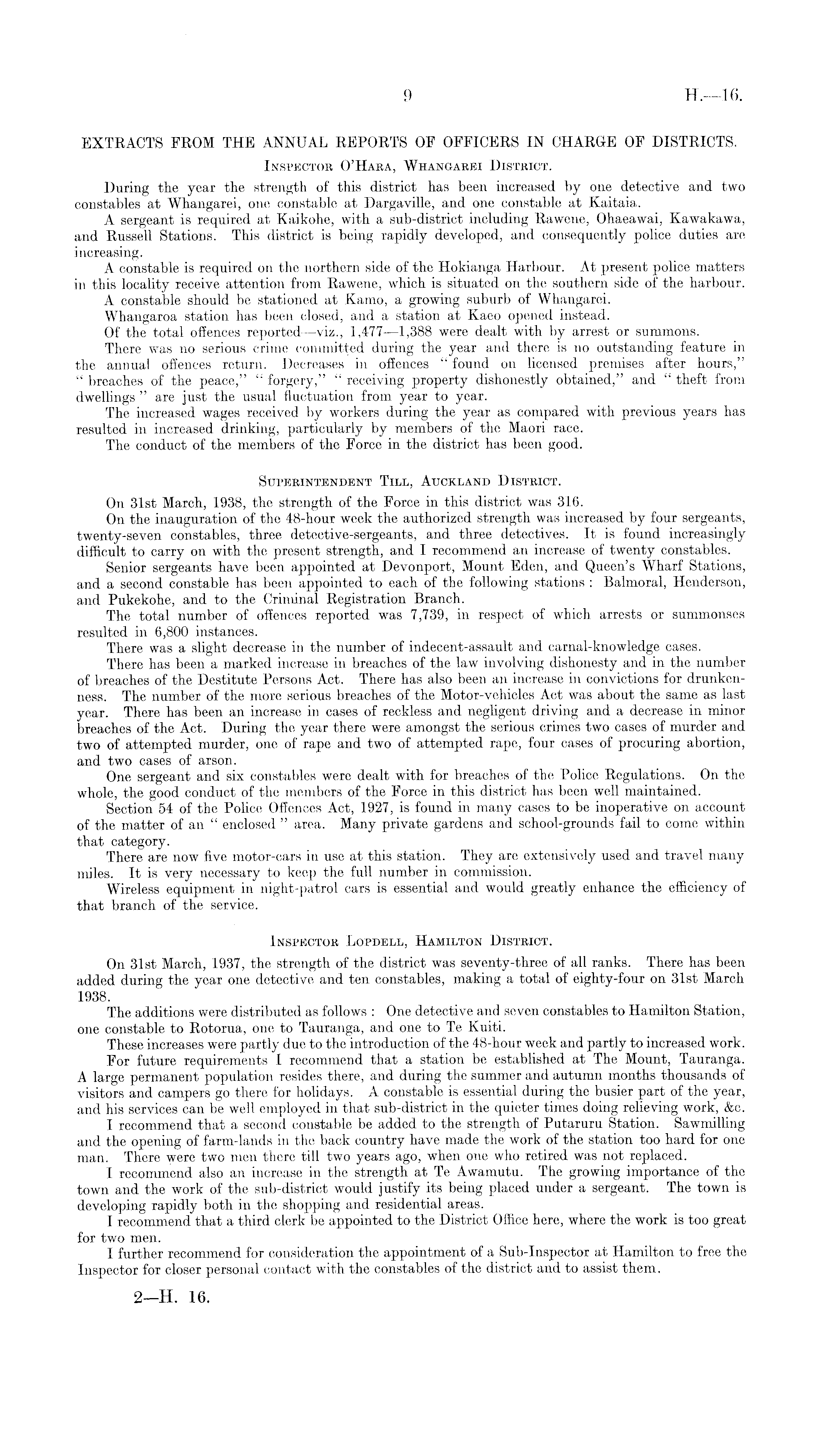 EXTRACTS FROM THE ANNUAL REPORTS OF OFFICERS IN CHARGE OF DISTRICTS. Inspector O'Hara, Whangarei District. During the year the strength of this district has been increased by one detective and two constables at Whangarei, one constable at Dargaville, and one constable at Kaitaia. A sergeant is required at Kaikohe, with a sub-district including Rawene, Ohaeawai, Kawakawa, and Russell Stations. This district is being rapidly developed, and consequently police duties are increasing. A constable is required on the northern side of the Hokianga Harbour. At present police matters in this locality receive attention from Rawene, which is situated on the southern side of the harbour. A constable should be stationed at Kamo, a growing suburb of Whangarei. Whangaroa station has been closed, and a station at Kaeo opened instead. Of the total offences reported —viz., 1,477 —1,388 were dealt with by arrest or summons. There was no serious crime committed during the year and there is no outstanding feature in the annual offences return. Decreases in offences " found on licensed premises after hours," " breaches of the peace," " forgery," " receiving property dishonestly obtained," and " theft from dwellings " are just the usual fluctuation from year to year. The increased wages received by workers during the year as compared with previous years has resulted in increased drinking, particularly by members of the Maori race. The conduct of the members of the Force in the district has been good. Superintendent Till, Auckland District. On 31st March, 1938, the strength of the Force in this district was 316. On the inauguration of the 48-hour week the authorized strength was increased by four sergeants, twenty-seven constables, three detective-sergeants, and three detectives. It is found increasingly difficult to carry on with the present strength, and I recommend an increase of twenty constables. Senior sergeants have been appointed at Devonport, Mount Eden, and Queen's Wharf Stations, and a second constable has been appointed to each of the following stations : Balmoral, Henderson, and Pukekohe, and to the Criminal Registration Branch. The total number of oflences reported was 7,739, in respect of which arrests or summonses resulted in 6,800 instances. There was a slight decrease in the number of indecent-assault and carnal-knowledge cases. There has been a marked increase in breaches of the law involving dishonesty and in the number of breaches of the Destitute Persons Act. There has also been an increase in convictions for drunkenness. The number of the more serious breaches of the Motor-vehicles Act was about the same as last year. There has been an increase in cases of reckless and negligent driving and a decrease in minor breaches of the Act. During the year there were amongst the serious crimes two cases of murder and two of attempted murder, one of rape and two of attempted rape, four cases of procuring abortion, and two cases of arson. One sergeant and six constables were dealt with for breaches of the Police Regulations. On the whole, the good conduct of the members of the Force in this district has been well maintained. Section 54 of the Police Oflences Act, 1927, is found in many cases to be inoperative on account of the matter of an " enclosed " area. Many private gardens and school-grounds fail to come within that category. There are now five motor-cars in use at this station. They are extensively used and travel many miles. It is very necessary to keep the full number in commission. Wireless equipment in night-patrol cars is essential and would greatly enhance the efficiency of that branch of the service. Inspector Lopdell, Hamilton District. On 31st March, 1937, the strength of the district was seventy-three of all ranks. There has been added during the year one detective and ten constables, making a total of eighty-four on 31st March 1938. The additions were distributed as follows : One detective and seven constables to Hamilton Station, one constable to Rotorua, one to Tauranga, and one to Te Kuiti. These increases were partly due to the introduction of the 48-hour week and partly to increased work. For future requirements I recommend that a station be established at The Mount, Tauranga. A large permanent population resides there, and during the summer and autumn months thousands of visitors and campers go there for holidays. A constable is essential during the busier part of the year, and his services can be well employed in that sub-district in the quieter times doing relieving work, &c. I recommend that a second constable be added to the strength of Putaruru Station. Sawmilling and the opening of farm-lands in the back country have made the work of the station too hard for one man. There were two men there till two years ago, when one who retired was not replaced. I recommend also an increase in the strength at Te Awamutu. The growing importance of the town and the work of the sub-district would justify its being placed under a sergeant. The town is developing rapidly both in the shopping and residential areas. I recommend that a third clerk be appointed to the District Office here, where the work is too great for two men. I further recommend for consideration the appointment of a Sub-Inspector at Hamilton to free the Inspector for closer personal contact with the constables of the district and to assist them.