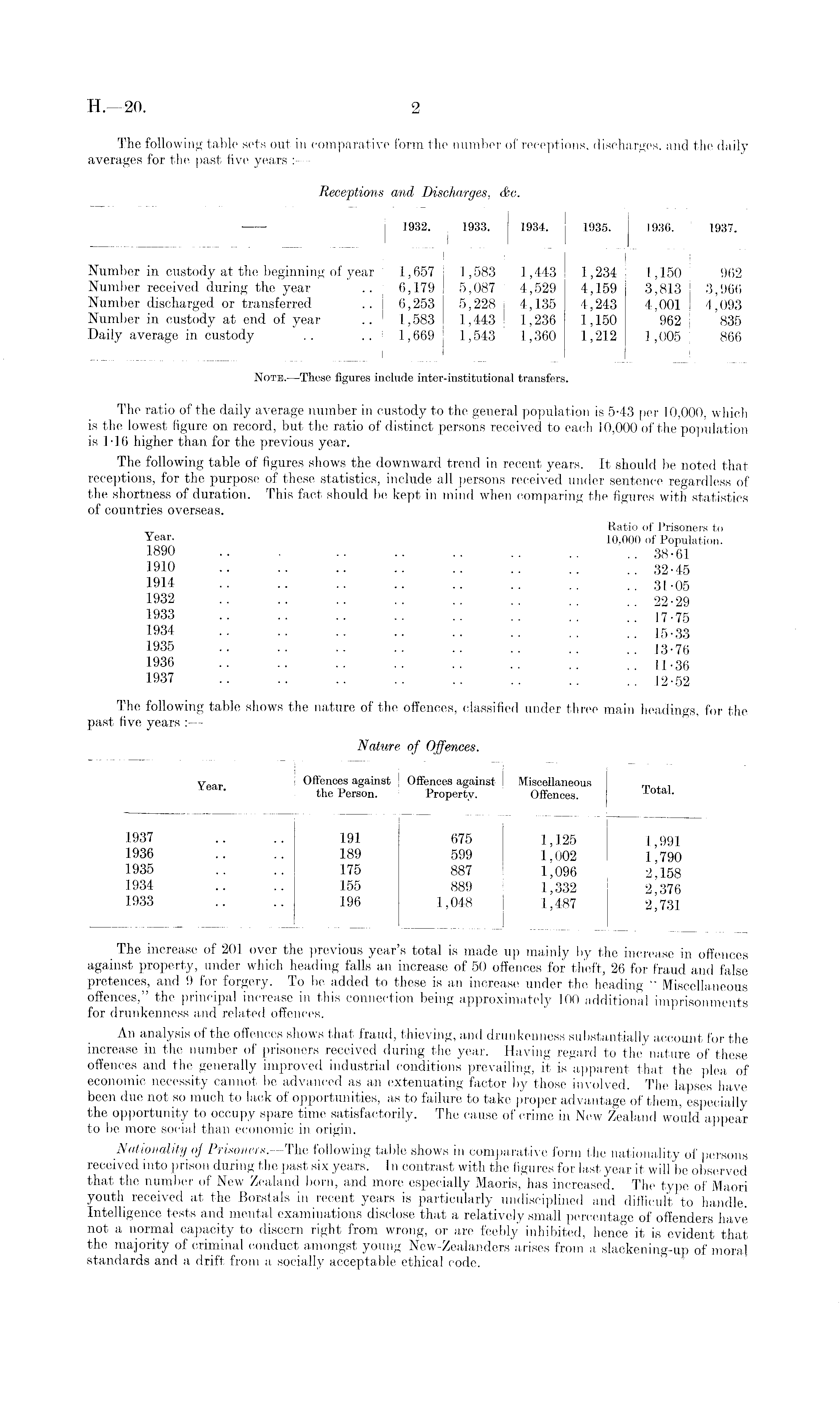 The increase of 201 over the previous year's total is made up mainly by the increase in offences against property, under which heading falls an increase of 50 offences for theft, 26 for fraud and false pretences, and 9 for forgery. To be added to these is an increase under the heading " Miscellaneous offences," the principal increase in this connection being approximately 100 additional imprisonments for drunkenness and related offences. An analysis of the offences shows that fraud, thieving, and drunkenness substantially account for the increase in the number of prisoners received during the year. Having regard to the nature of these offences and the generally improved industrial conditions prevailing, it is apparent that the plea of economic necessity cannot be advanced as an extenuating factor by those involved. The lapses have been due not so much to lack of opportunities, as to failure to take proper advantage of them, especially the opportunity to occupy spare time satisfactorily. The cause of crime in New Zealand would appear to be more social than economic in origin. Nationality of Prisoners.—The following table shows in comparative form the nationality of persons received into prison during the past six years. In contrast with the figures for last year it will be observed that the number of New Zealand born, and more especially Maoris, has increased. The type of Maori youth received at the Borstals in recent years is particularly undisciplined and difficult to handle. Intelligence tests and mental examinations disclose that a relatively small percentage of offenders have not a normal capacity to discern right from wrong, or are feebly inhibited, hence it is evident that the majority of criminal conduct amongst young New-Zealanders arises from a slackening-up of moral standards and a drift from a socially acceptable ethical code.
