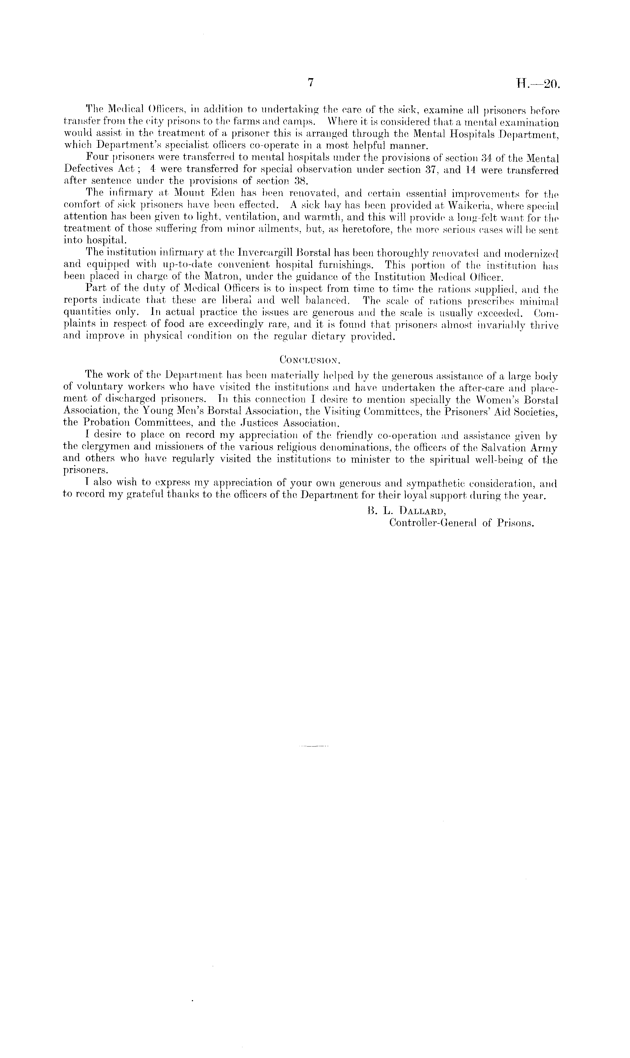 The Medical Officers, in addition to undertaking the care of the sick, examine all prisoners before transfer from the city prisons to the farms and camps. Where it is considered that a mental examination would assist in the treatment of a prisoner this is arranged through the Mental Hospitals Department, which Department's specialist officers co-operate in a most helpful manner. Four prisoners were transferred to mental hospitals under the provisions of section 34 of the Mental Defectives Act; 4 were transferred for special observation under section 37, and 14 were transferred after sentence under the provisions of section 38. The infirmary at Mount Eden has been renovated, and certain essential improvements for the comfort of sick prisoners have been effected. A sick bay has been provided at Waikeria, where special attention has been given to light, ventilation, and warmth, and this will provide a long-felt want for the treatment of those suffering from minor ailments, but, as heretofore, the more serious cases will be sent into hospital. The institution infirmary at the Invercargill Borstal has beeri thoroughly renovated and modernized and equipped with up-to-date convenient hospital furnishings. This portion of the institution has been placed in charge of the Matron, under the guidance of the Institution Medical Officer. Part of the duty of Medical Officers is to inspect from time to time the rations supplied, and the reports indicate that these are liberal and well balanced. The scale of rations prescribes minimal quantities only. In actual practice the issues are generous and the scale is usually exceeded. Complaints in respect of food are exceedingly rare, and it is found that prisoners almost invariably thrive and improve in physical condition on the regular dietary provided. Conclusion. The work of the Department has been materially helped by the generous assistance of a large body of voluntary workers who have visited the institutions and have undertaken the after-care and placement of discharged prisoners. In this connection I desire to mention specially the Women's Borstal Association, the Young Men's Borstal Association, the Visiting Committees, the Prisoners' Aid Societies, the Probation Committees, and the Justices Association. I desire to place on record my appreciation of the friendly co-operation and assistance given by the clergymen and missioners of the various religious denominations, the officers of the Salvation Army and others who have regularly visited the institutions to minister to the spiritual well-being of the prisoners. I also wish to express my appreciation of your own generous and sympathetic consideration, and to record my grateful thanks to the officers of the Department for their loyal support during the year. B. L. Dallard, Controller-General of Prisons.