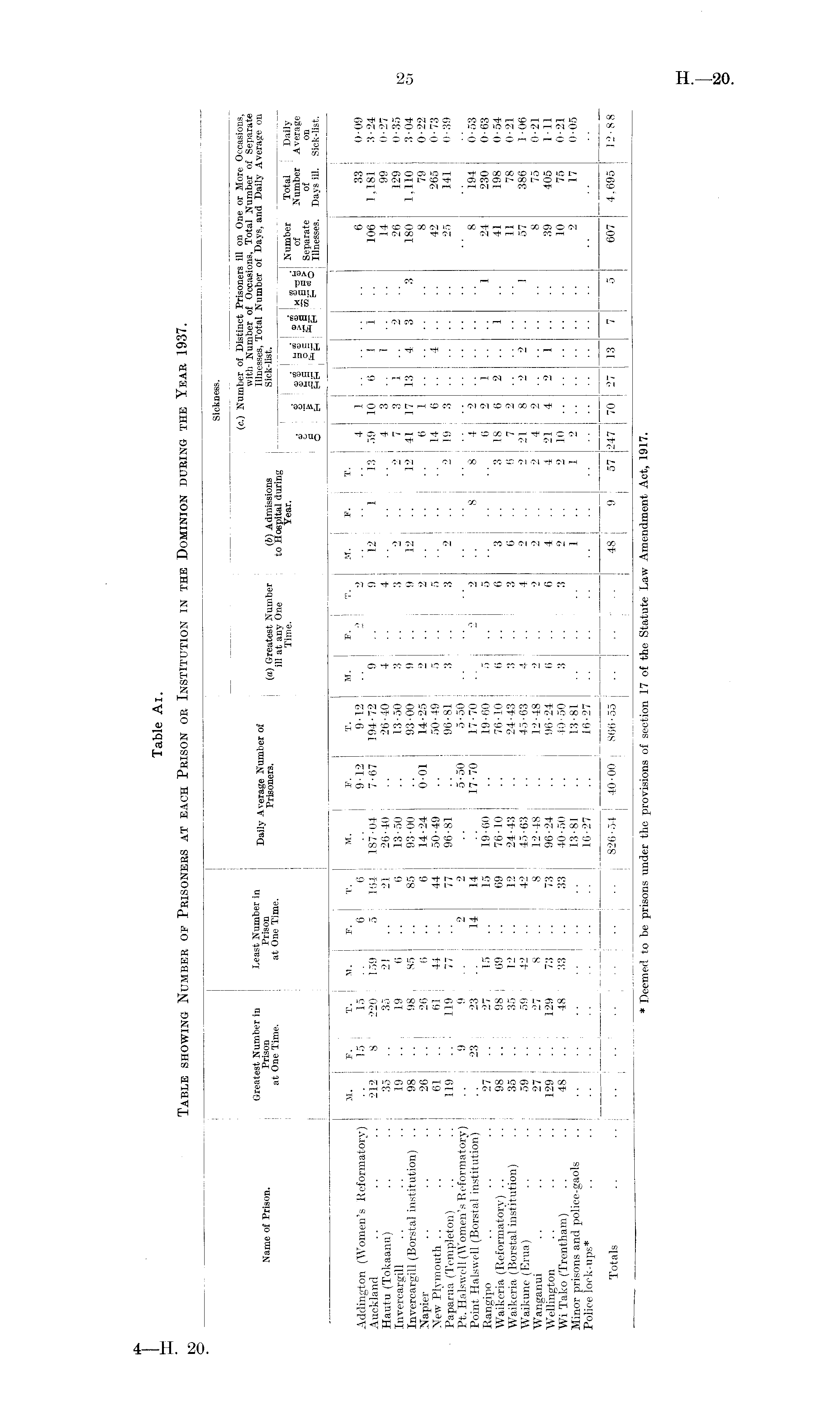 Sickness. (c.) Number of Distinct Prisoners ill on One or More Occasions, _ , __ , . with Number of Occasions, Total Number of Separate _ . GreatestNumber m Least Number in Daily Average Number of Illnesses, Total Number of Days, and Daily Average on Name of Prison. ' Prisoners. (a) Greatest Number (b) Admissions Sick-list. at One Time. at One Time. m at any One | to Hospital during Time. Year. . . • ~ Number Total Daily <6 ® p® >2 xS'Oc of Number Average 2 > gS ©£ £.5 25 §£ Separate of on O HHH H Illnesses. Days ill. Sick-list. M. F. T. M. F. T. M. F. T. M. F. T. M. F. T. Addington (Women's Reformatory) .. 15 15 .. 6 6 .. 9-12 9-12 .. 2 2 .. .. .. 4 1 .. 6 33 0-09 Auckland .. .. .. 212 8 220 159 5 164 187 04 7-67 194-72 9 9 12 1 13 59 10 6 1 1 106 1,181 3-24 Hautu (Tokaanu) .. .. 35 35 21 21 26*40 .. 26-40 4 .. 4 .. .. .. 4 3.. 1 .. 14 99 0-27 Invercargill .. .. .. 19 .. 19 6 6 13*50 .. 13-50 3.. 3 2.. 273 1.. 2.. 26 129 0-35 Invercargill (Borstal institution) .. 98 98 85 85 93-00 .. 93-00 9 9 12 12 41 17 13 4 3 3 180 1,110 3*04 Napier .. .. .. 26 26 6 6 14-24 0-01 14-25 2 2 6 1 8 79 0-22 New Plymouth . . .. .. 61 61 44 44 50-49 .. 50-49 5 5 14 6 .. 4 .. 42 265 0-73 Paparua (Templet on) .. .. 119 119 77 77 96-81 .. 96-81 3 3 2 2 19 3 25 141 0-39 Pt. Halswell (Women's Reformatory) .. 9 9 .. 2 2 .. 5-50 5-50 .. .. .. .. .. .. Point Halswell (Borstal institution) .. 23 23 .. 14 14 .. 17-70 17-70 .. 2 2 .. 8 8 4 2 .. 8 194 0-53 Rangipo .. .. .. 27 27 15 15 19-60 .. 19-60 5 5 6 2 1.... 1 24 230 0-63 Waikeria (Reformatory) .. .. 98 .. 98 69 .. 69 76-10 .. 76-10 6 .. 6 3 .. 3 18 6 2 1 .. 41 198 0-54 Waikeria (Borstal institution) .. 35 .. 35 12 .. 12 24-43 .. 24-43 3 .. 3 6 .. 6 7 2 .. 11 78 0-21 Waikune (Erua) .. .. 59 59 42 42 45-63 .. 45-63 4.. 4 2.. 2 21 822.. 1 57 386 1-06 Wanganui .. .. .. 27 27 8 8 12-48 .. 12-48 2.. 2 2.. 242 8 75 0-21 Wellington .. .. .. 129 .. 129 73 .. 73 96-24 .. 96-24 6 6 4 4 21 4 2 1 .. 39 405 1-11 Wi Tako (Trentham) .. .. 48 48 33 33 40-50 .. 40-50 3 .. 3 2 .. 2 10 10 75 0-21 Minor prisons and police-gaols .. .. .. .. •• •• •• 13-81 .. 13-81 .. .. .. 1 .. 1 2 .. 2 17 0-05 Police lock-ups* .. .. .. •• •• •• •• •• 16-27 .. 16-27 .. .. .. .. .. .. Totals .. ..J 826-54 40-00 866-55 .. .. .. 48 9 57 247 70 27 13 7 5 607 4,695 12-88 * Deemed to be prisons under the provisions of section 17 of the Statute Law Amendment Act, 1917.