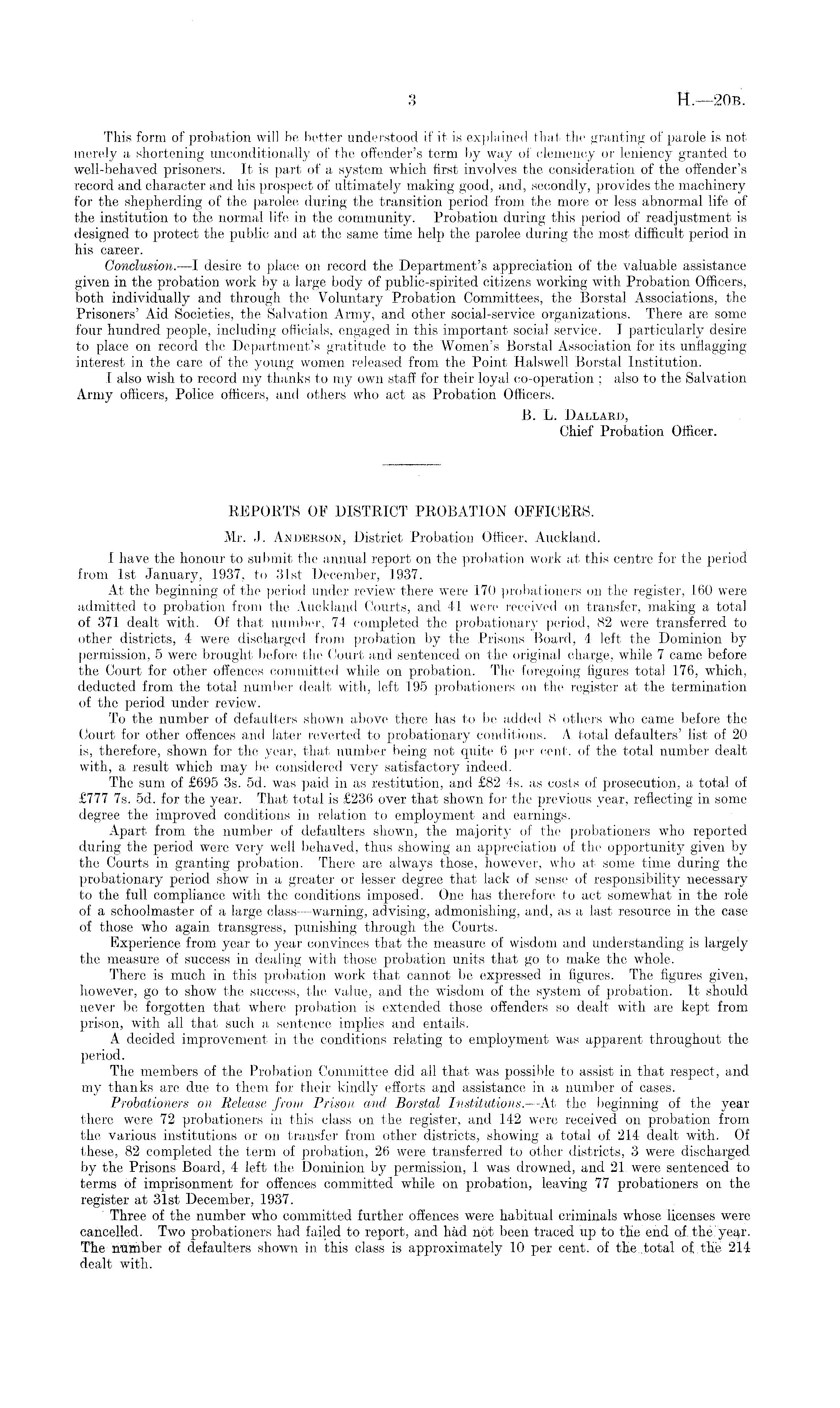REPORTS OF DISTRICT PROBATION OFFICERS. Mr. J. Anderson, District Probation Officer, Auckland. I have the honour to submit the annual report on the probation work at this centre for the period from Ist January, 1937, to 31st December, 1937. At the beginning of the period under review there were 170 probationers on the register, 160 were admitted to probation from the Auckland Courts, and 41 were received on transfer, making a total of 371 dealt with. Of that number, 74 completed the probationary period, 82 were transferred to other districts, 4 were discharged from probation by the Prisons Board, 4 left the Dominion by permission, 5 were brought before the Court and sentenced on the original charge, while 7 came before the Court for other offences committed while on probation. The foregoing figures total 176, which, deducted from the total number dealt with, left 195 probationers on the register at the termination of the period under review. To the number of defaulters shown above there has to be added 8 others who came before the Court for other offences and later reverted to probationary conditions. A total defaulters' list of 20 is, therefore, shown for the year, that number being not quite 6 per cent, of the total number dealt with, a result which may be considered very satisfactory indeed. The sum of £695 3s. sd. was paid in as restitution, and £82 4s. as costs of prosecution, a total of £777 7s. sd. for the year. That total is £236 over that shown for the previous year, reflecting in some degree the improved conditions in relation to employment and earnings. Apart from the number of defaulters shown, the majority of the probationers who reported during the period were very well behaved, thus showing an appreciation of the opportunity given by the Courts in granting probation. There are always those, however, who at some time during the probationary period show in a greater or lesser degree that lack of sense of responsibility necessary to the full compliance with the conditions imposed. One has therefore to act somewhat in the role of a schoolmaster of a large class —warning, advising, admonishing, and, as a last resource in the case of those who again transgress, punishing through the Courts. Experience from year to year convinces that the measure of wisdom and understanding is largely the measure of success in dealing with those probation units that go to make the whole. There is much in this probation work that cannot be expressed in figures. The figures given, however, go to show the success, the value, and the wisdom of the system of probation. It should never be forgotten that where probation is extended those offenders so dealt with are kept from prison, with all that such a sentence implies and entails. A decided improvement in the conditions relating to employment was apparent throughout the period. The members of the Probation Committee did all that was possible to assist in that respect, and my thanks are due to them for their kindly efforts and assistance in a number of cases. Probationers on Release from Prison and Borstal Institutions.—At the beginning of the year there were 72 probationers in this class on the register, and 142 were received on probation from the various institutions or on transfer from other districts, showing a total of 214 dealt with. Of these, 82 completed the term of probation, 26 were transferred to other districts, 3 were discharged by the Prisons Board, 4 left the Dominion by permission, 1 was drowned, and 21 were sentenced to terms of imprisonment for offences committed while on probation, leaving 77 probationers on the register at 31st December, 1937. Three of the number who committed further offences were habitual criminals whose licenses were cancelled. Two probationers had failed to report, and had not been traced up to the end of the year. The number of defaulters shown in this class is approximately 10 per cent, of the. total of .the 214 dealt with.