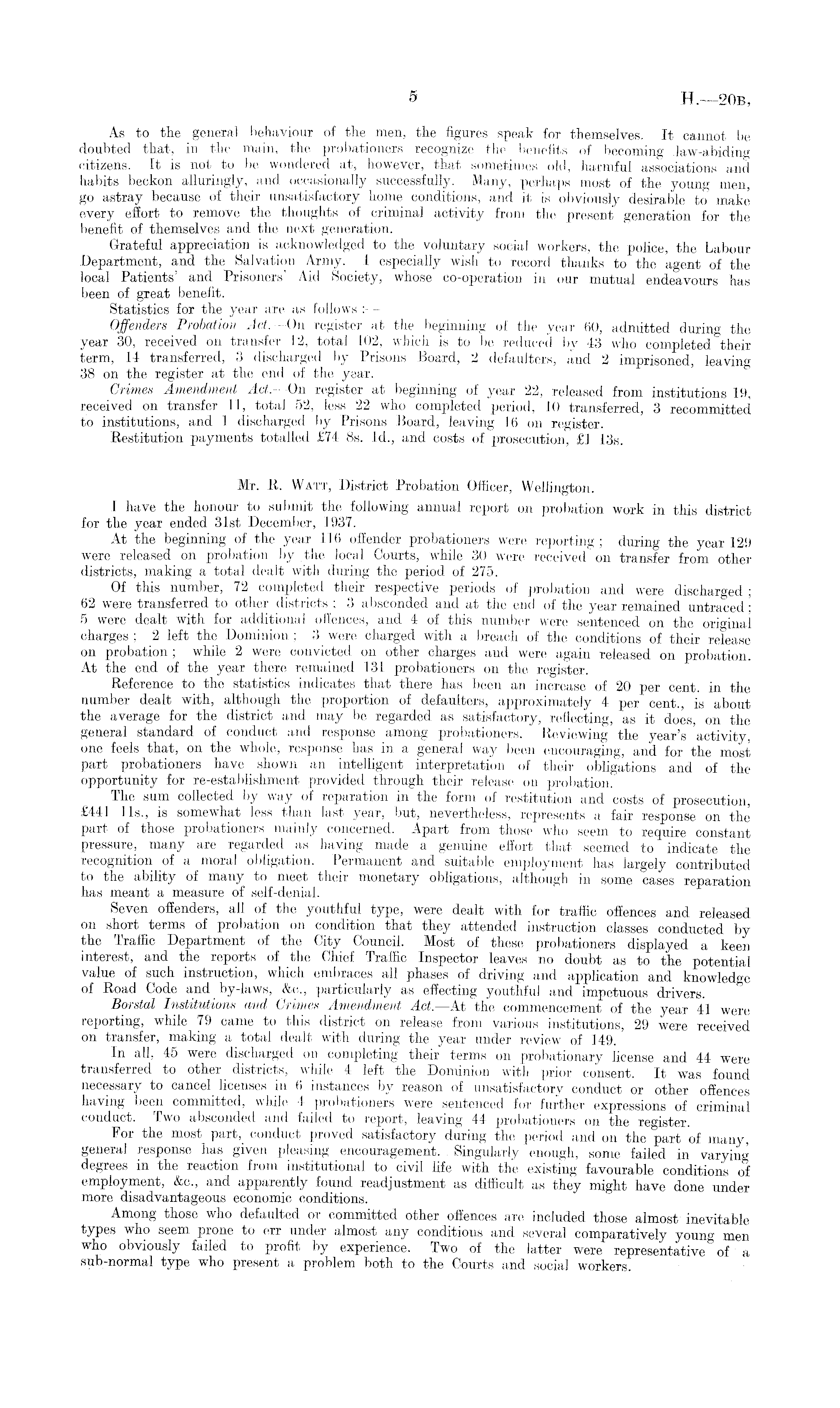 As to the general behaviour of the men, the figures speak for themselves. It cannot be doubted that, in the main, the probationers recognize the benefits of becoming law-abiding citizens. It is not to be wondered at, however, that sometimes old, harmful associations and habits beckon alluringly, and occasionally successfully. Many, perhaps most of the young men, go astray because of their unsatisfactory home conditions, and it is obviously desirable to make every effort to remove the thoughts of criminal activity from the present generation for the benefit of themselves and the next generation. Grateful appreciation is acknowledged to the voluntary social workers, the police, the Labour Department, and the Salvation Army. I especially wish to record thanks to the agent of the local Patients' and Prisoners' Aid Society, whose co-operation in our mutual endeavours has been of great benefit. Statistics for the year are as follows : — Offenders Probation Act.—On register at the beginning of the year 60, admitted during the year 30, received on transfer 12, total 102, which is to be reduced by 43 who completed their term, 14 transferred, 3 discharged by Prisons Board, 2 defaulters, and 2 imprisoned, leaving 38 on the register at the end of the year. Grimes Amendment Act. —On register at beginning of year 22, released from institutions 19, received on transfer 11, total 52, less 22 who completed period, 10 transferred, 3 recommitted to institutions, and 1 discharged by Prisons Board, leaving 16 on register. Restitution payments totalled £74 Bs. Id., and costs of prosecution, £1 13s. Mr. R. Watt, District Probation Officer, Wellington. I have the honour to submit the following annual report on probation work in this district for the year ended 31st December, 1937. At the beginning of the year 116 offender probationers were reporting ; during the year 129 were released on probation by the local Courts, while 30 were received on transfer from other districts, making a total dealt with during the period of 275. Of this number, 72 completed their respective periods of probation and were discharged ; 62 were transferred to other districts ; 3 absconded and at the end of the year remained untraced • 5 were dealt with for additional offences, and 4 of this number were sentenced on the original charges ; 2 left the Dominion ; 3 were charged with a breach of the conditions of their release on probation ; while 2 were convicted on other charges and were again released on probation. At the end of the year there remained 131 probationers on the register. Reference to the statistics indicates that there has been an increase of 20 per cent, in the number dealt with, although the proportion of defaulters, approximately 4 per cent., is about the average for the district and may be regarded as satisfactory, reflecting, as it does, on the general standard of conduct and response among probationers. Reviewing the year's 'activity, one feels that, on the whole, response has in a general way been encouraging, and for the most part probationers have shown an intelligent interpretation of their obligations and of the opportunity for re-establishment provided through their release on probation. The sum collected by way of reparation in the form of restitution and costs of prosecution, £441 lis., is somewhat less than last year, but, nevertheless, represents a fair response on the part of those probationers mainly concerned. Apart from those who seem to require constant pressure, many are regarded as having made a genuine eflort that seemed to indicate the recognition of a moral obligation. Permanent and suitable employment has largely contributed to the ability of many to meet their monetary obligations, although in some cases reparation has meant a measure of self-denial. Seven offenders, all of the youthful type, were dealt with for traffic offences and released on short terms of probation on condition that they attended instruction classes conducted by the Traffic Department of the City Council. Most of these probationers displayed a keen interest, and the reports of the Chief Traffic Inspector leaves no doubt as to the potential value of such instruction, which embraces all phases of driving and application and knowledge of Road Code and by-laws, &c., particularly as effecting youthful and impetuous drivers. Borstal Institutions and Crimes Amendment Act.—At the commencement of the year 41 were reporting, while 79 came to this district on release from various institutions, 29 were received on transfer, making a total dealt with during the year under review of 149. In all, 45 were discharged on completing their terms on probationary license and 44 were transferred to other districts, while 4 left the Dominion with prior consent. It was found necessary to cancel licenses in 6 instances by reason of unsatisfactory conduct or other offences having been committed, while 4 probationers were sentenced for further expressions of criminal conduct. Two absconded and failed to report, leaving 44 probationers on the register. For the most part, conduct proved satisfactory during the period and on the part of many, general response has given pleasing encouragement. Singularly enough, some failed in varying degrees in the reaction from institutional to civil life with the existing favourable conditions of employment, &c., and apparently found readjustment as difficult as they might have done under more disadvantageous economic conditions. Among those who defaulted or committed other offences are included those almost inevitable types who seem prone to err under almost any conditions and several comparatively young men who obviously failed to profit by experience. Two of the latter were representative °of a sub-normal type who present a problem both to the Courts and social workers.