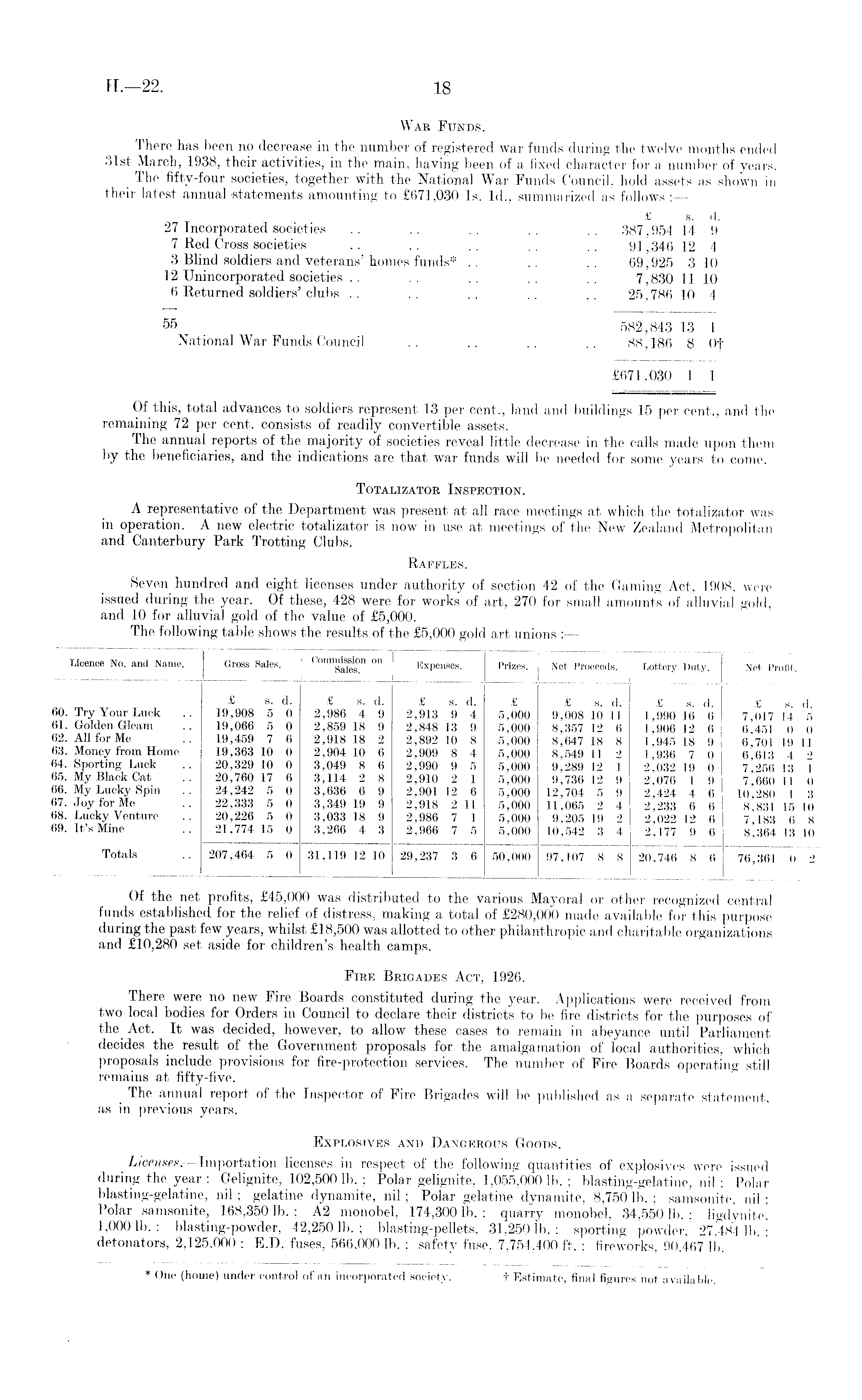 War Funds. There has been no decrease in the number of registered war funds during the twelve months ended 31st March, 1938, their activities, in the main, having been of a fixed character for a number of years. Ihe fifty-four societies, together with the National War Funds Council, hold assets as shown in their latest annual «tatements amounting to £671,030 Is. Id., summarized as follows : — £ s. d. 27 Incorporated societies .. .. .. .. .. 387,954 14 9 7 Red Cross societies .. .. .. .. .. 91,346 12 4 3 Blind soldiers and veterans' homes funds* . . . . . . 69,925 310 12 Unincorporated societies . . . . . . . . . . 7,830 11 10 6 Returned soldiers' clubs .. .. .. .. .. 25,786 10 4 S5 582,843 13 1 National War Funds Council .. .. .. .. 88,186 BOf £671,030 1 1 Of this, total advances to soldiers represent 13 per cent., land and buildings 15 per cent., and the remaining 72 per cent, consists of readily convertible assets. The annual reports of the majority of societies reveal little decrease in the calls made upon them by the beneficiaries, and the indications are that war funds will be needed for some years to come. Totalizator Inspection. A representative of the Department was present at all race meetings at which the totalizator was in operation. A new electric totalizator is now in use at meetings of the New Zealand Metropolitan and Canterbury Park Trotting Clubs. Raffles. Seven hundred and eight licenses under authority of section 42 of the Gaming Act, 1908, were issued during the year. Of these, 428 were for works of art, 270 for small amounts of alluvial gold, and 10 for alluvial gold of the value of £5,000. The following table shows the results of the £5,000 gold art unions :—